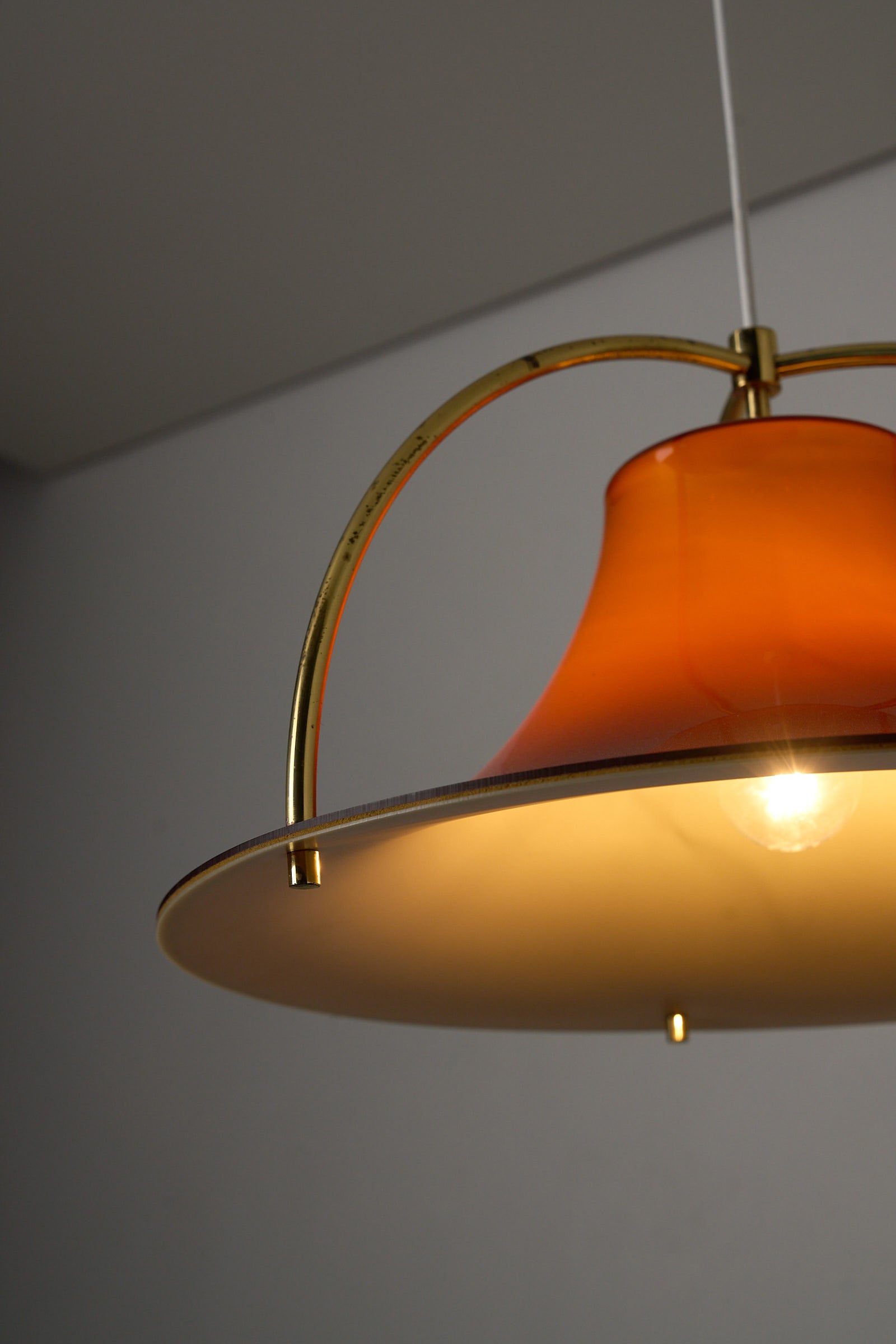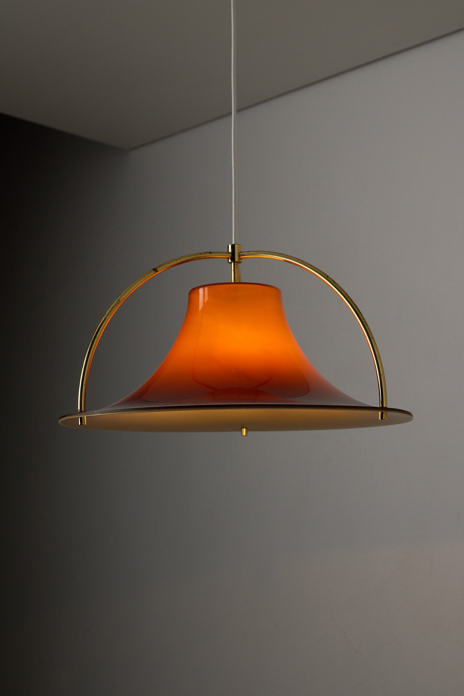 Original 1970s “Single” ceiling pendant designed by Jo Hammerborg for Fog & Mørup, Denmark. This example features a caramel-brown acrylic shade supported by brass-finished arches, an iconic combination from Hammerborg’s refined design language. The lamp produces a soft, diffused glow—ideal for dining tables, living rooms, or lounge spaces.