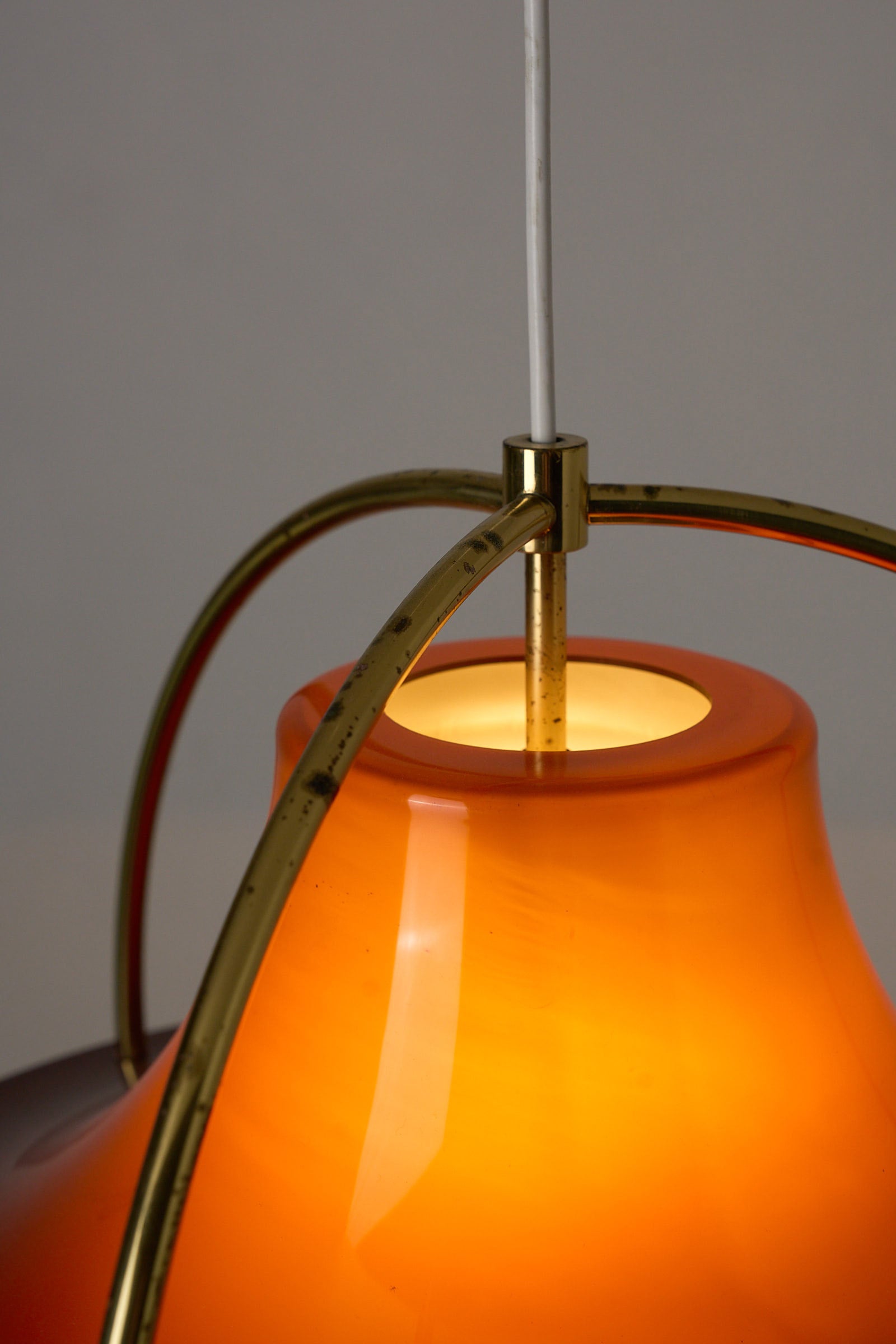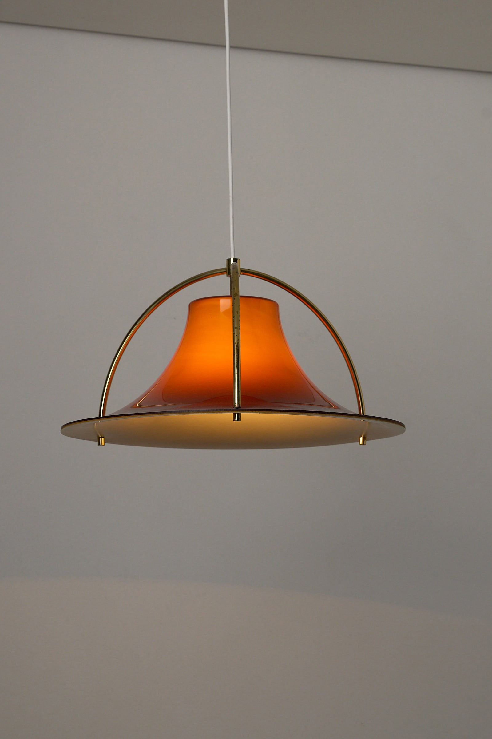 Fog & Mørup “Single” Pendant Lamp by Jo Hammerborg, 1970s with a caramel brown shade and brass arches.