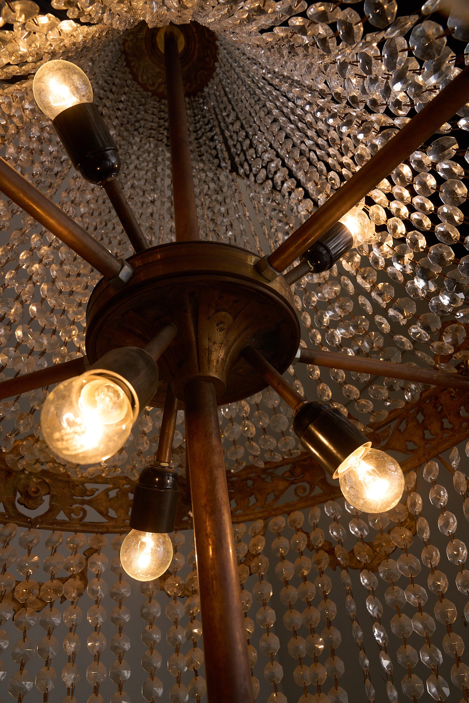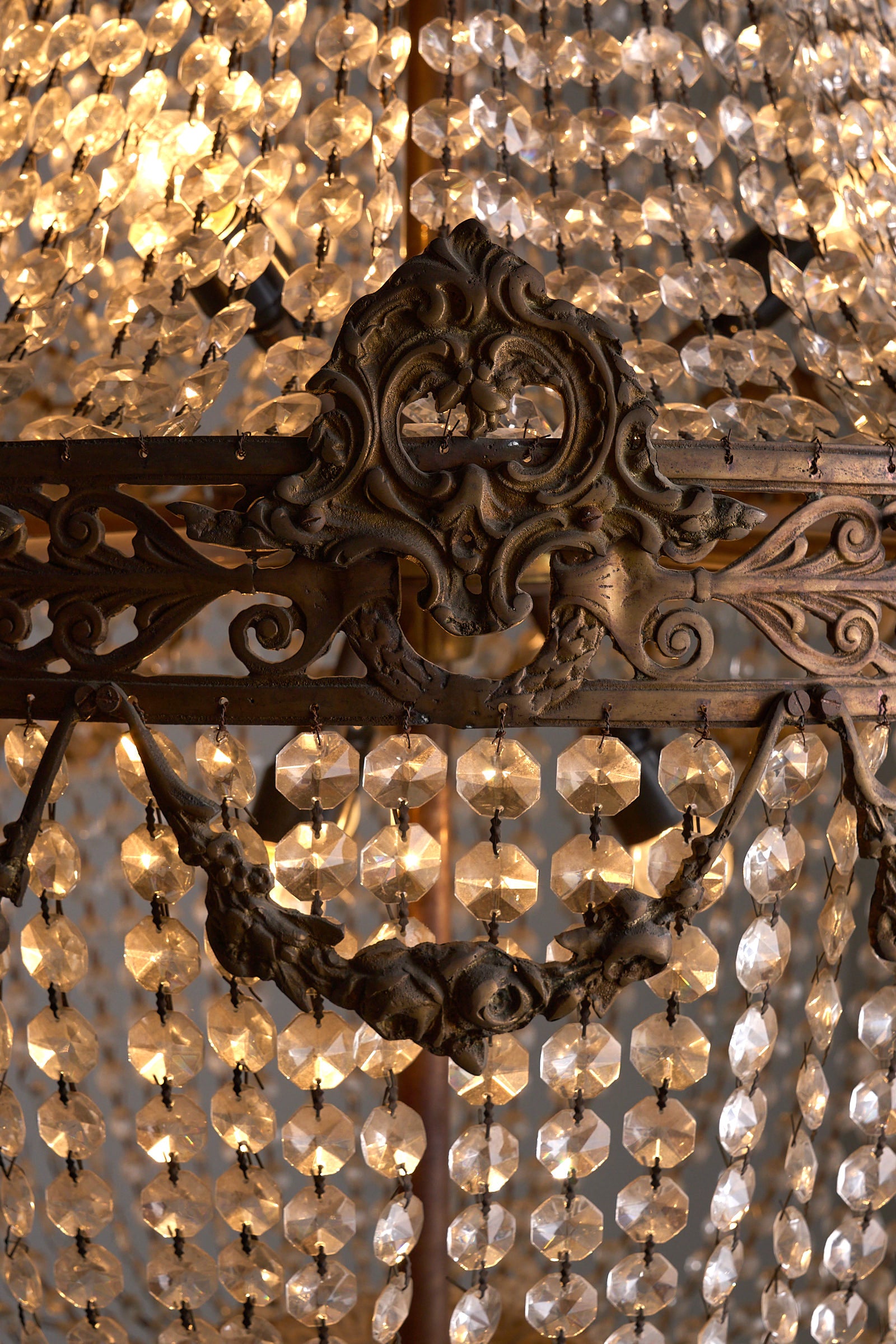 Its proportions and luxurious construction reflect the style transitions of the late 19th / early 20th century — a lineage from Louis XVI revival through Empire / Neoclassical revival trends prevalent in France, Belgium, and Central Europe. The use of cast bronze, decorative motifs, and crystal drapery link it to salons, ballrooms, and period interior décor.