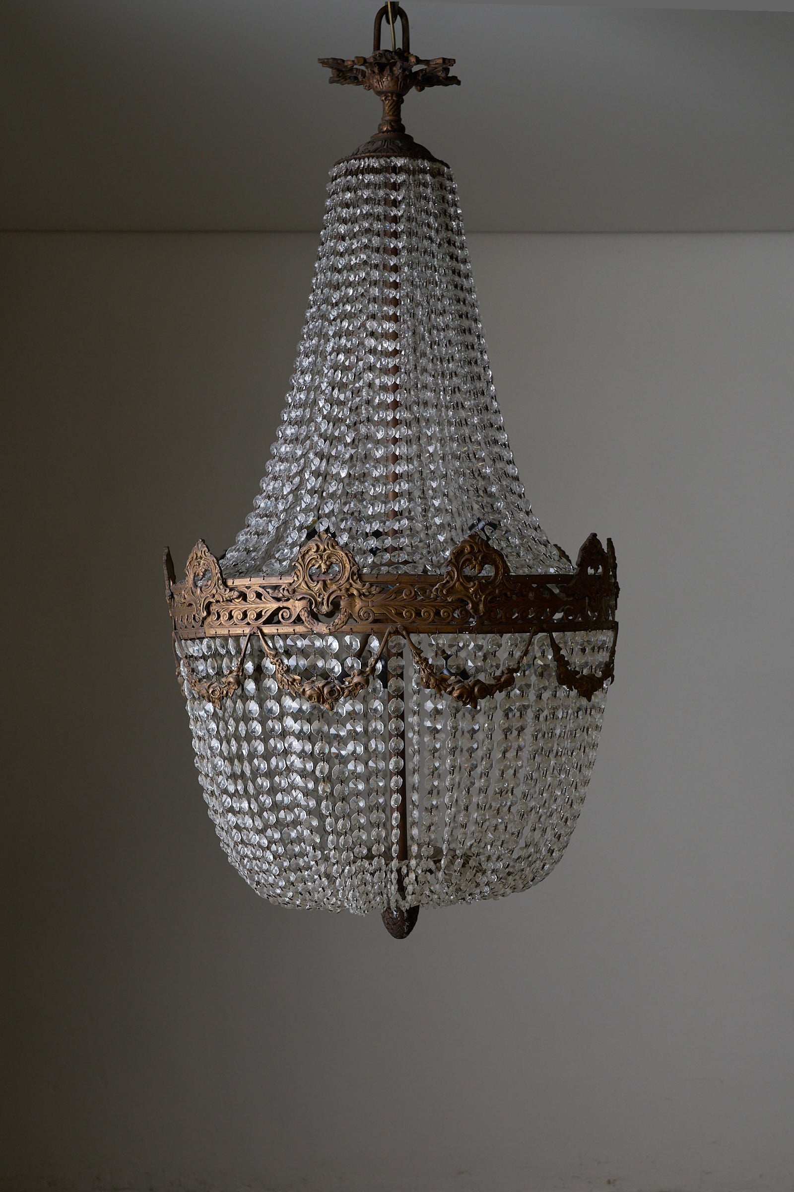 Early-20th-century 'sac-à-perles' crystal chandelier with gilt bronze detailing, dramatic presence, timeless elegance.