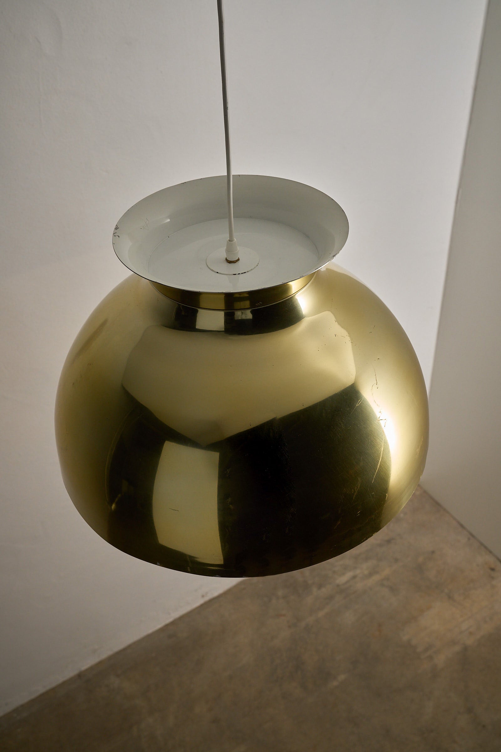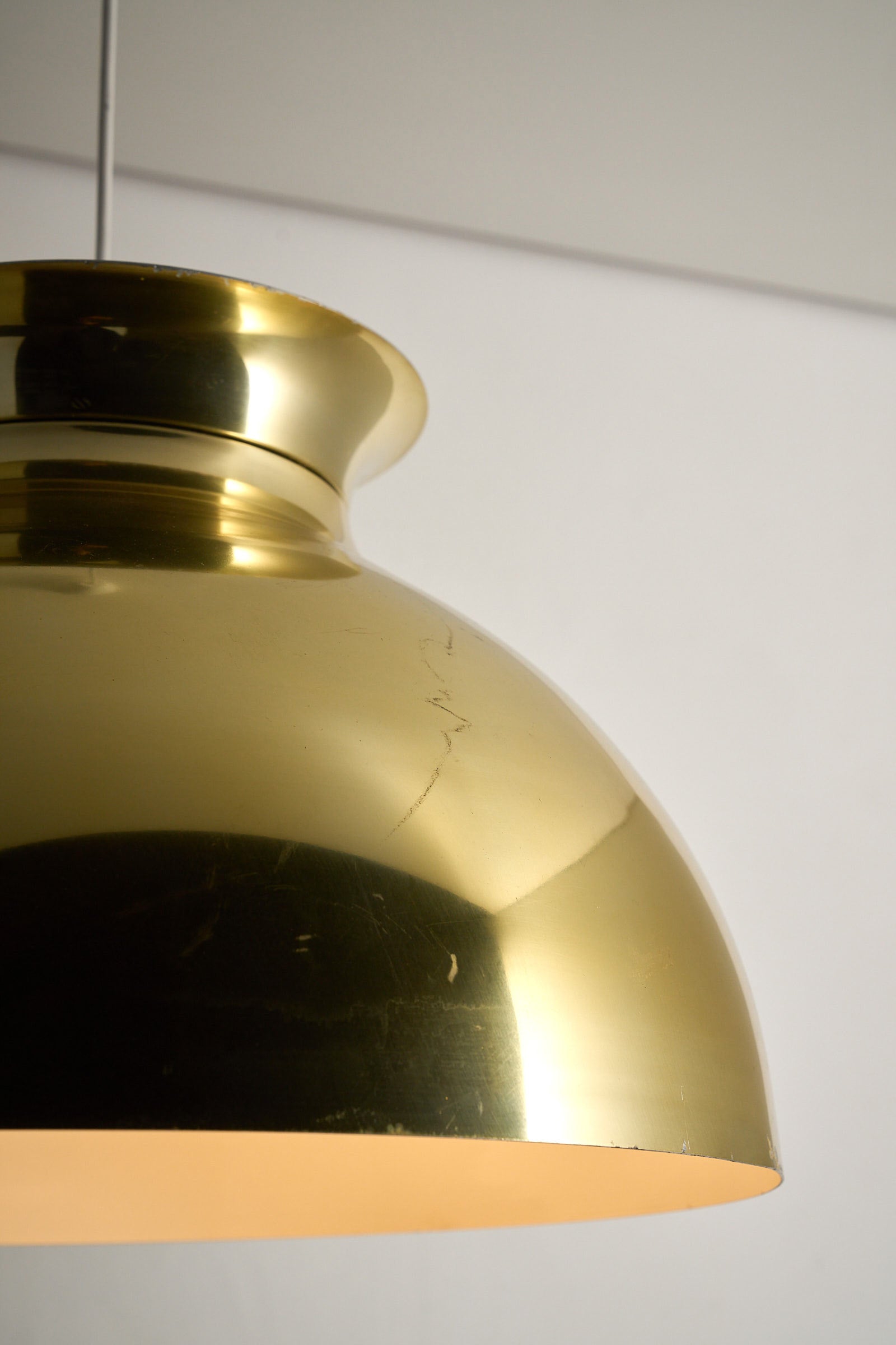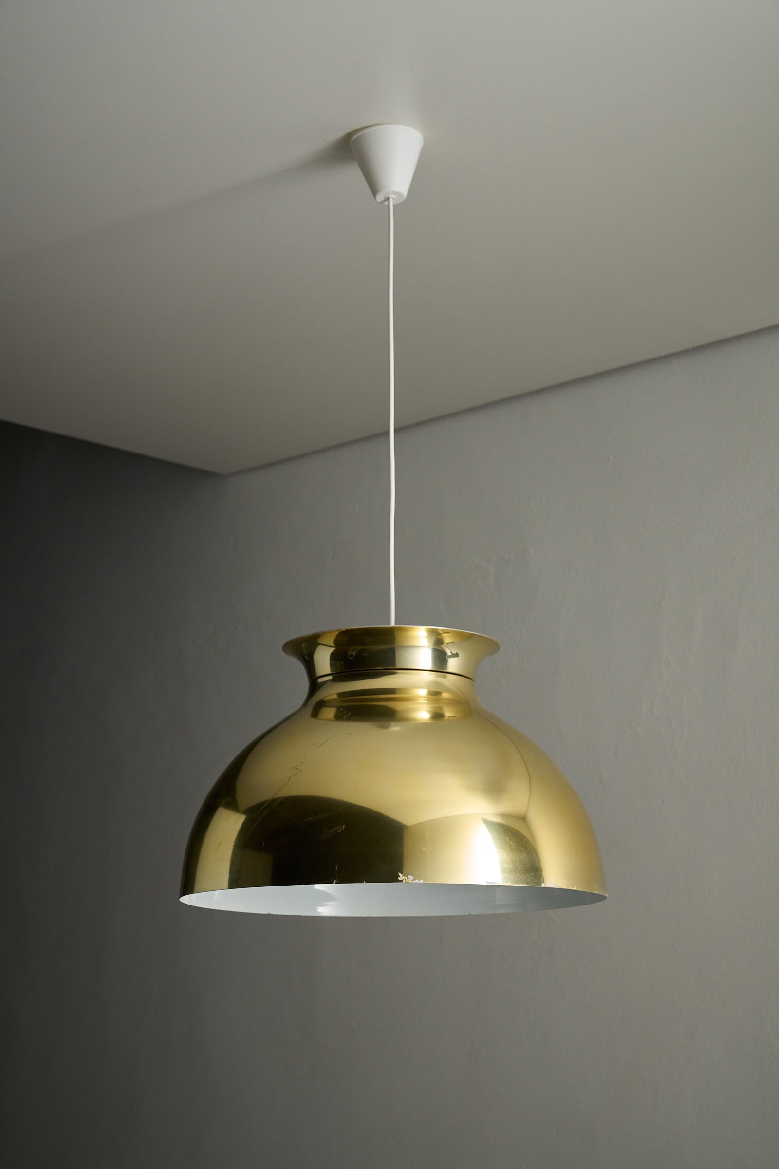 Large ceiling pendant with a polished brass shade and white interior. The domed form creates an even, downward light. Suspended from a white cable and canopy.