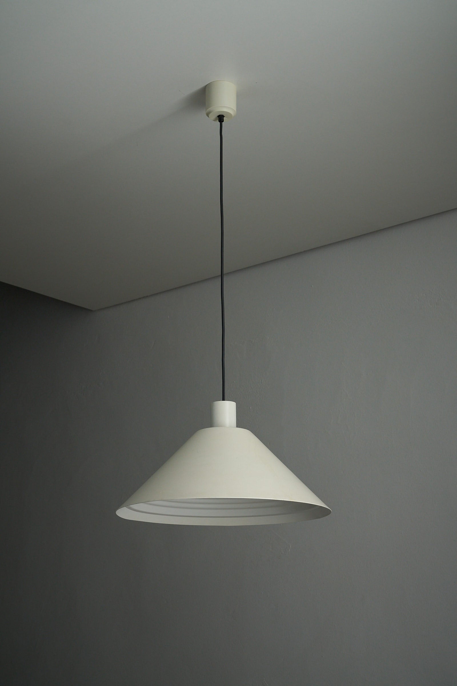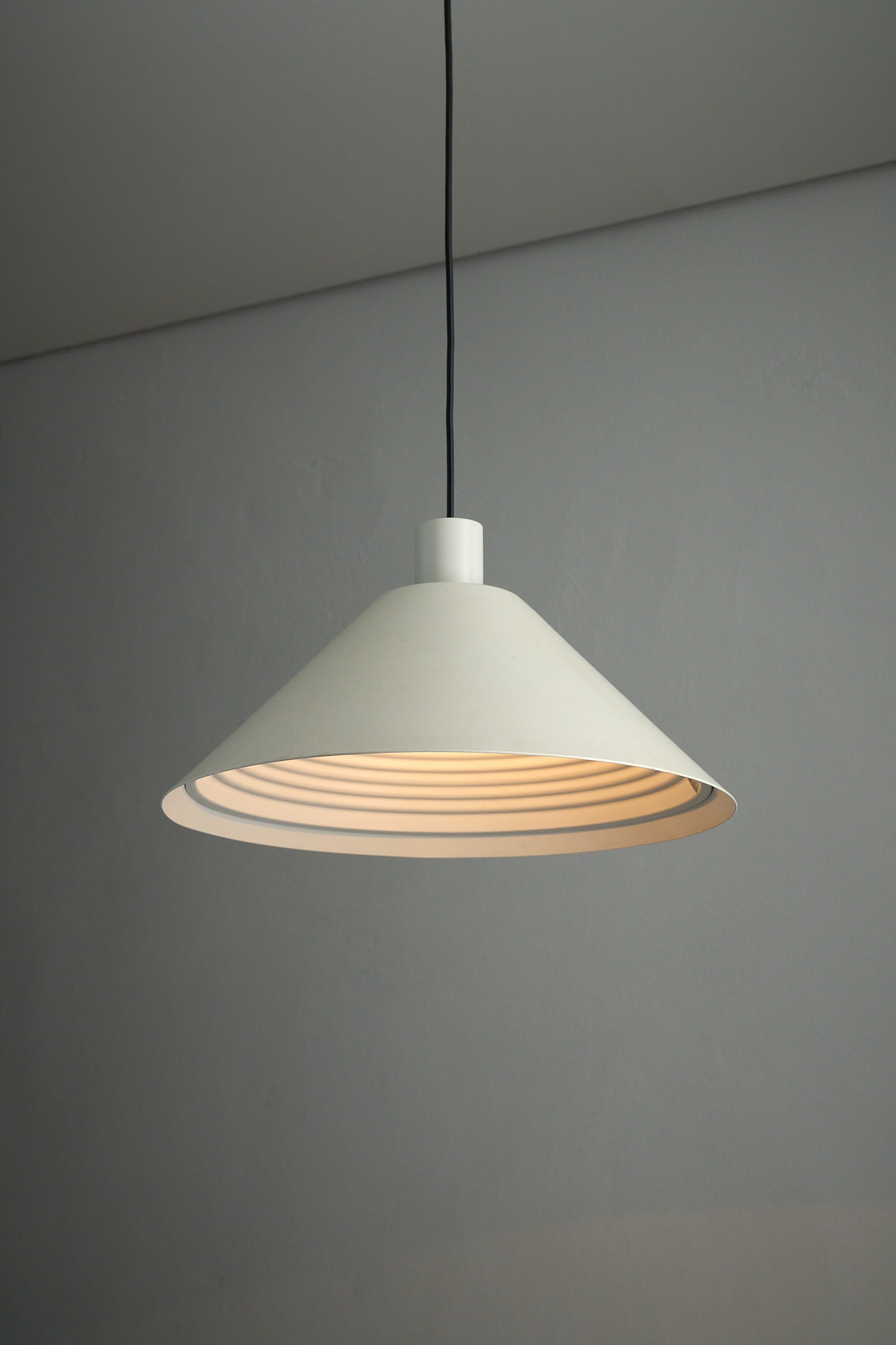 The fixture is defined by its layered construction, featuring two white metal shades. The outer shade is smooth and broadly conical, while the inner shade is composed of a ribbed or concentric ring structure. This dual-layer system manages light distribution, ensuring a diffused, even glow from the ribbed interior while directing functional illumination downward. The simple, geometric form represents classic Italian Modernist design from the 1970s. The original manufacturer label is intact.