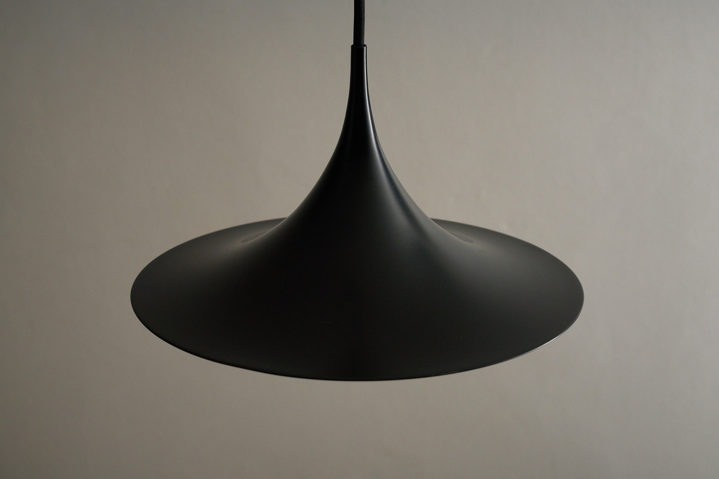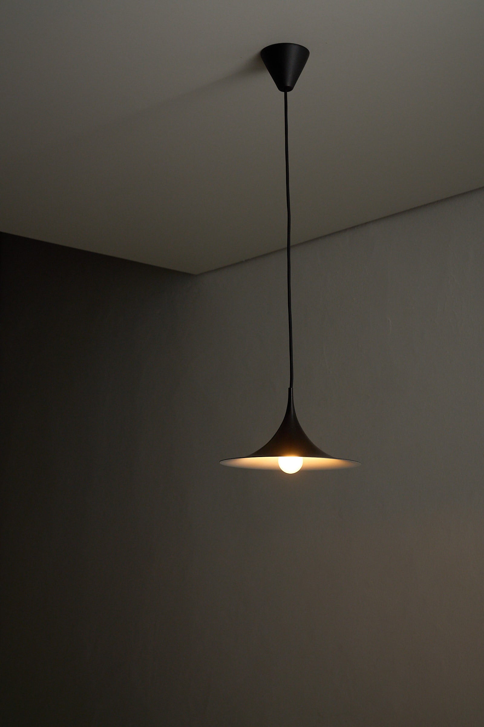 Small black enamel pendant lamp designed by Claus Bonderup and Torsten Thorup for Fog & Mørup in 1967. The semi-pendant lamp has a beautiful refined and organic shape, where the lamp flows into the woven cord. The outside is black and the inside is white for an optimal light effect.