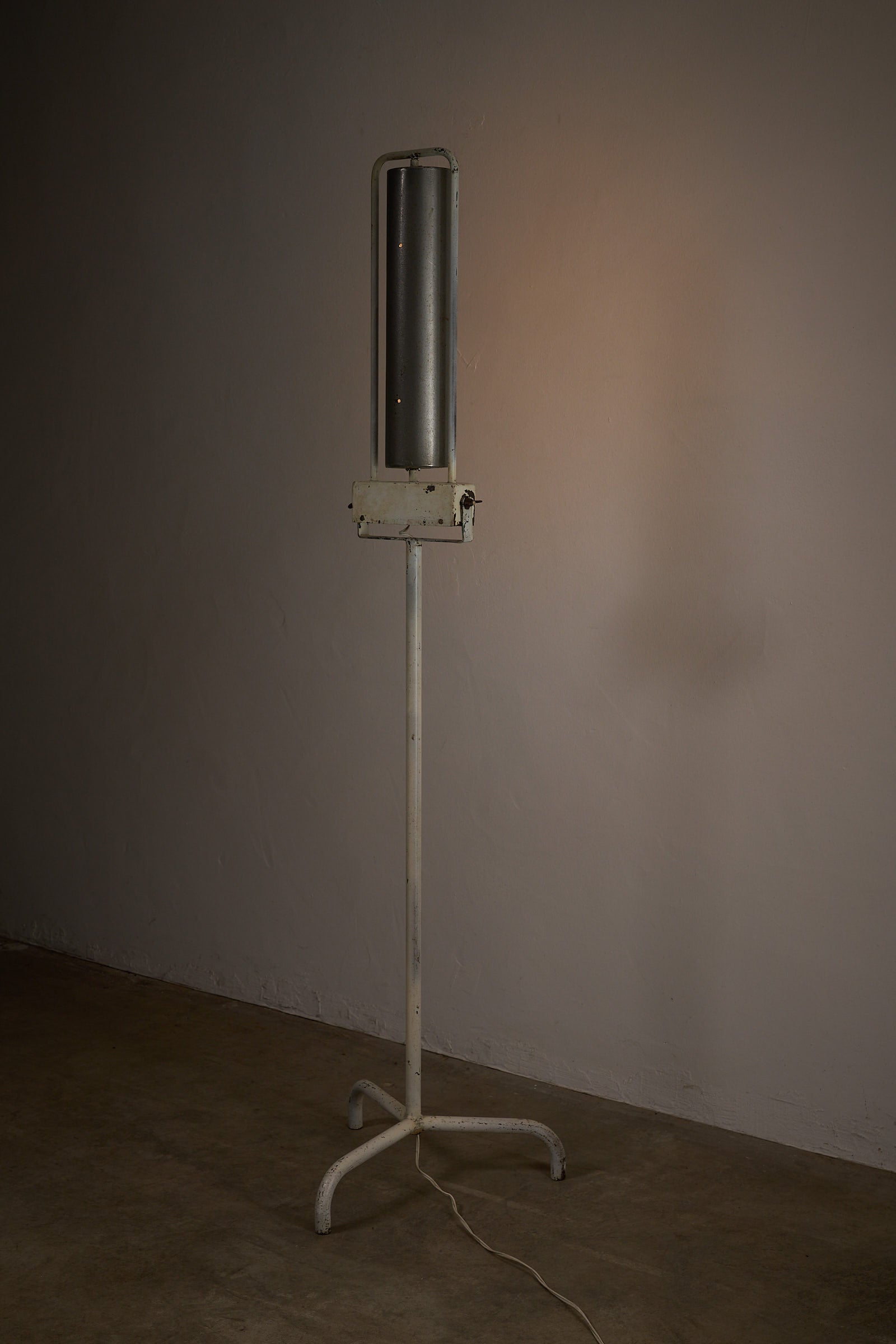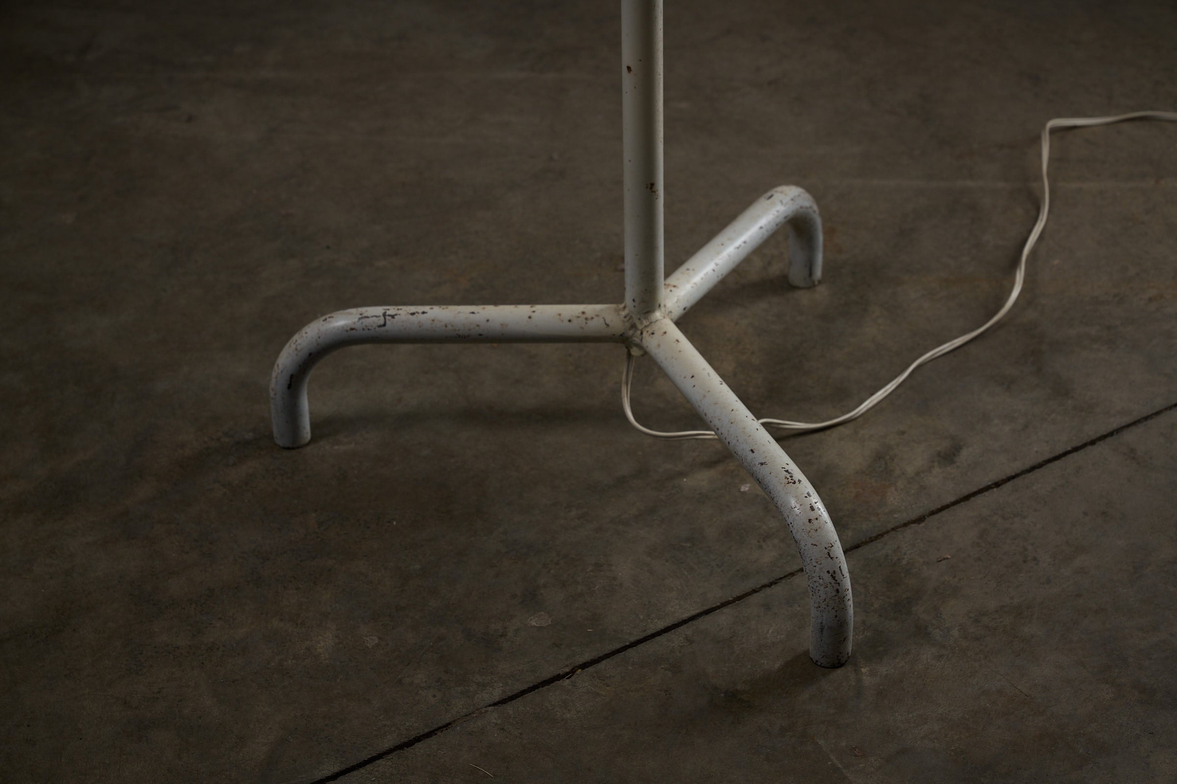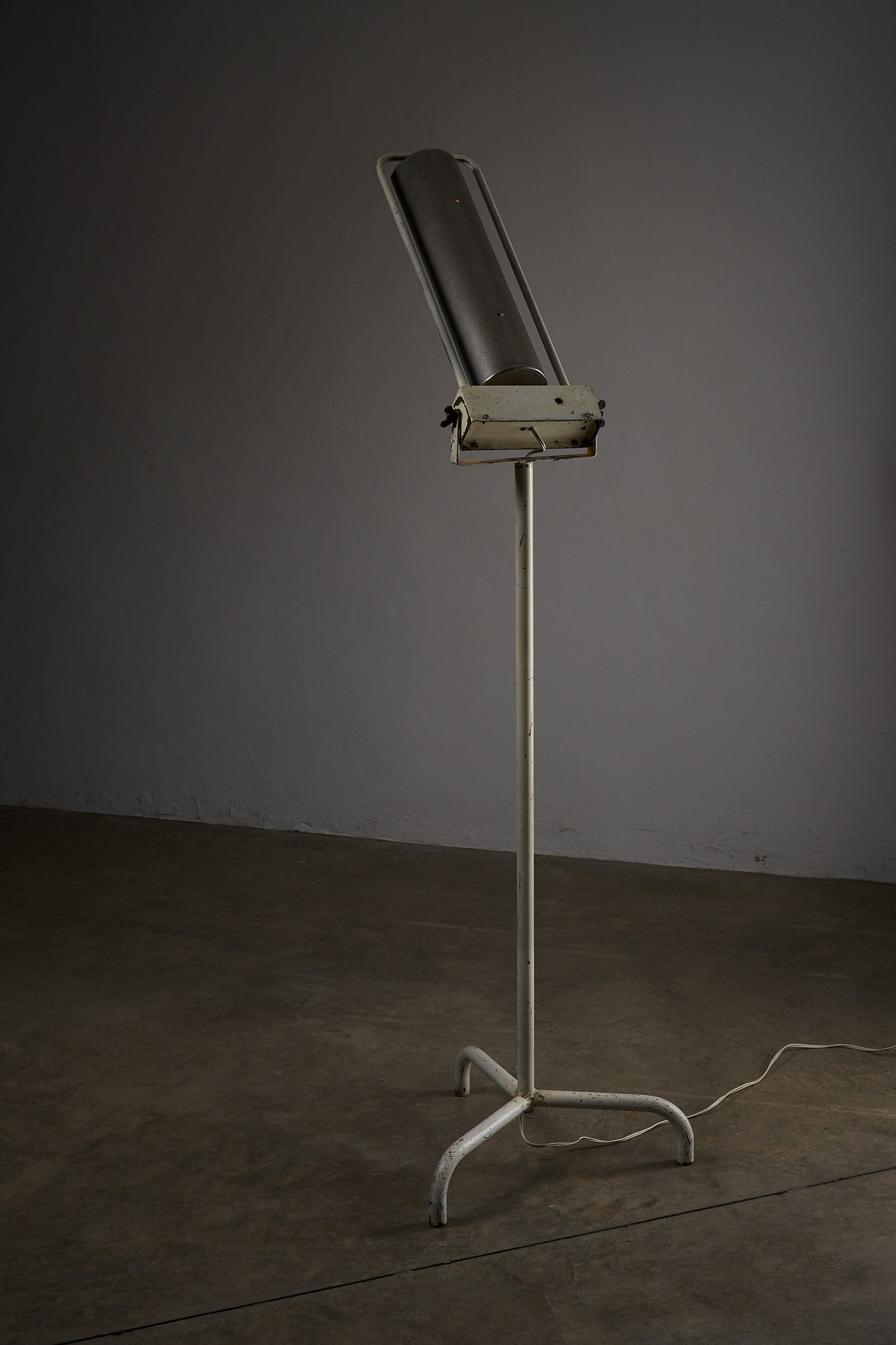 Industrial floor lamp originally designed for medical or laboratory use, crafted in enameled steel with a tubular reflector and three-legged base. The functional geometry and raw finish capture the honest utility of mid-century industrial design.