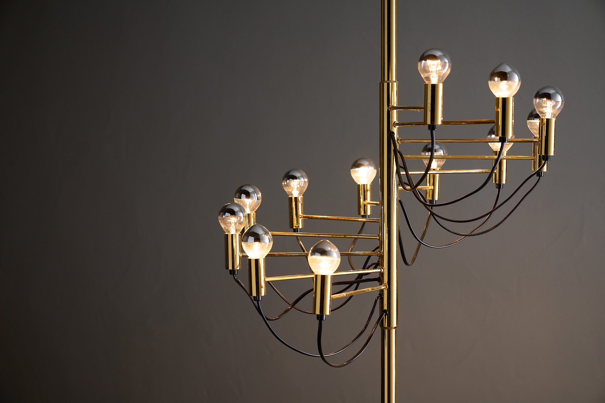 A large, sculptural floor lamp executed in the design language of Gino Sarfatti, featuring a central column in polished brass and multiple radial light arms.