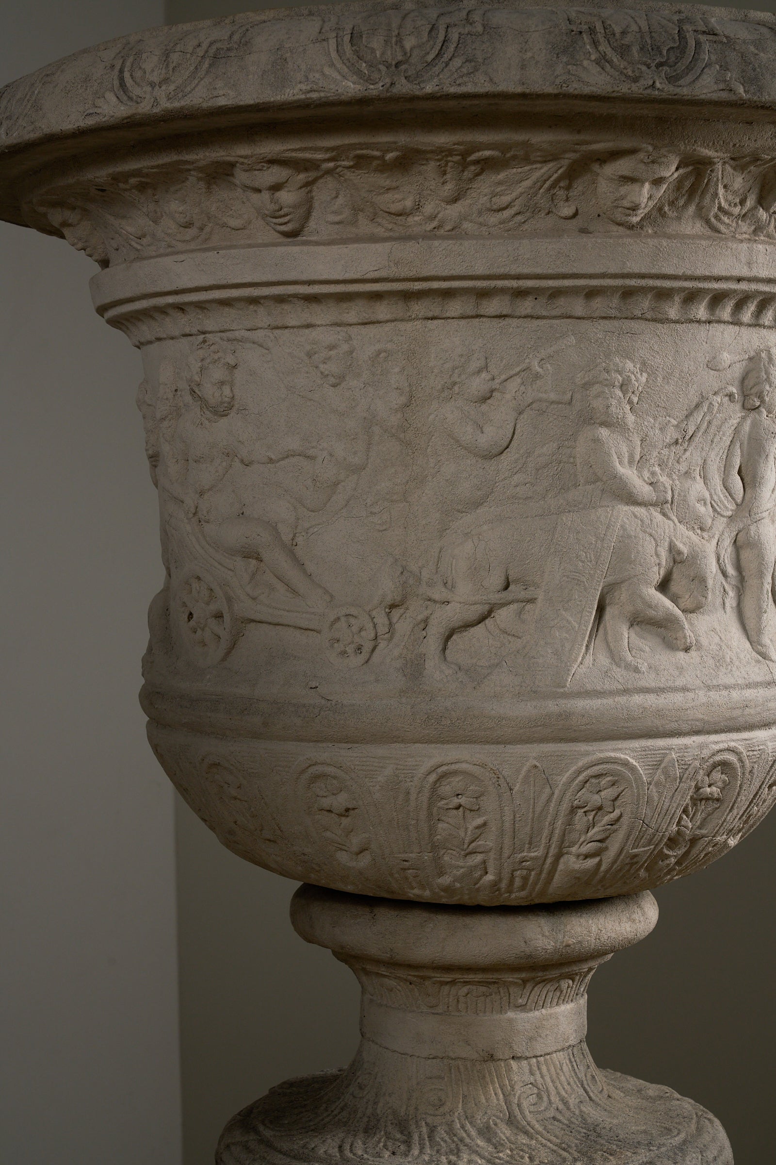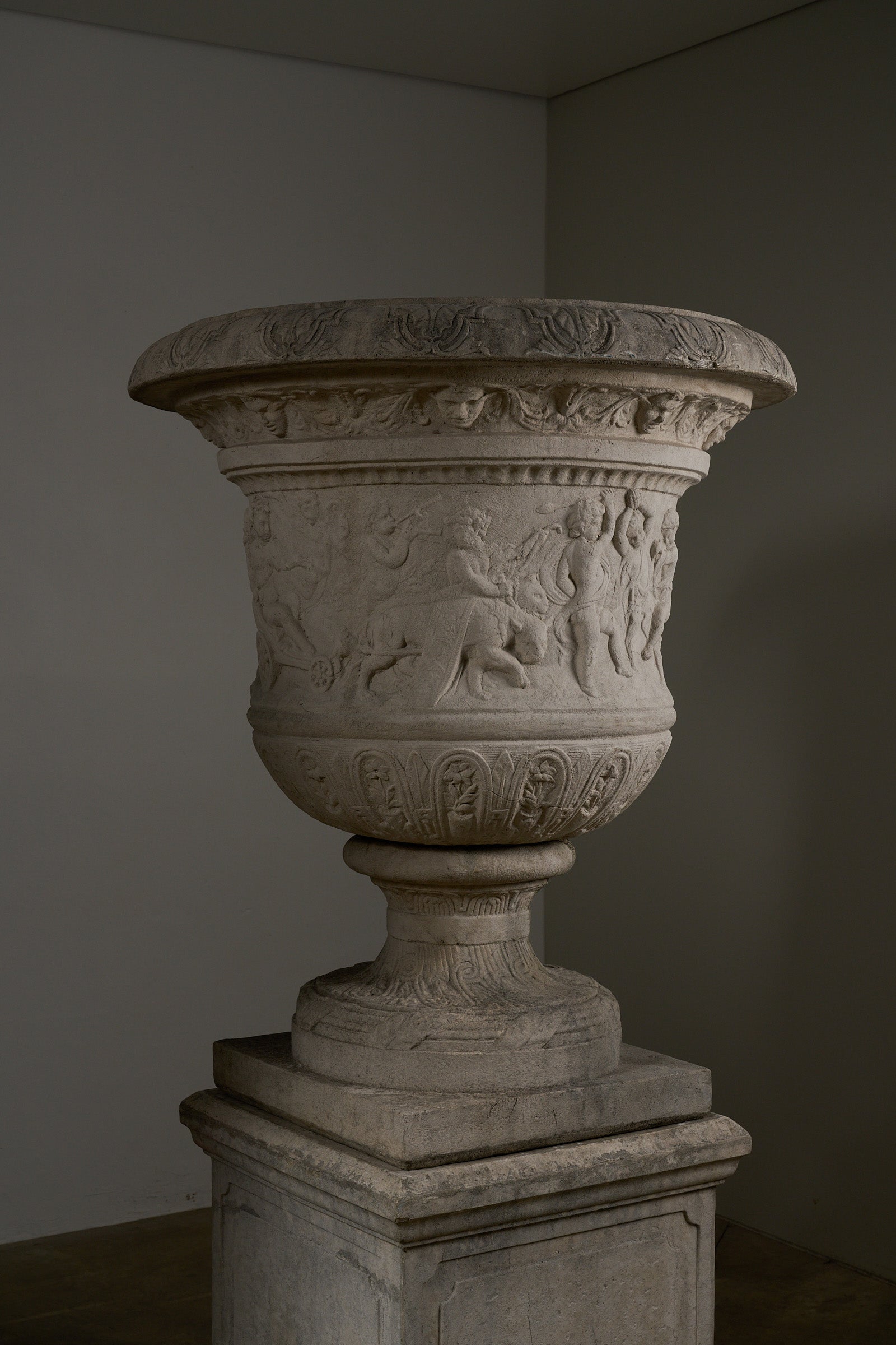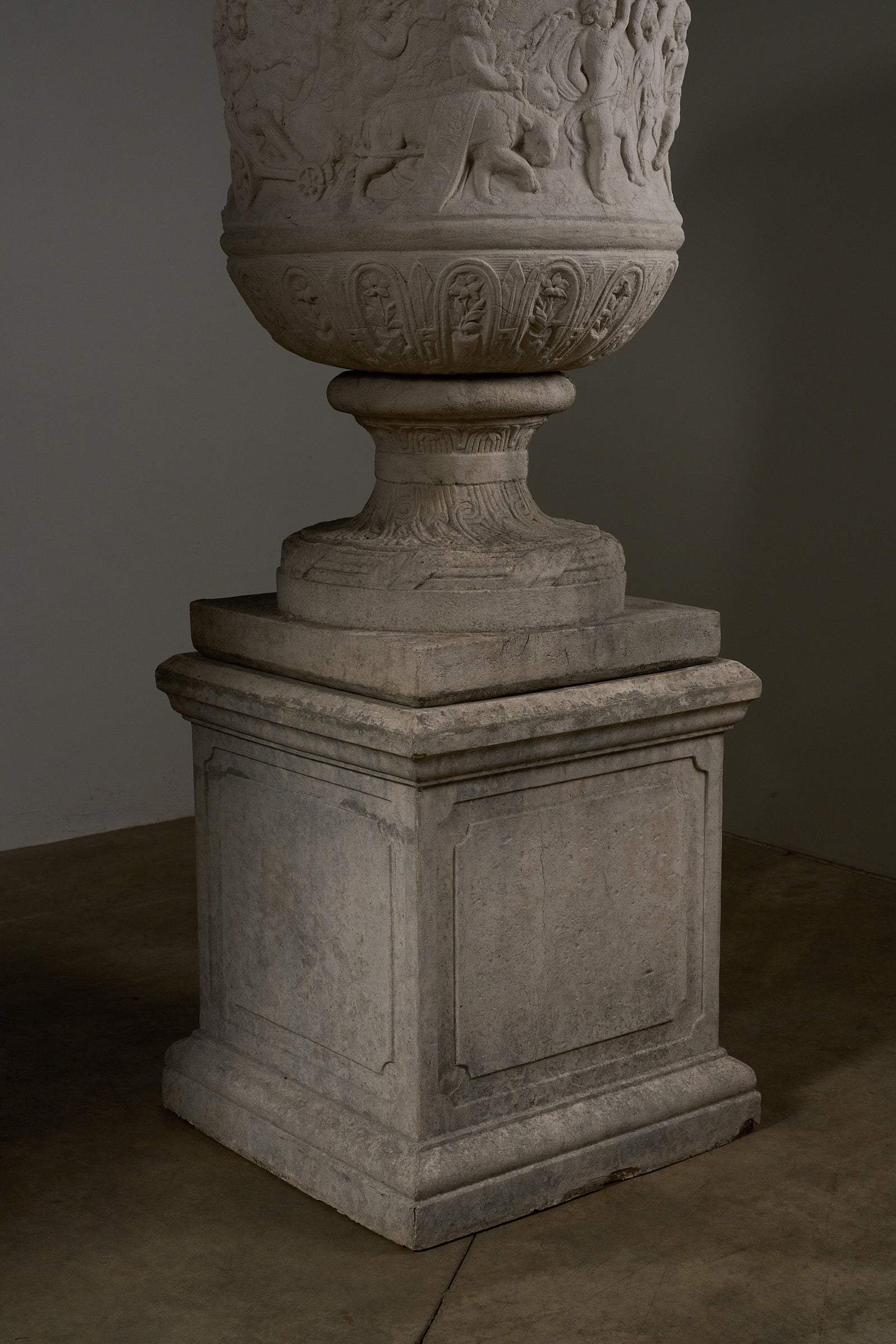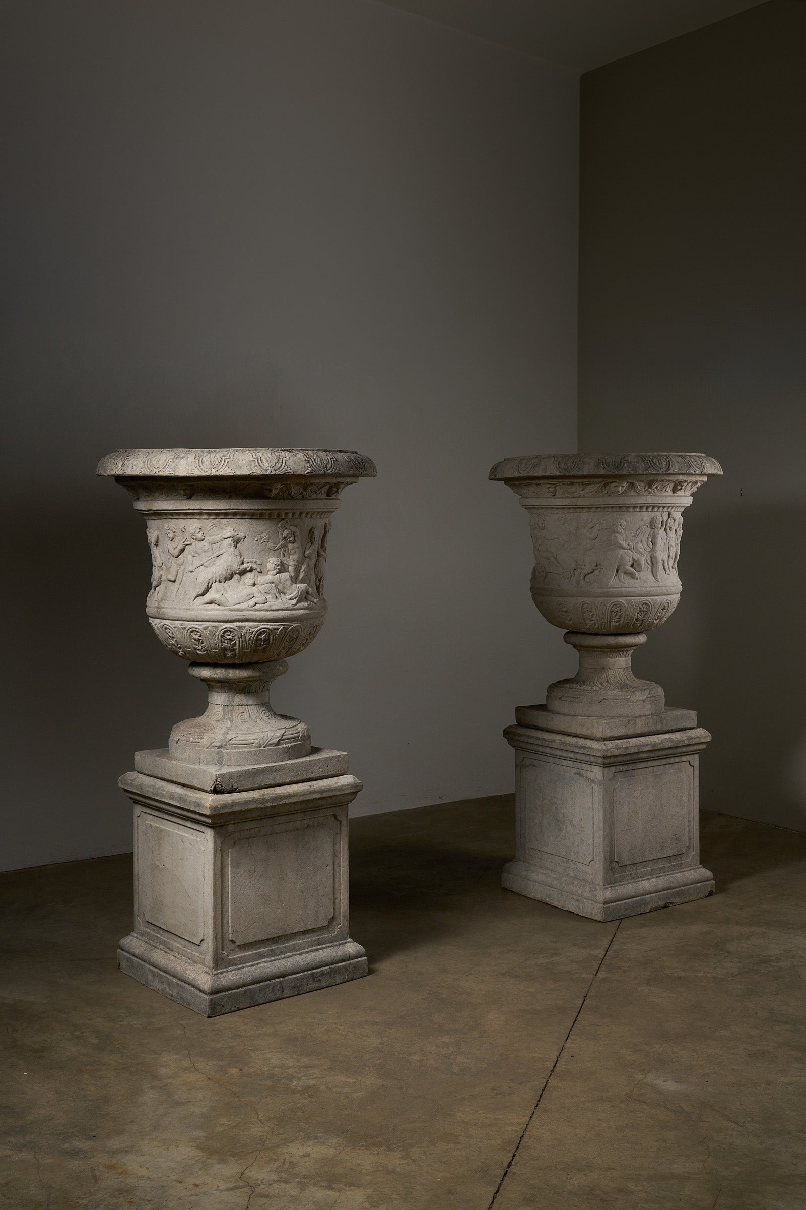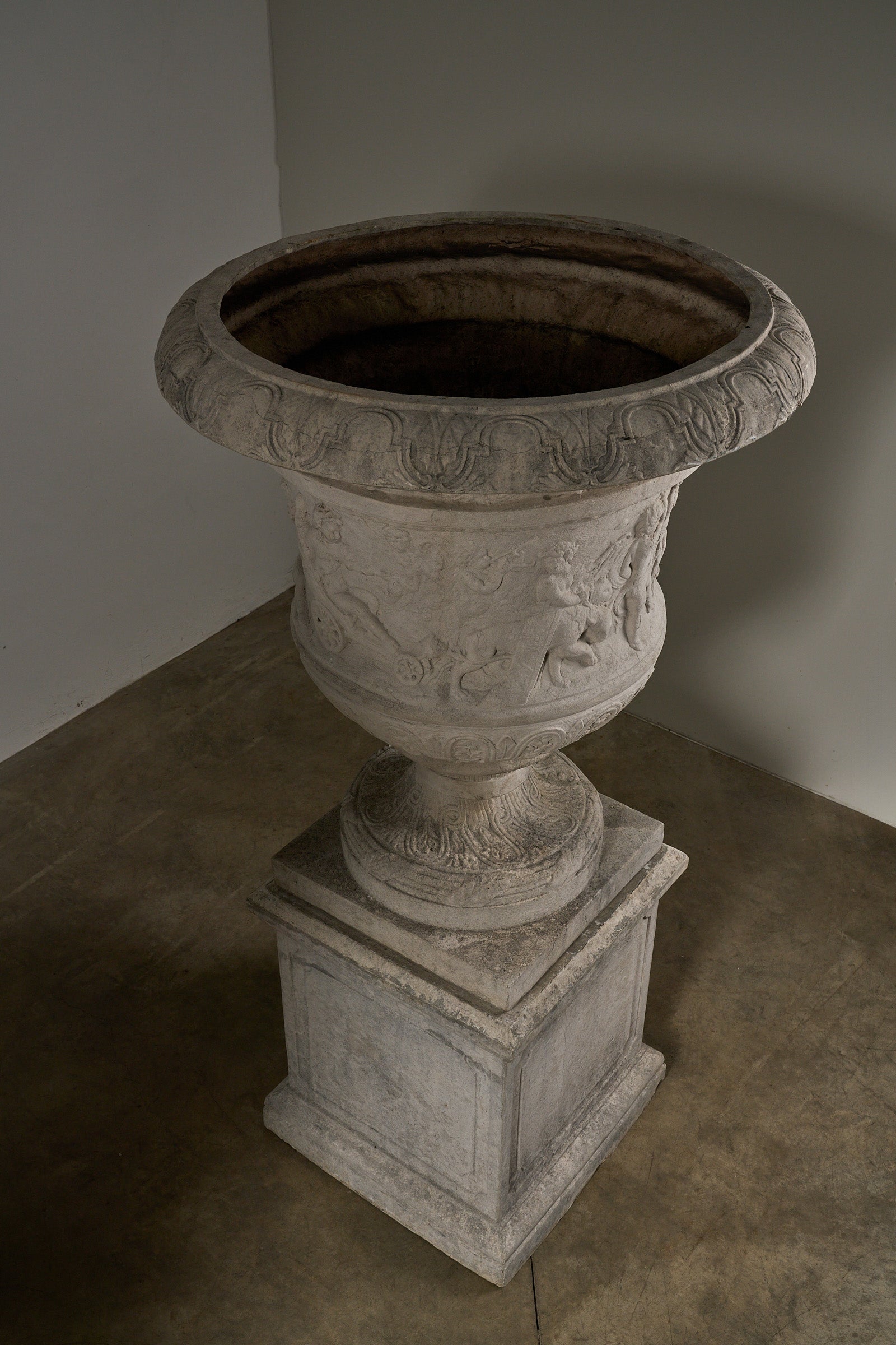Large pair of garden vases composed of large campana-form urns resting on matching square pedestals. The exterior is defined by a continuous high-relief frieze depicting a playful Bacchanalian procession of putti riding panthers, pulling chariots, and playing musical instruments.