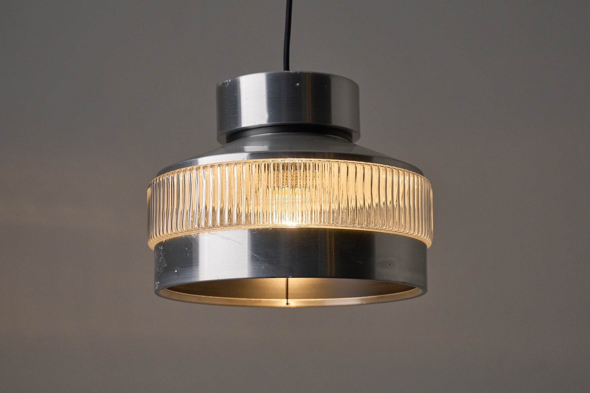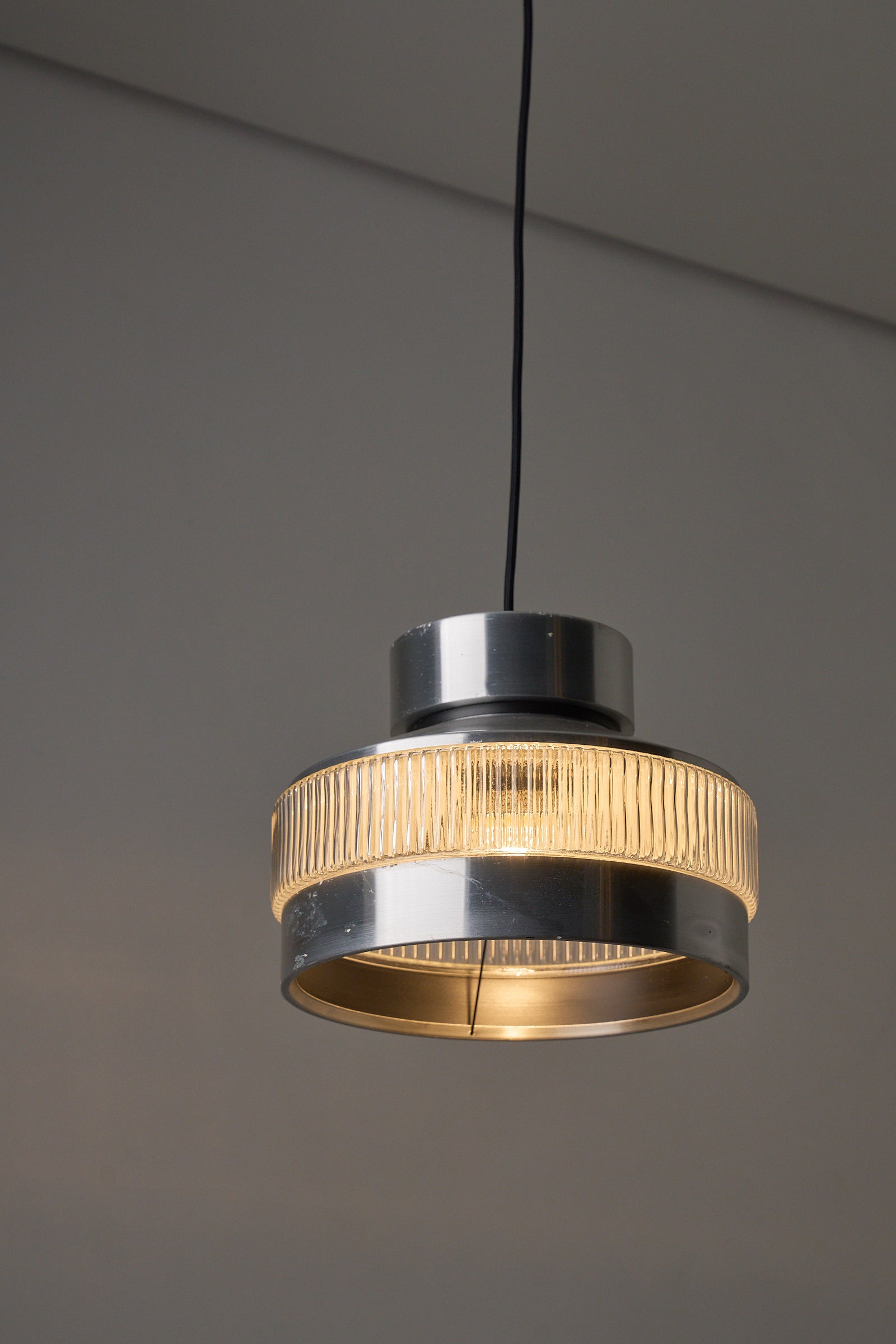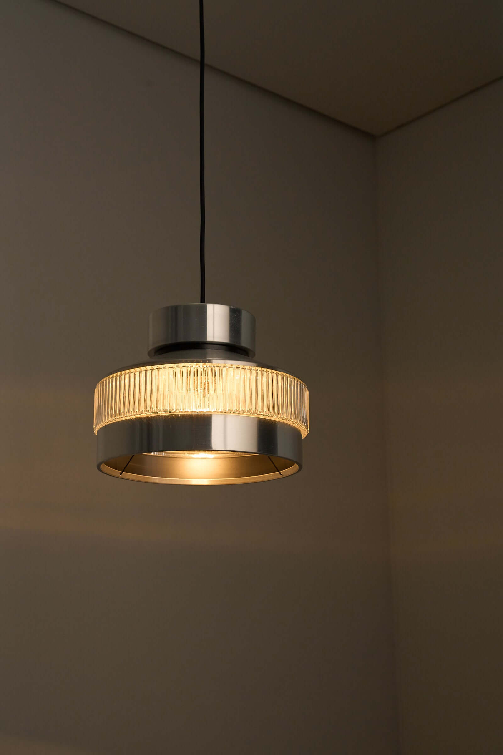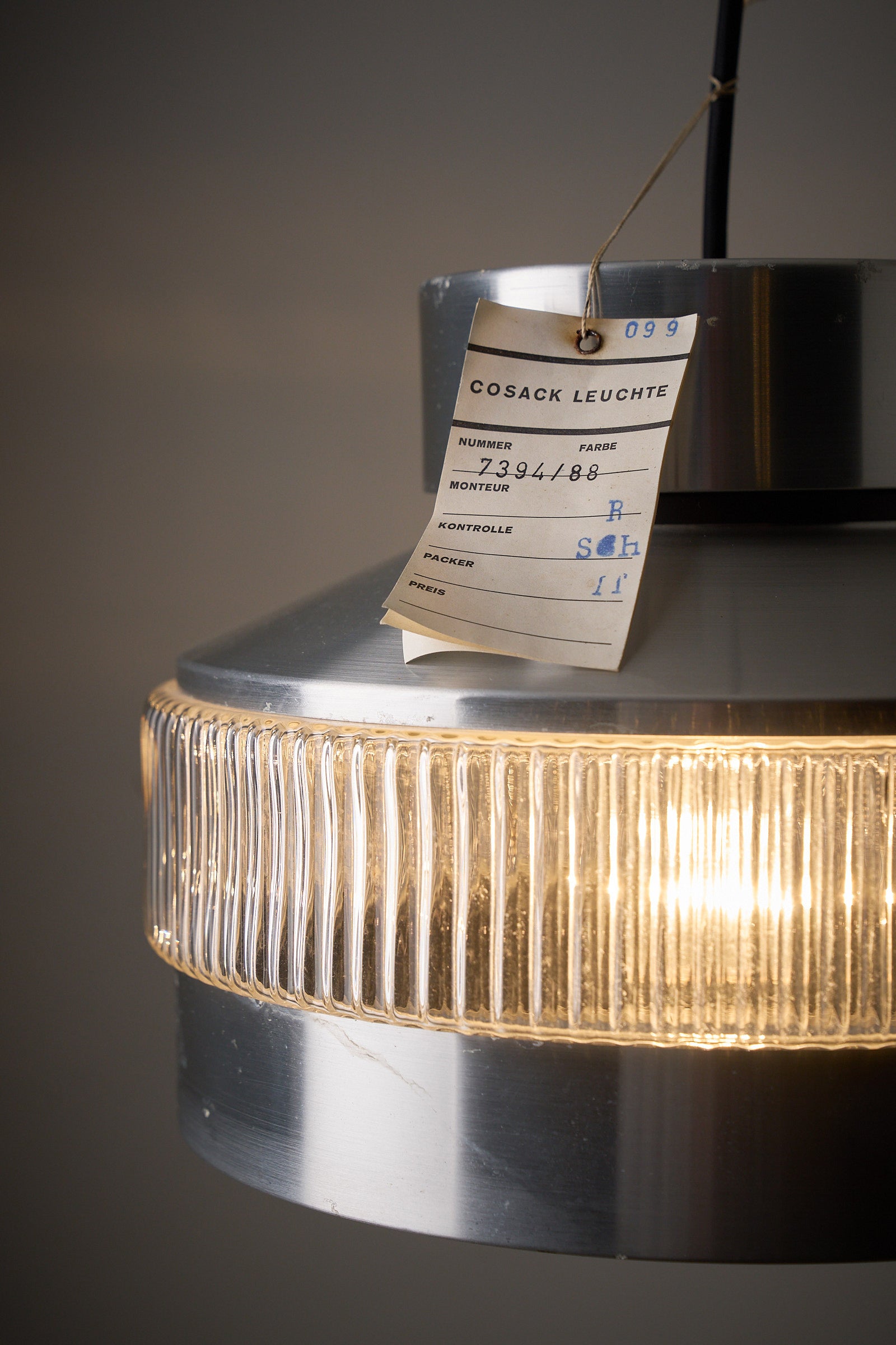 This elegant pendant lamp by Cosack Leuchten features a sleek chrome frame with a textured glass diffuser, offering a timeless modern design. The combination of the brushed chrome surface and the ribbed glass ring enhances the light’s diffusion, creating a warm, inviting glow. This piece exemplifies mid-century modern craftsmanship with its minimalist shape and quality materials. Perfect for adding a touch of sophistication to various interiors.