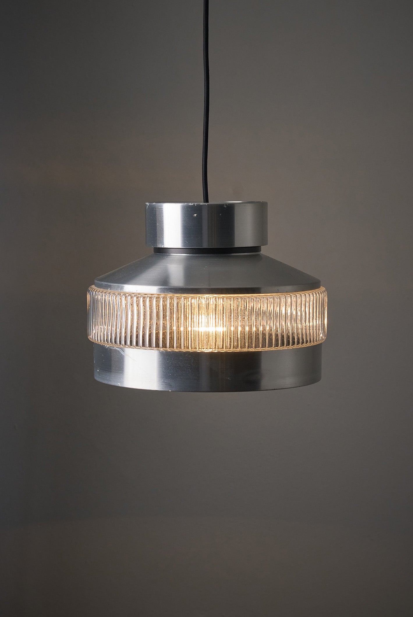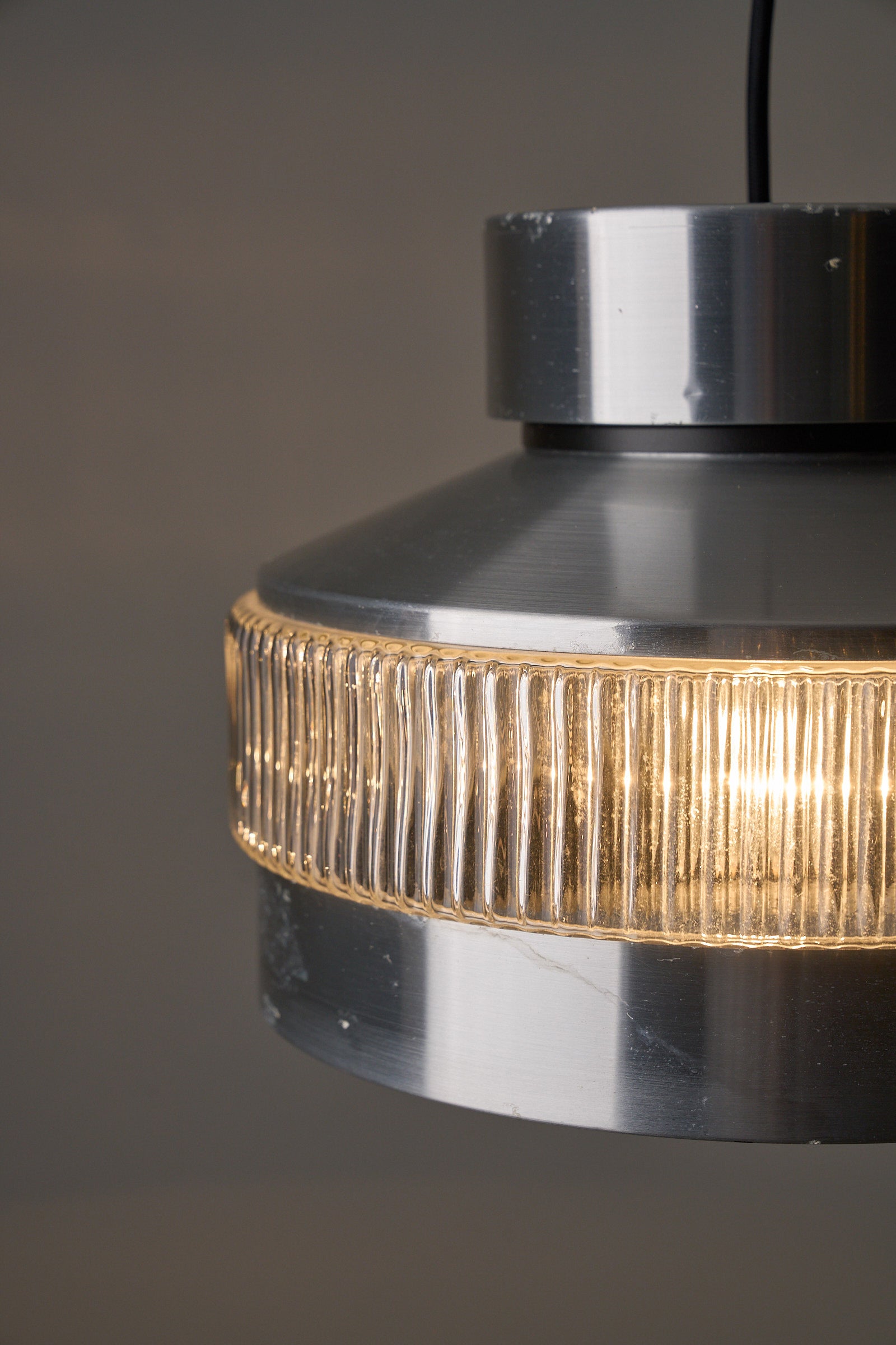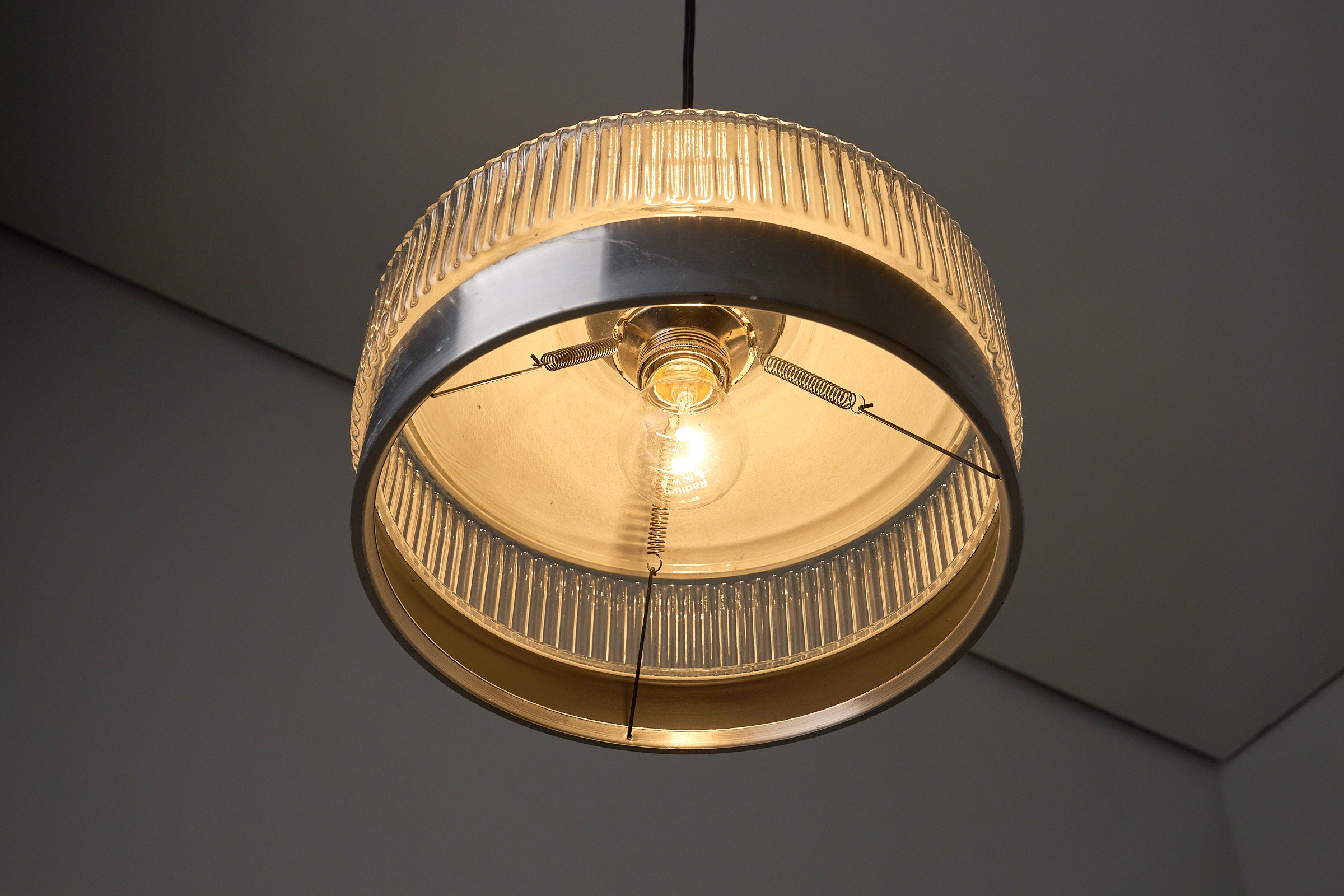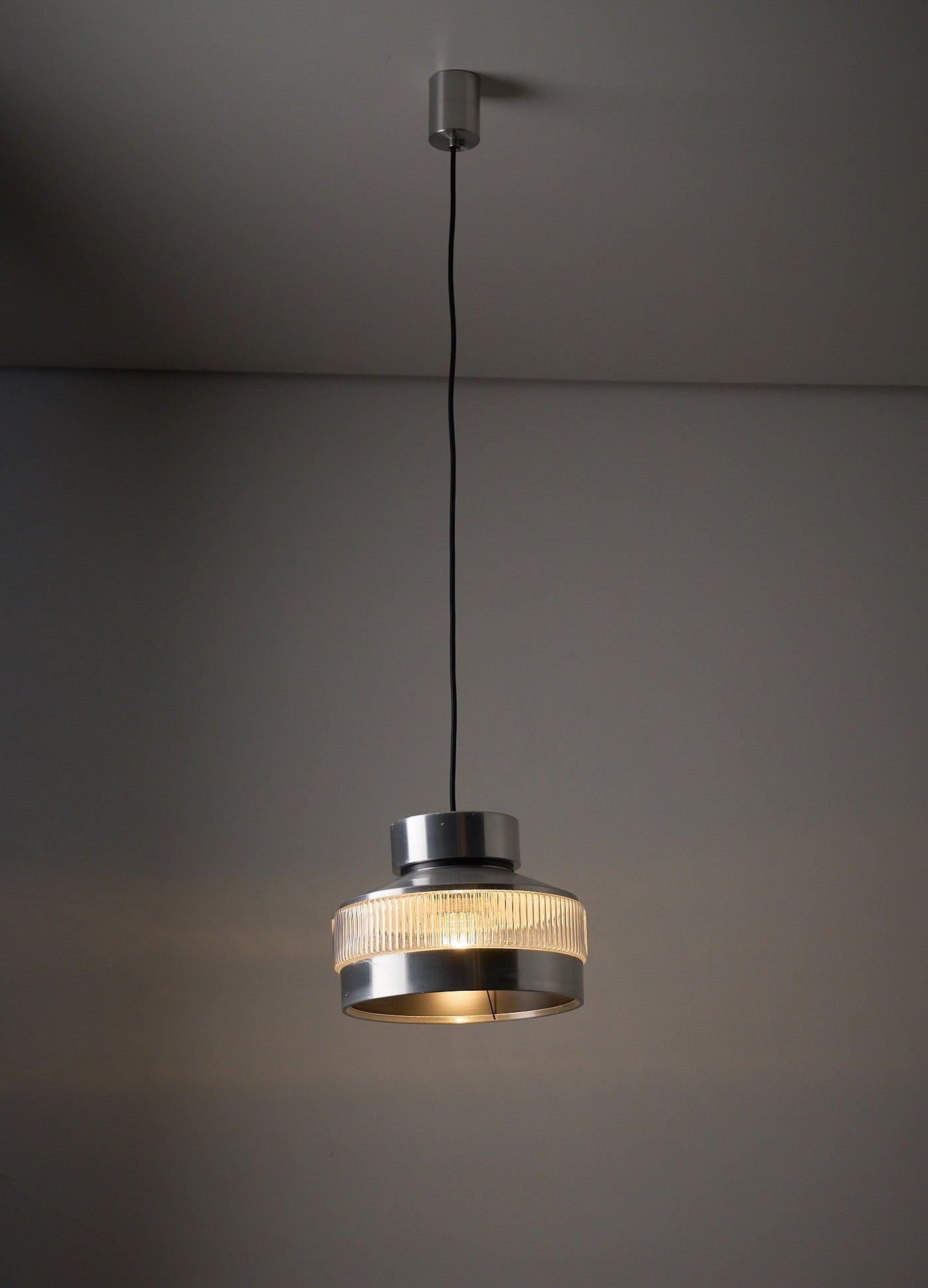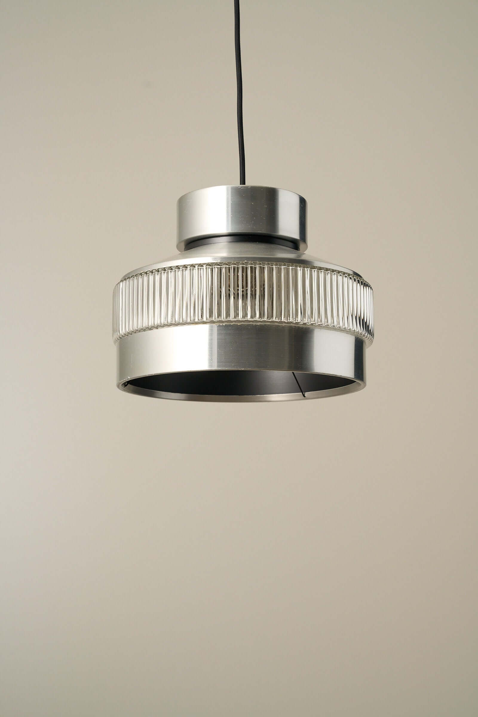 This elegant pendant lamp by Cosack Leuchten features a sleek chrome frame with a textured glass diffuser, offering a timeless modern design. The combination of the brushed chrome surface and the ribbed glass ring enhances the light’s diffusion, creating a warm, inviting glow. This piece exemplifies mid-century modern craftsmanship with its minimalist shape and quality materials. Perfect for adding a touch of sophistication to various interiors.