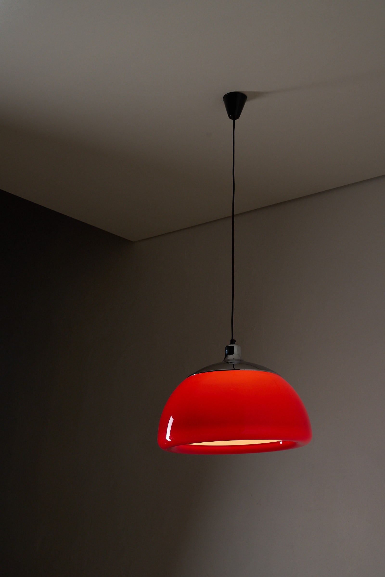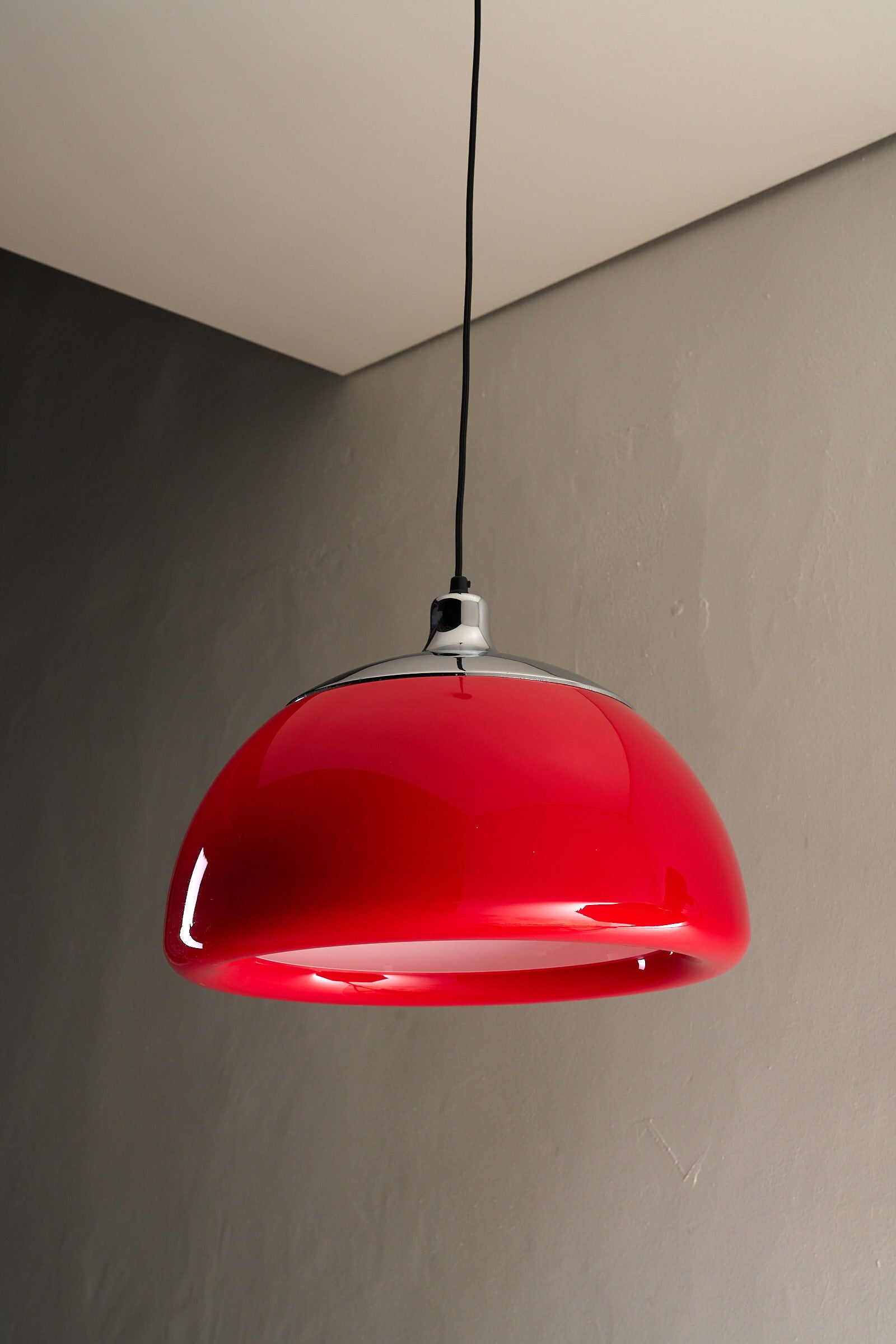 A vibrant Space Age pendant that pairs bold color with sleek modern form.