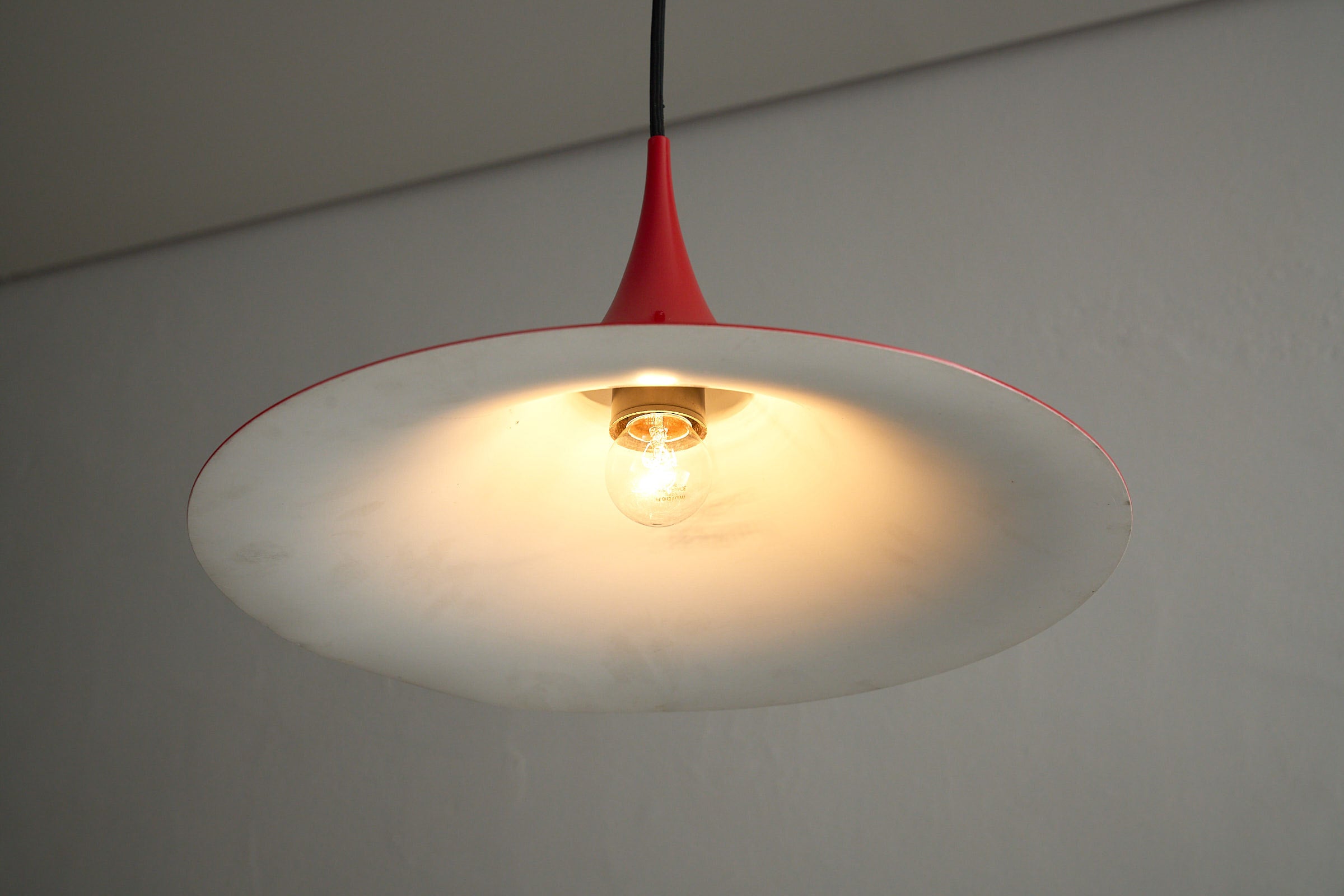 Red enamel pendant lamp designed by Claus Bonderup and Torsten Thorup for Fog & Mørup in 1967. The semi-pendant lamp has a beautiful refined and organic shape, where the lamp flows into the woven cord. The outside is red and the inside is white for an optimal light effect.