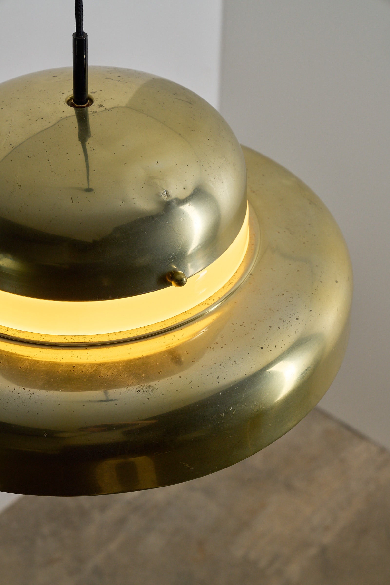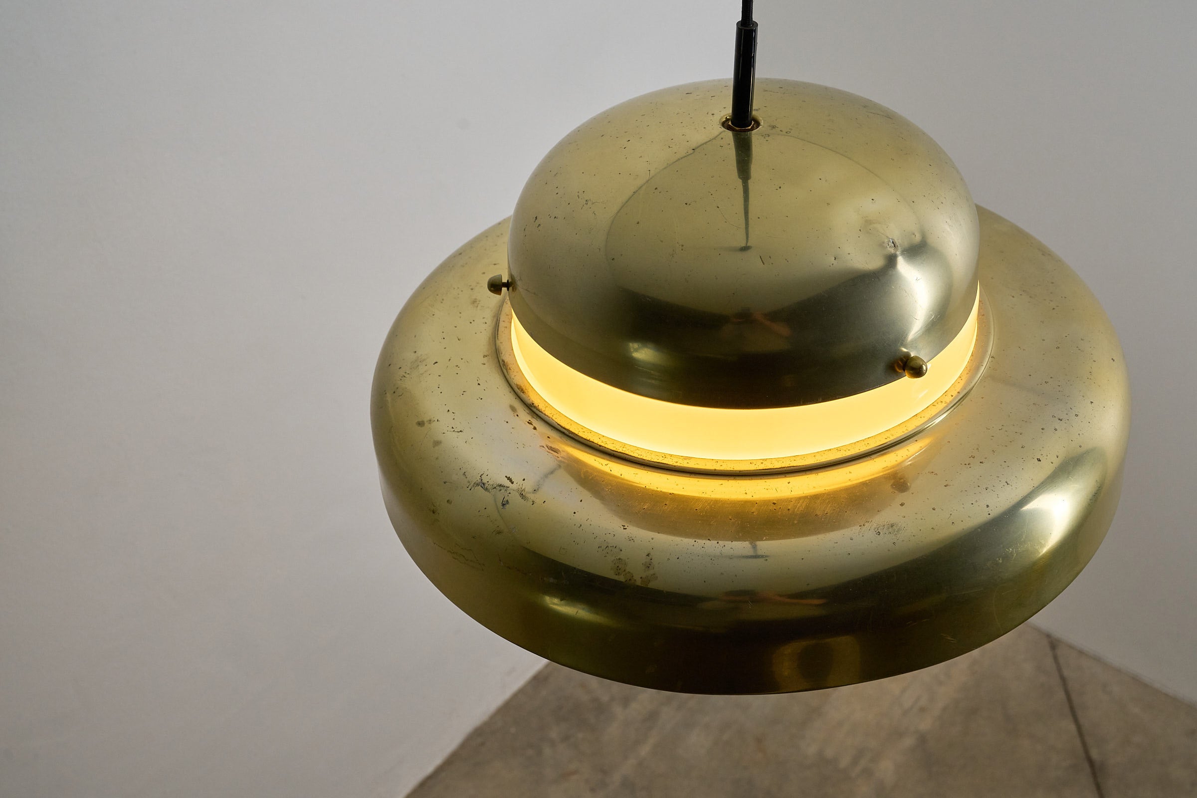 The lamp shows signs of age, including visible patina and a small dent on the top section — consistent with its vintage character. The combination of brass and glass makes it ideal for living rooms, dining areas, or above a reading corner, where its elegant glow enhances both atmosphere and warmth.