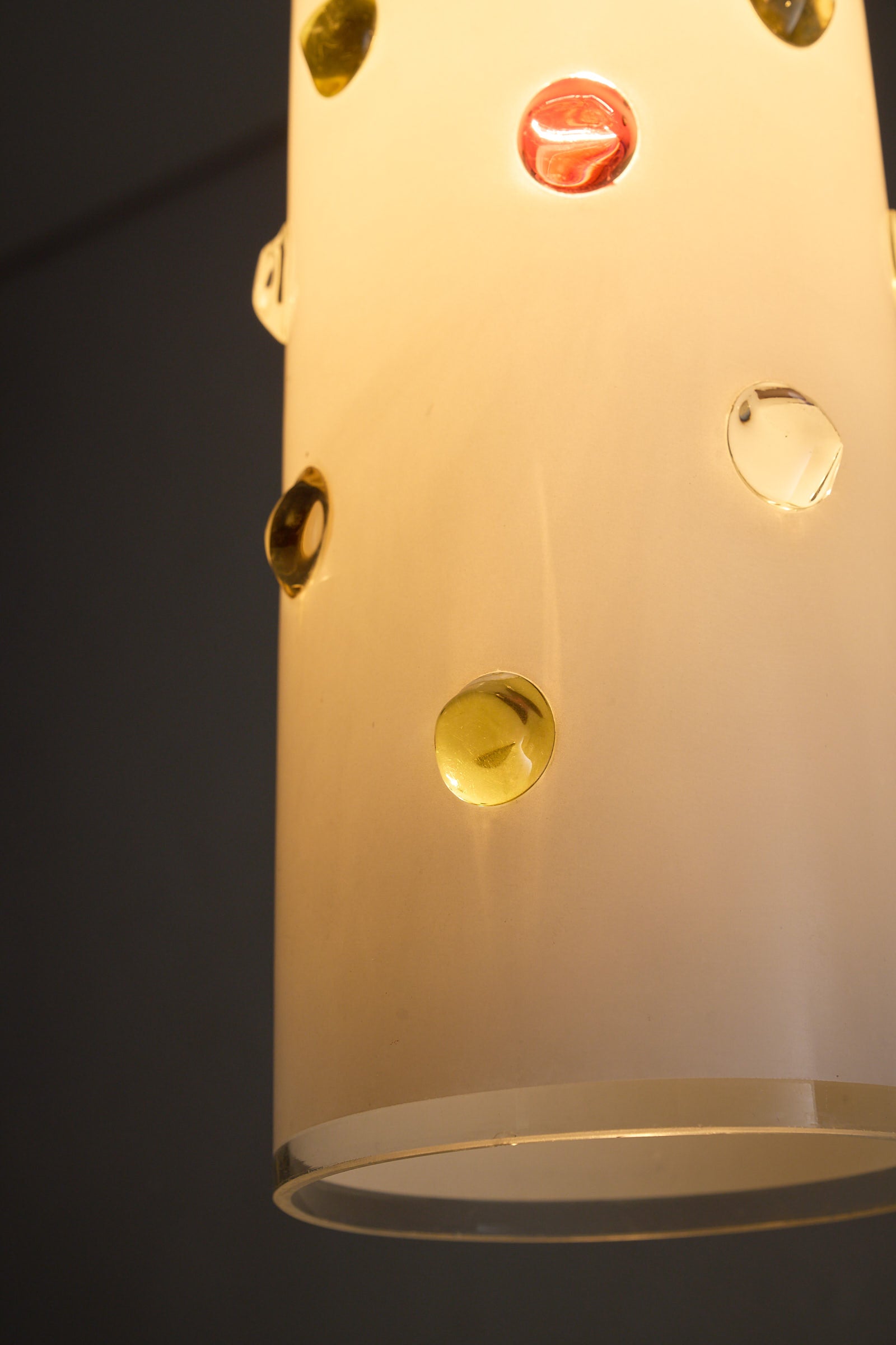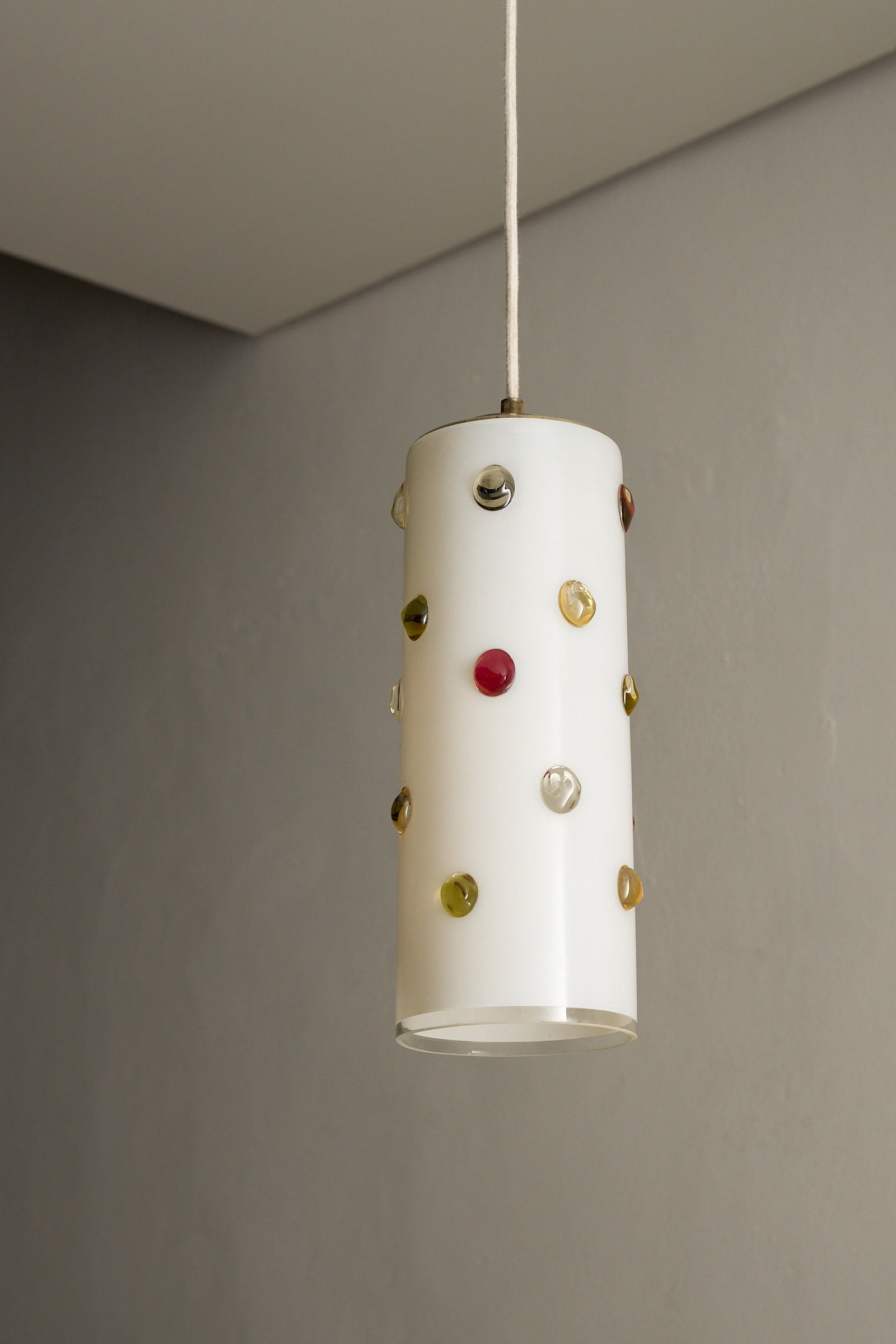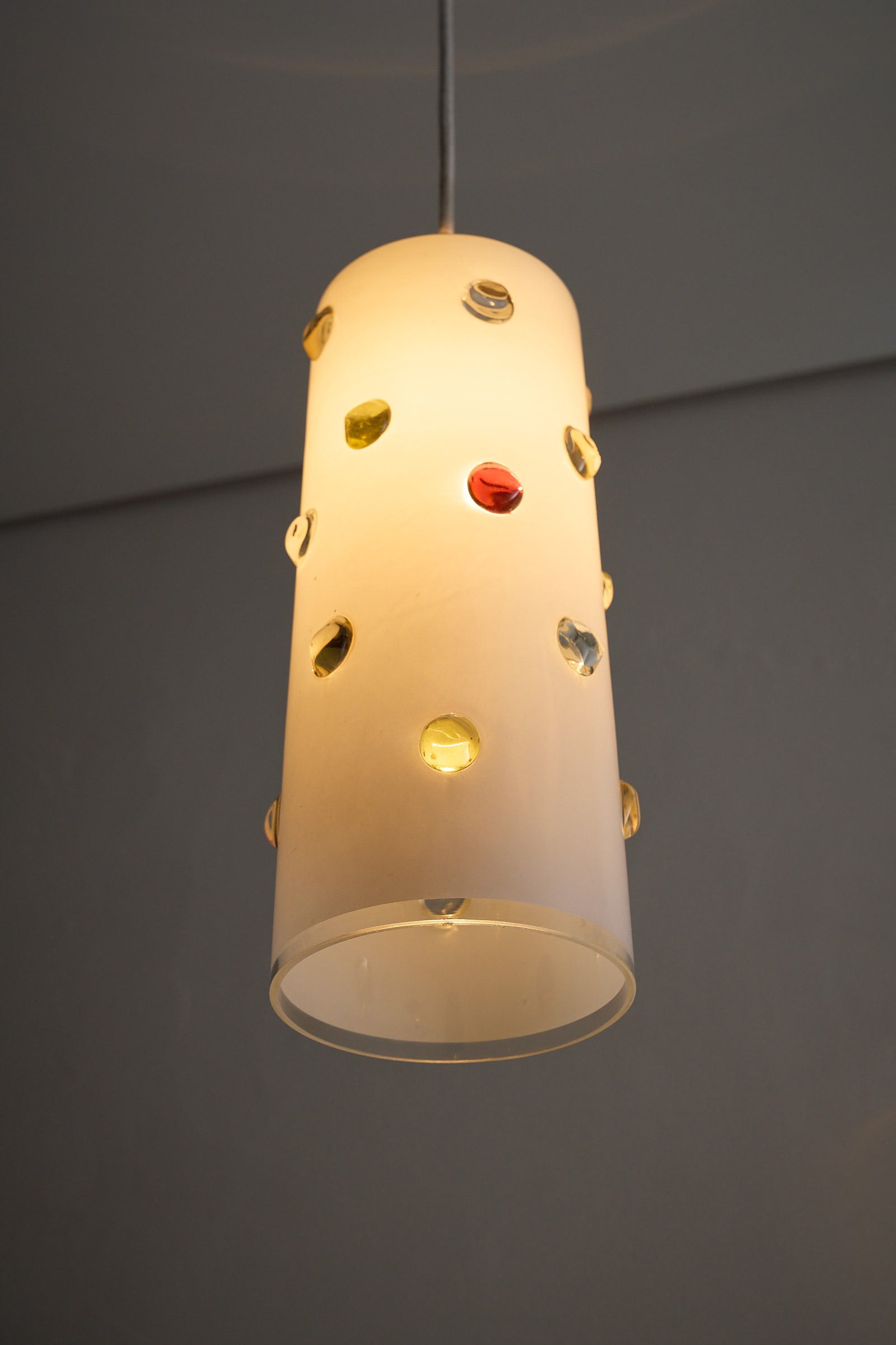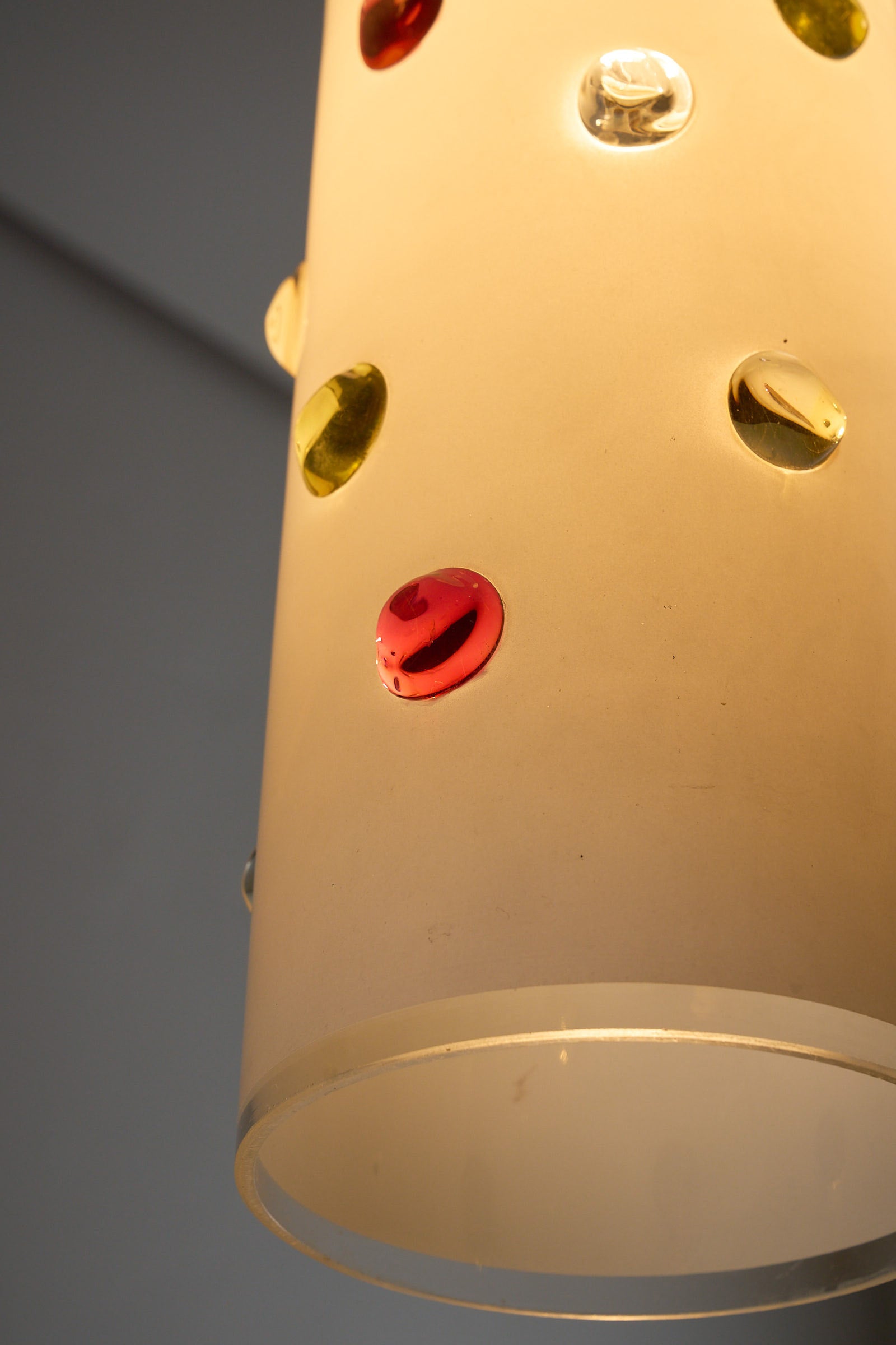 Cylindrical shade wit colored dots of yellow, red and blue. Playful surface decoration contrasts with the clean geometry of the shade, typical of the 1960s modern Italian aesthetic that blended craftsmanship with experimental design. This piece showcases the glassmaking techniques for which Vistosi became known in postwar Murano that allowed multiple hues to coexist within a single blown form