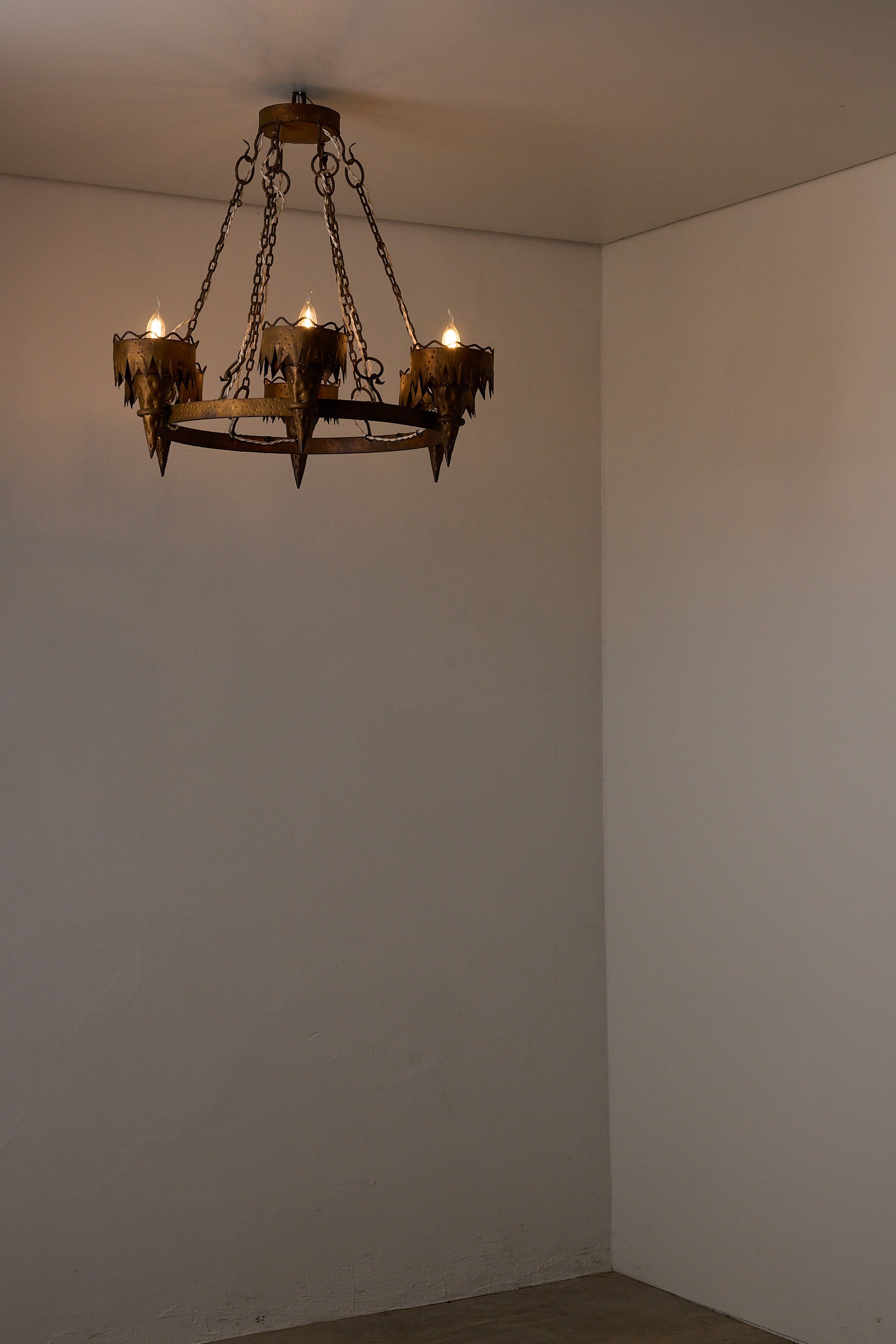 Suspended from a series of iron chains, each arm terminates in a conical torch-like fitting that diffuses the light warmly, enhancing the sculptural presence of the piece. Its generous proportions make it ideal for dining rooms, entry halls, or spaces requiring a dramatic statement light.