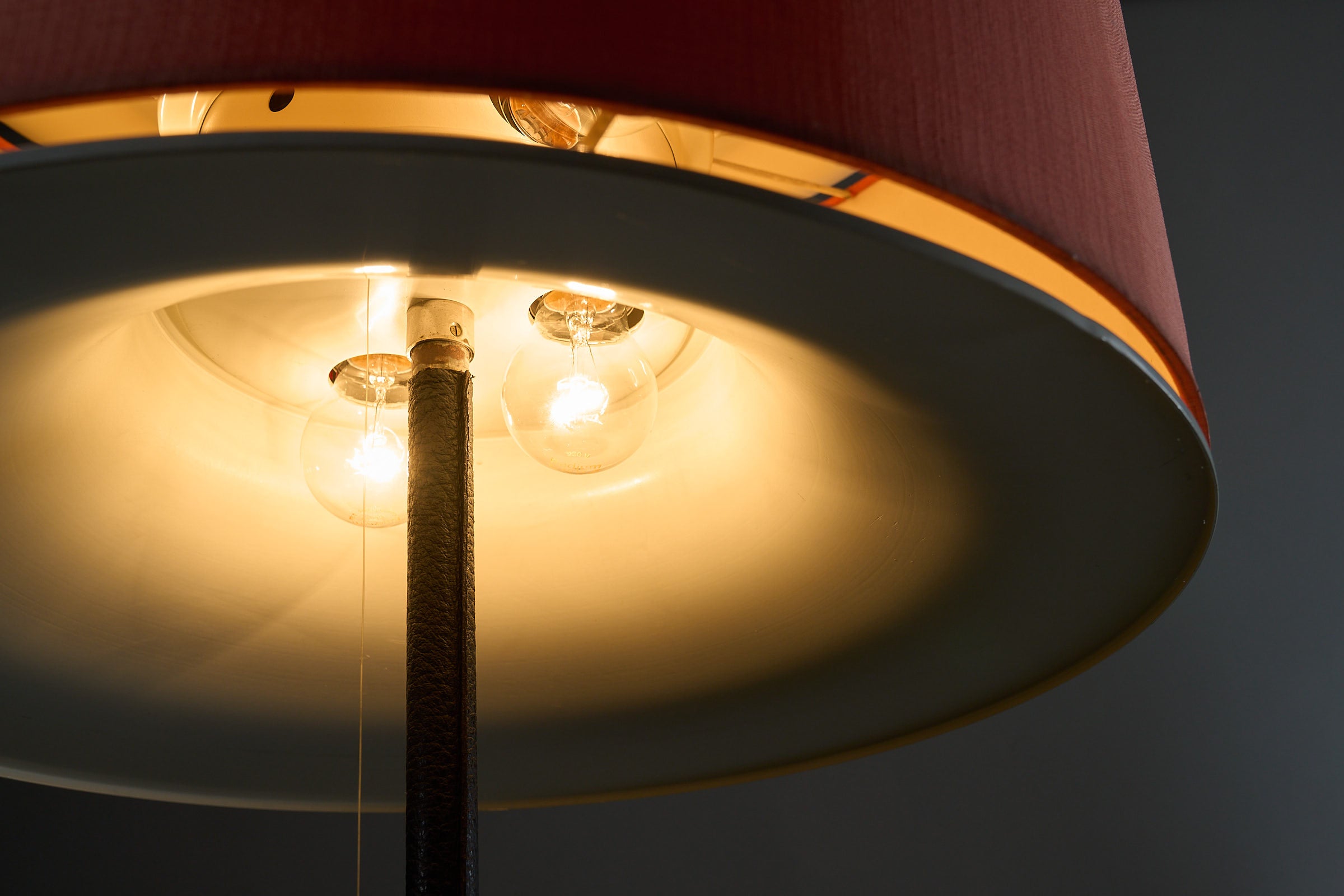 Floor lamp with a bordeaux shade with a triple light source fitting and a leather-clad stem and base by Staff Leuchten, Germany.