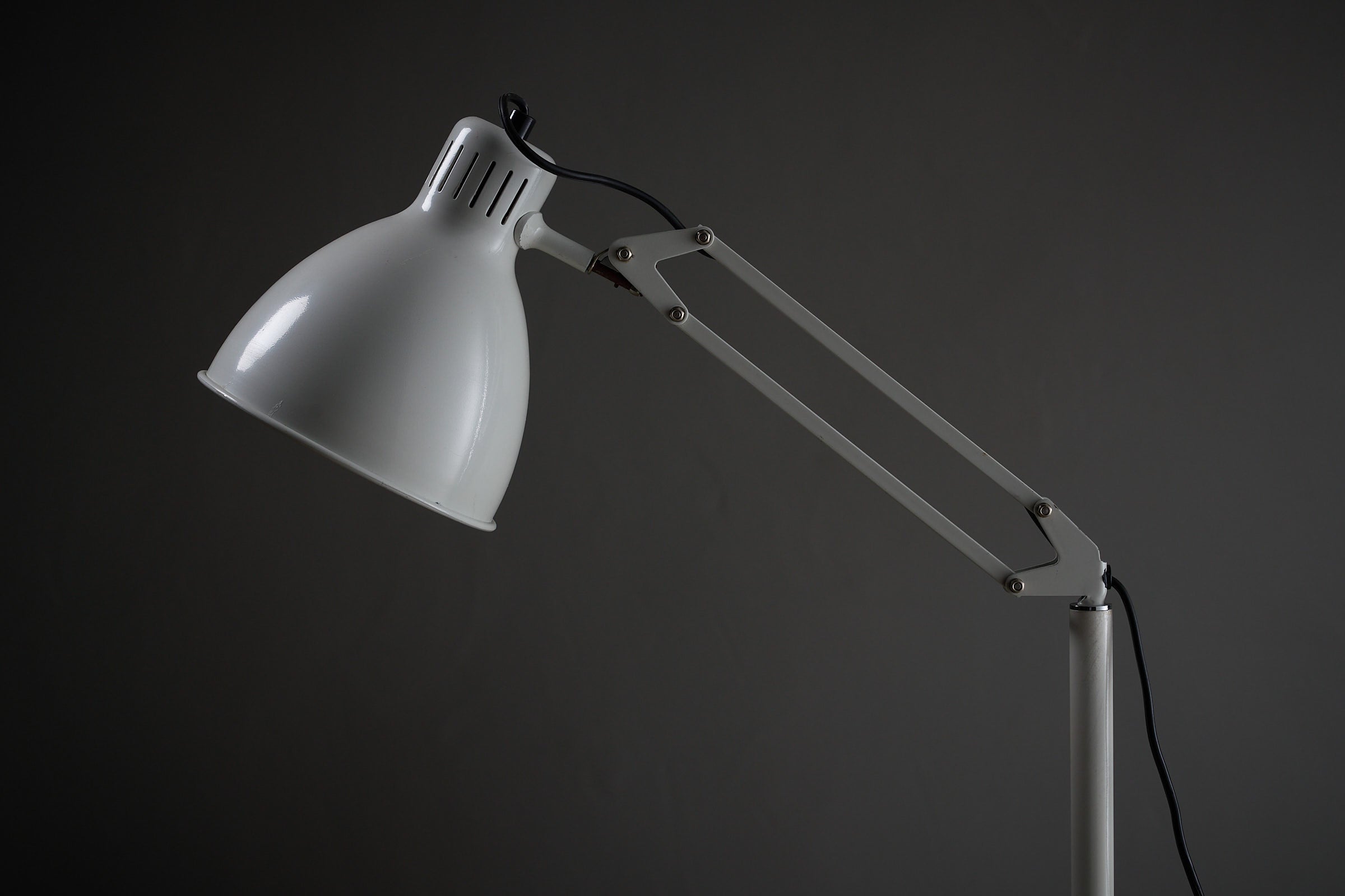 White “Arma” floor lamp with white base by Metalarte, Spain, 1970s. A bold and functional design piece that combines industrial precision with sculptural elegance.