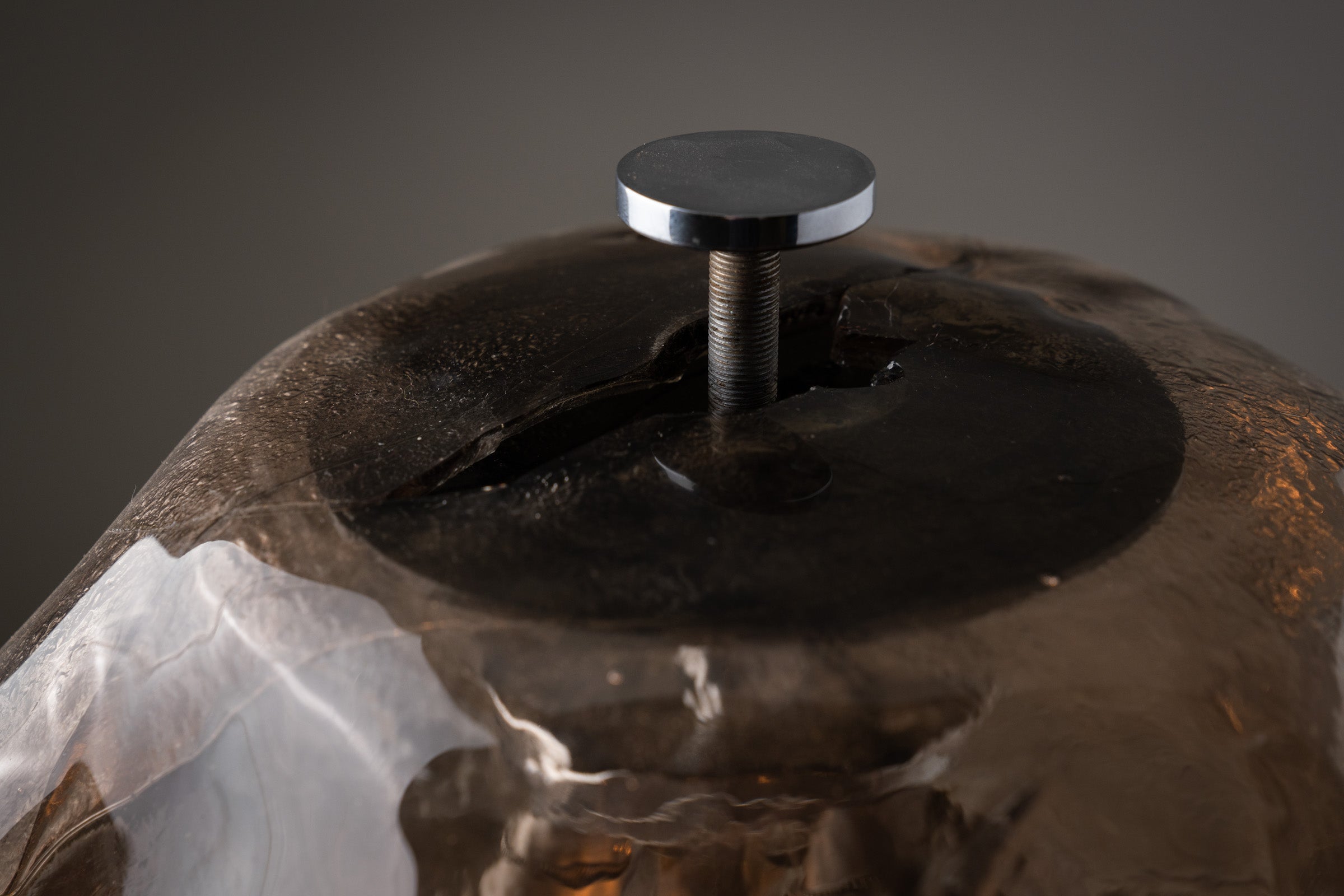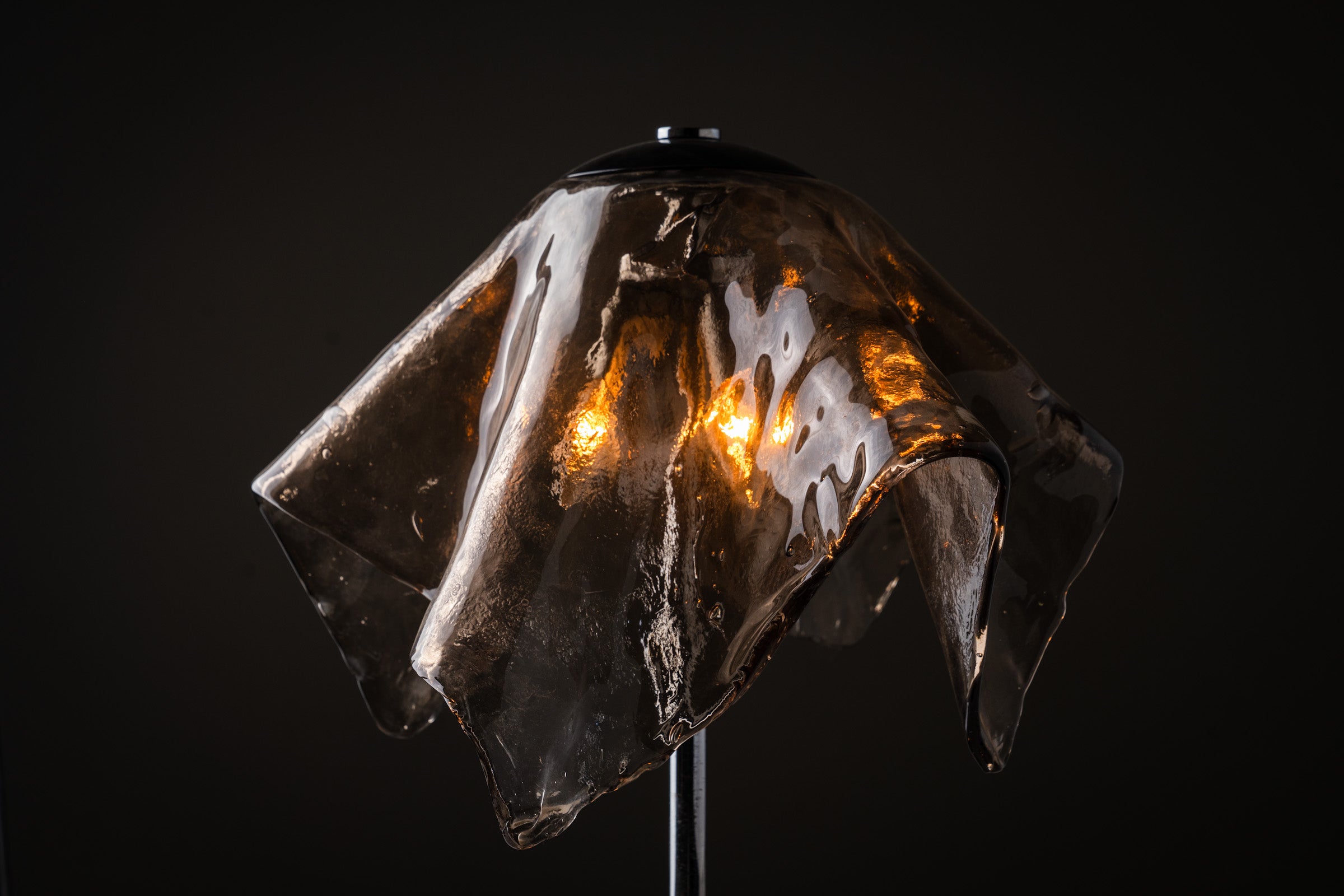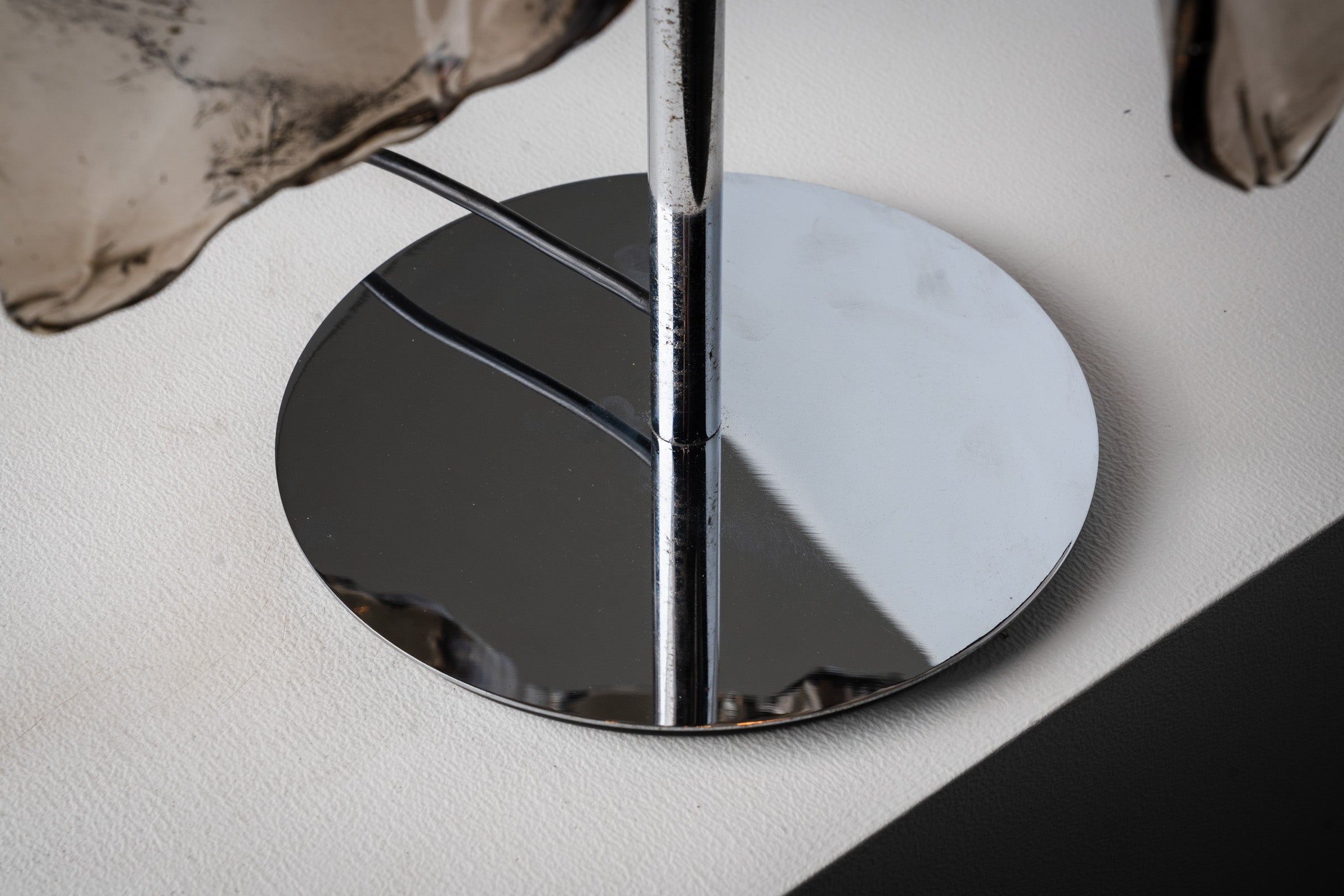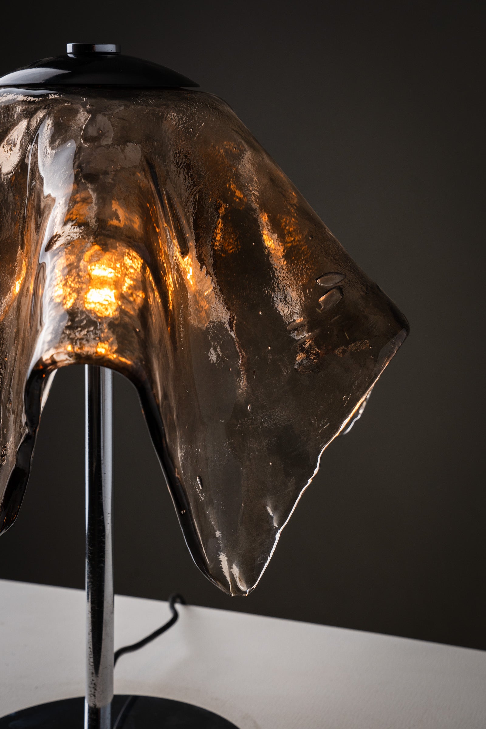 Elegant sculptural table lamp designed by Carlo Nason for Mazzega, Murano, during the 1970s. The lamp features a distinctive hand-blown smoked glass shade resting on a chrome-plated metal base, typical of Nason’s exploration of organic forms and light diffusion. The softly folded glass form creates a fluid silhouette that captures and reflects the light in subtle tones of grey and silver.