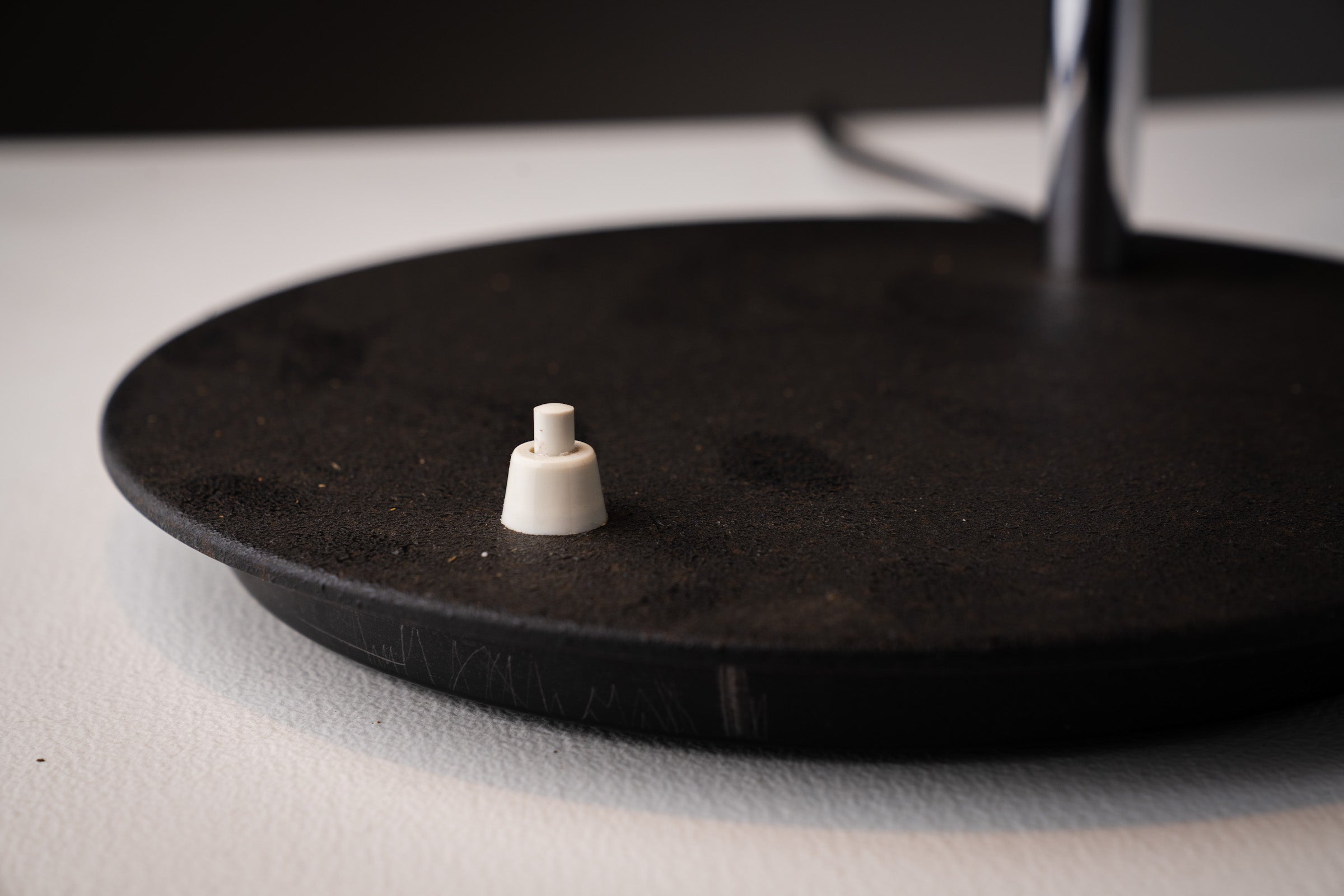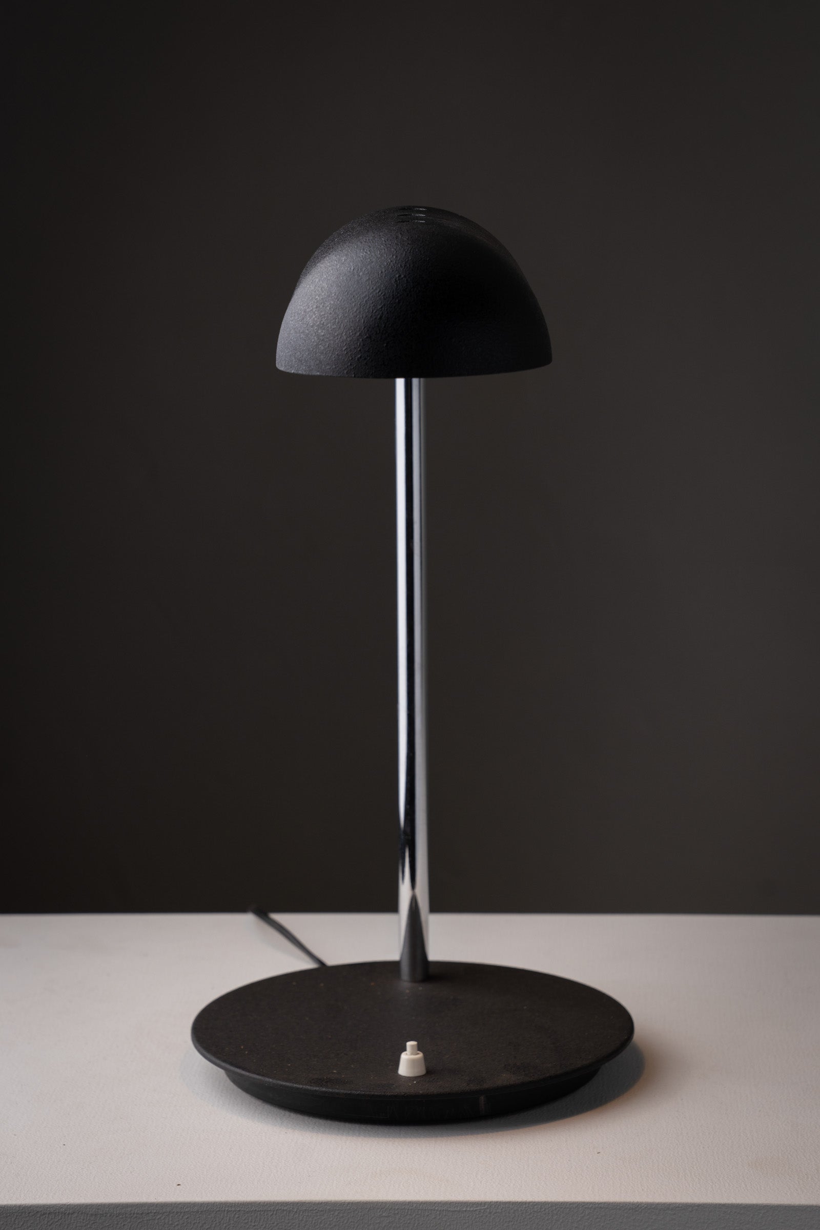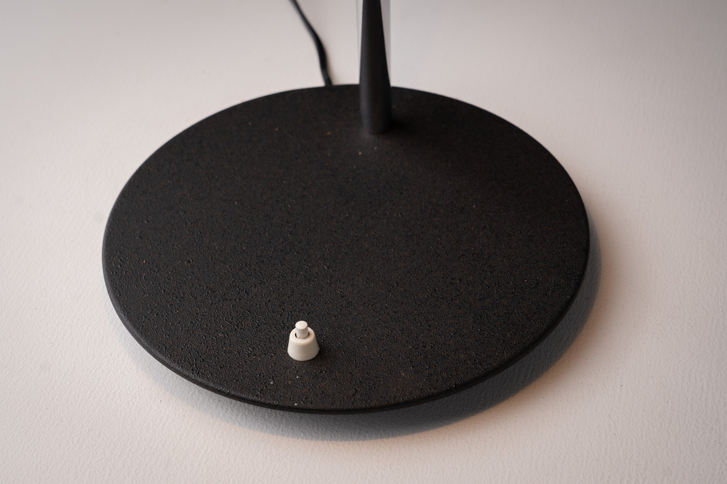 The base and shade are executed in cast iron with a textured black lacquer. The stem is made of chromed metal, introducing a subtle reflection that accentuates the lamp’s curvature and balance. The shade interior is lined with a porcelain fitting and a hammered metal reflector, designed to amplify and diffuse the light softly. Three perforated openings on top provide ventilation, characteristic of Mazza’s attention to detail and functionality.