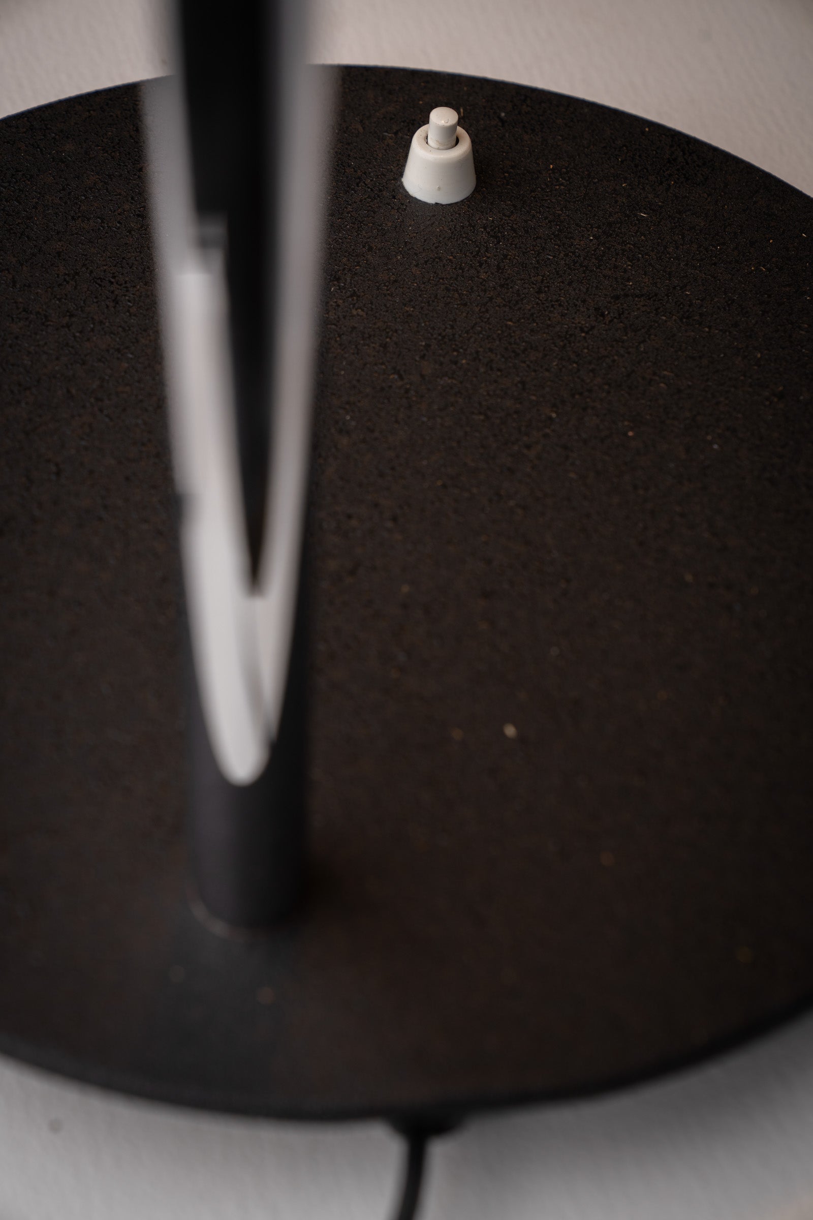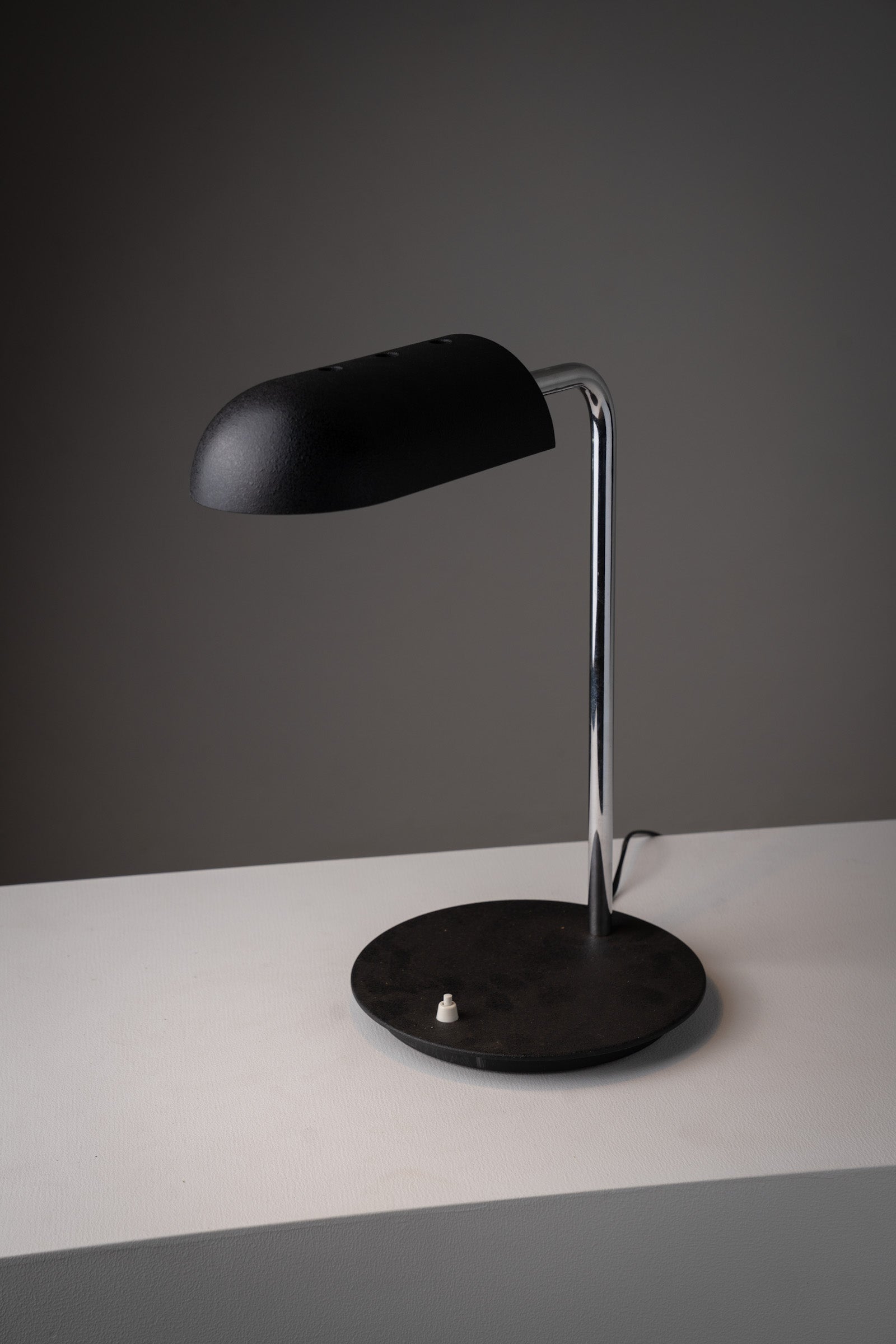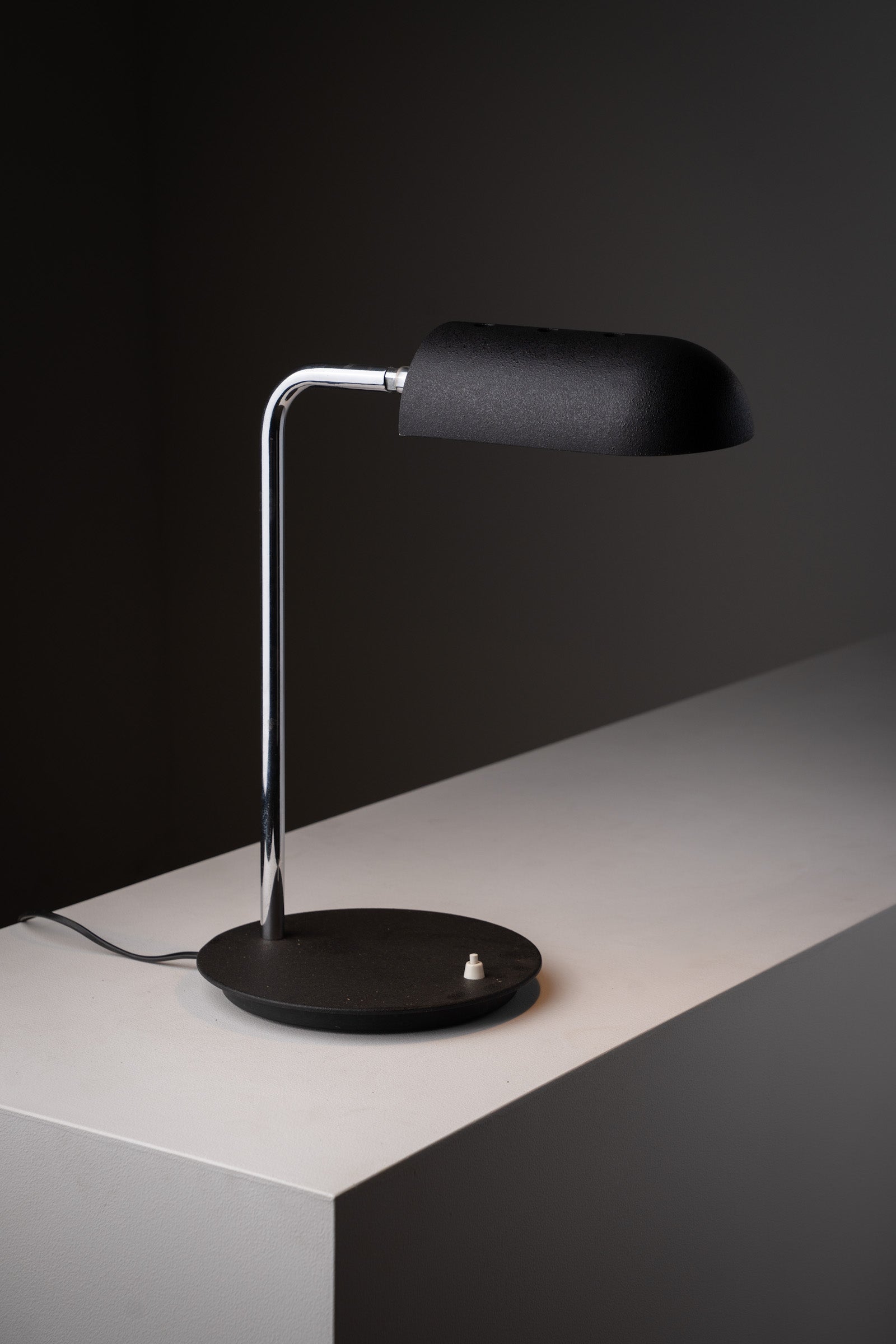 The base and shade are executed in cast iron with a textured black lacquer. The stem is made of chromed metal, introducing a subtle reflection that accentuates the lamp’s curvature and balance. The shade interior is lined with a porcelain fitting and a hammered metal reflector, designed to amplify and diffuse the light softly. Three perforated openings on top provide ventilation, characteristic of Mazza’s attention to detail and functionality.