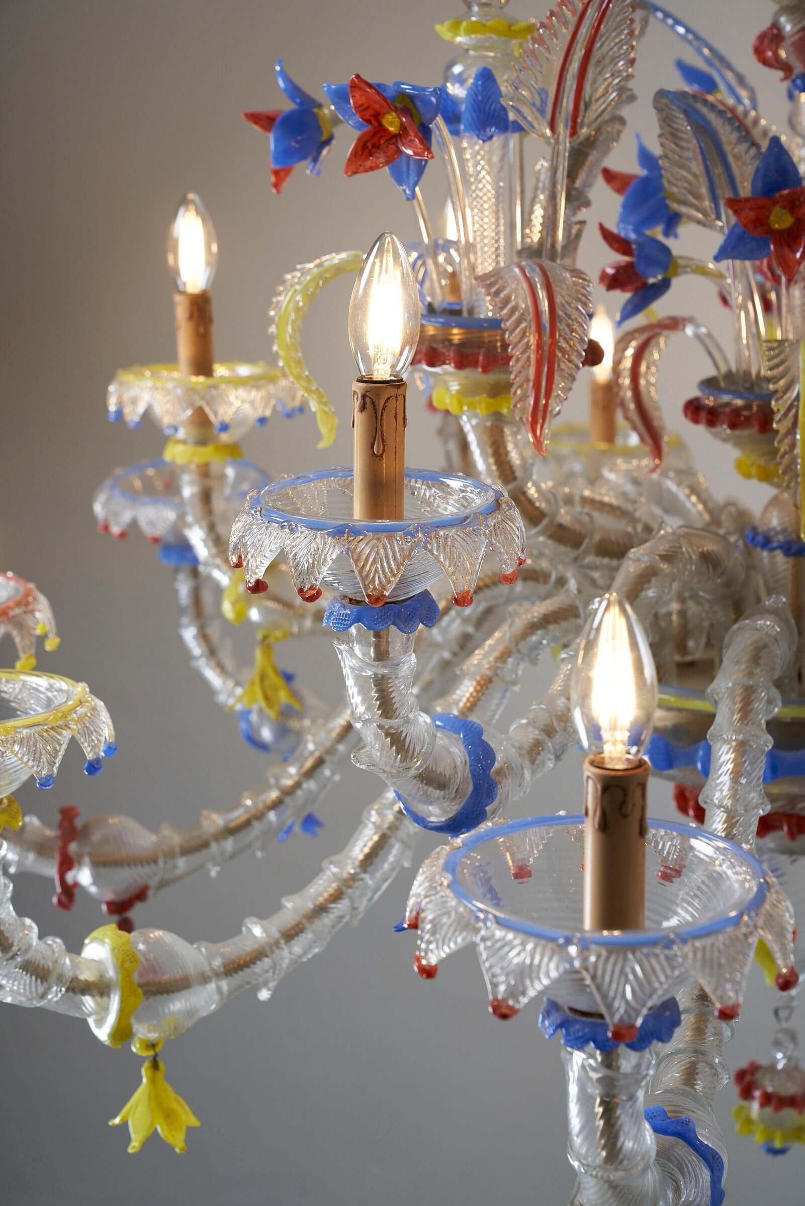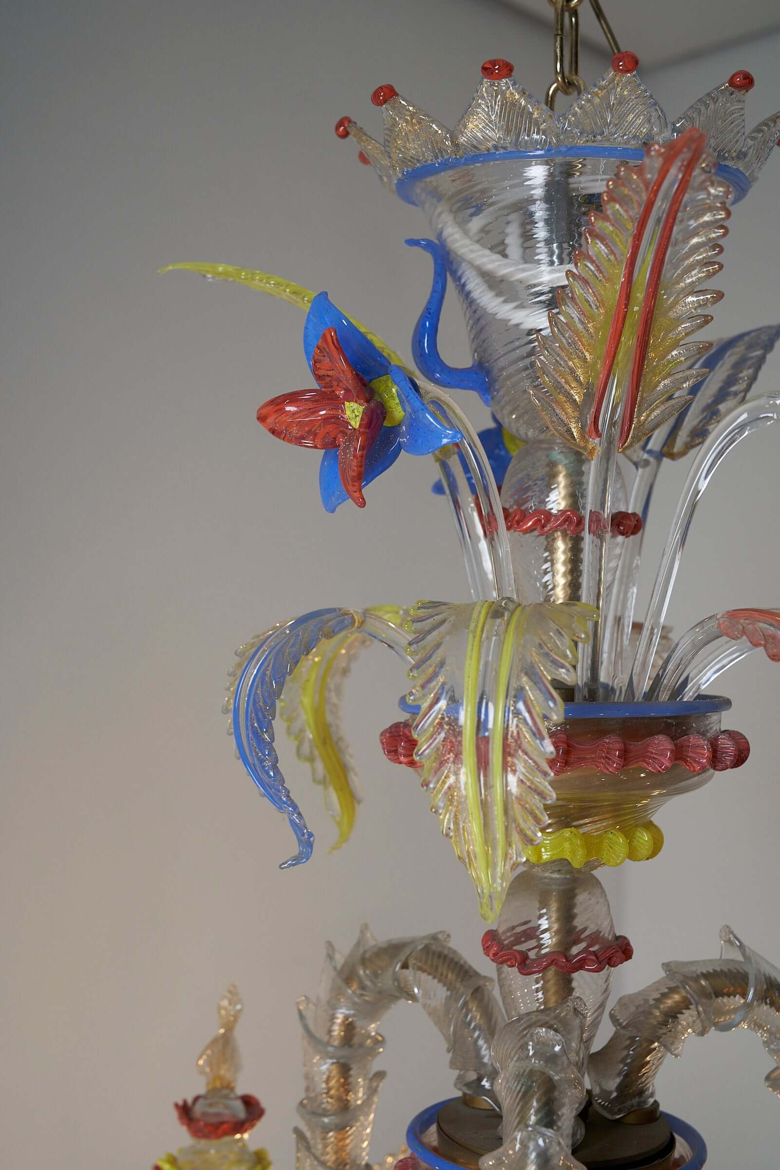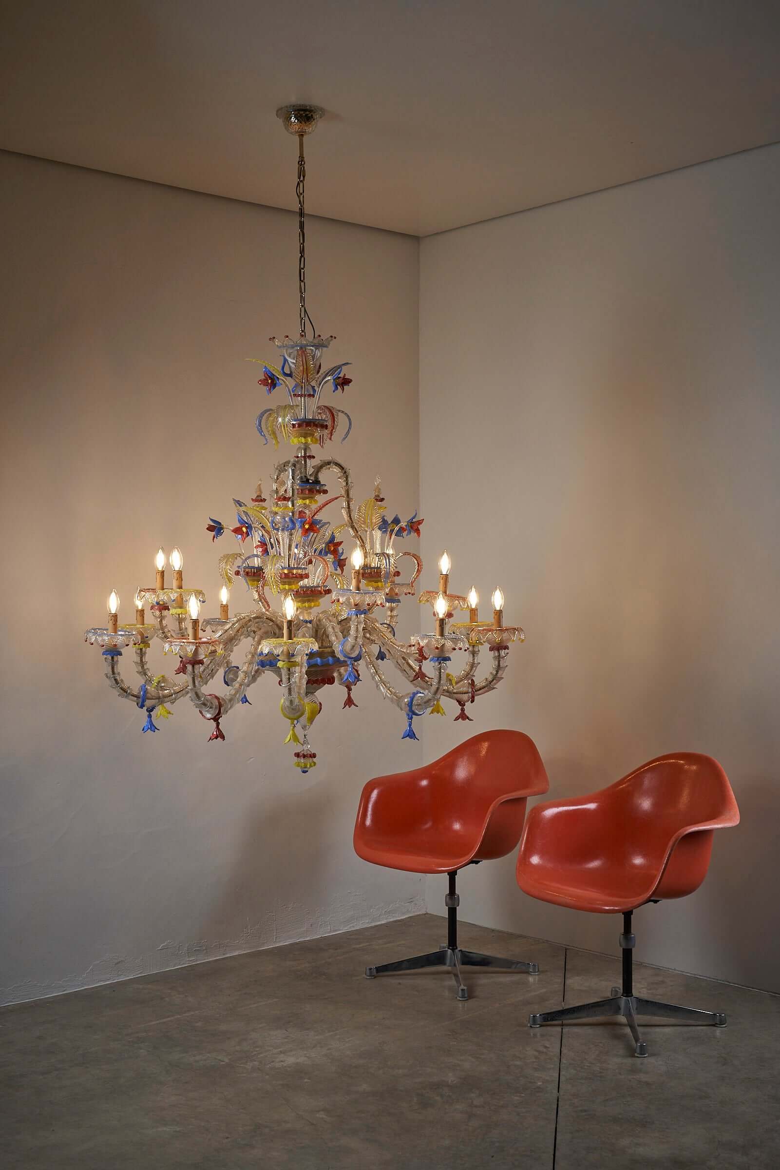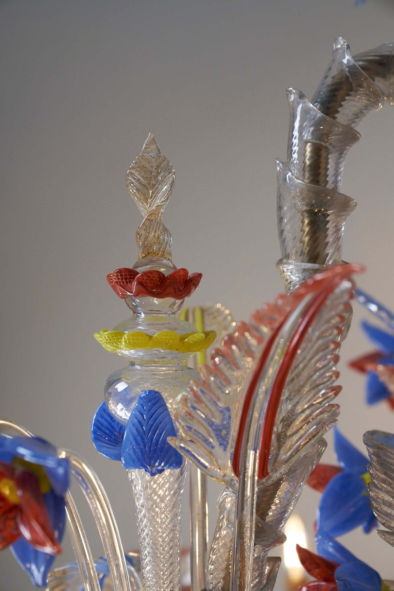 Le lustre est méticuleusement fabriqué à la main à partir de verre exquis, les principales pièces en verre présentant une combinaison étonnante de textures givrées. Les couleurs vibrantes du rouge, du jaune et du bleu sont incorporées de manière experte comme détails captivants dans tout le lustre, ajoutant un élément vibrant et dynamique à son design.