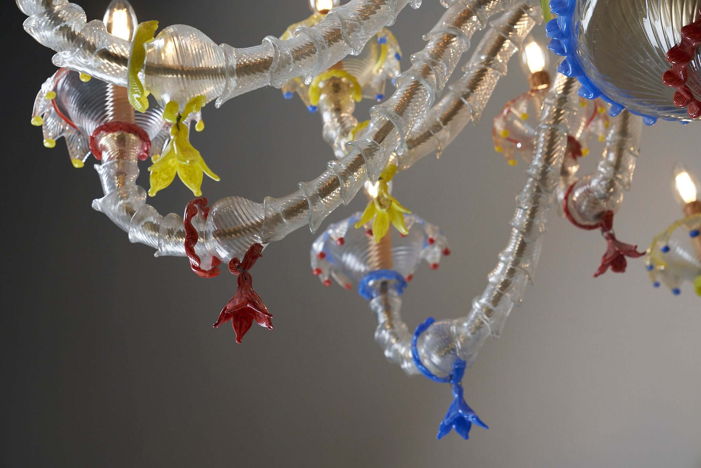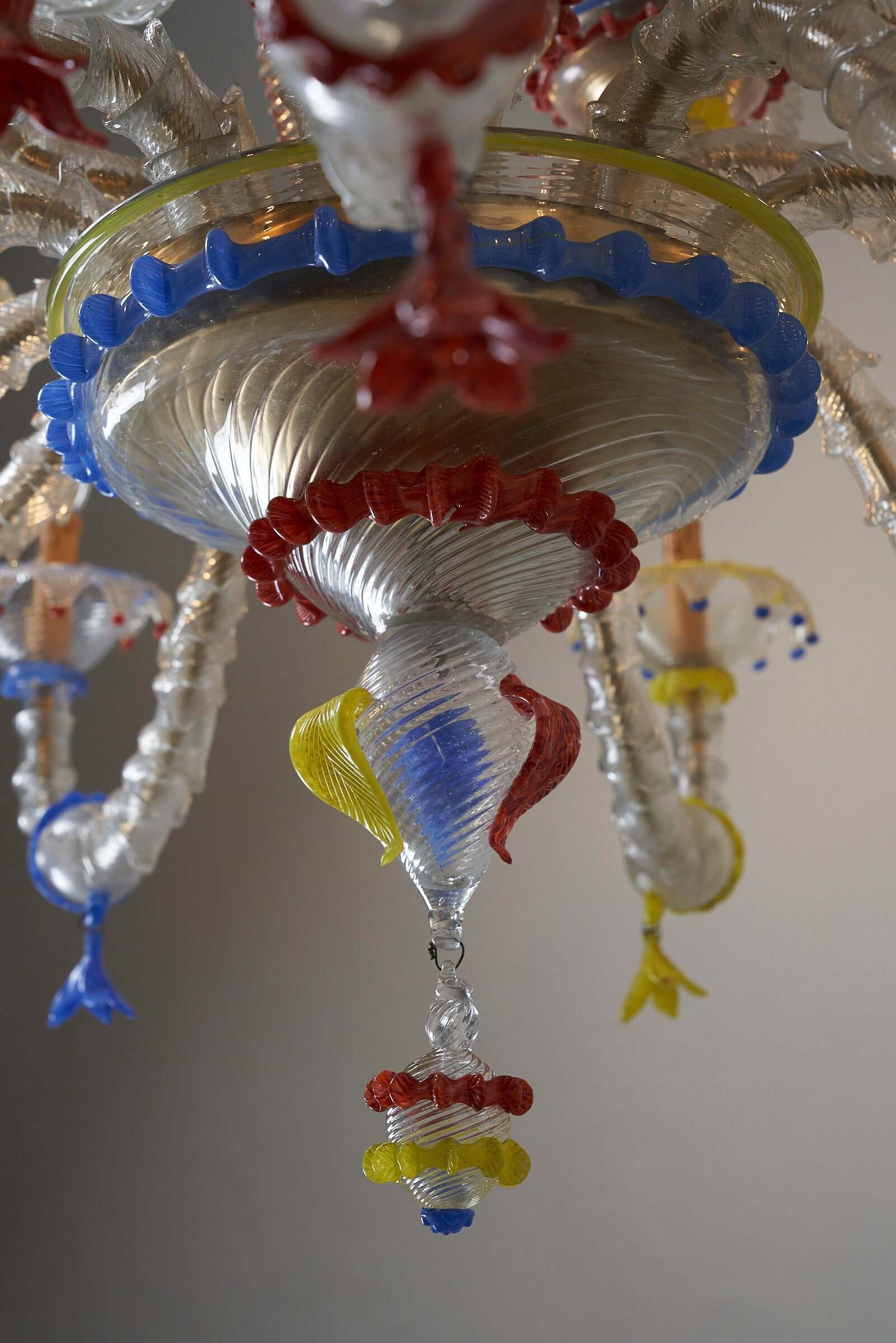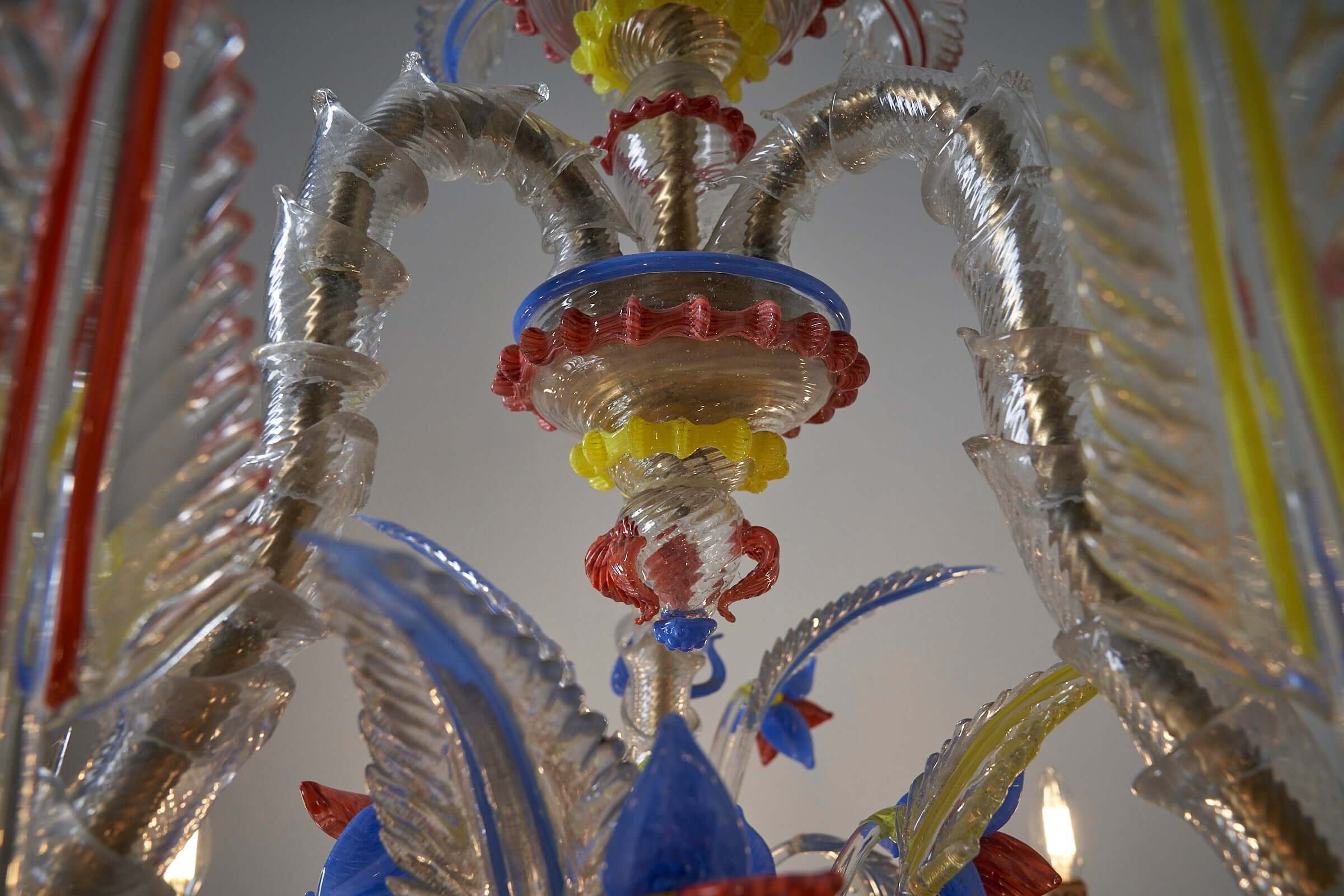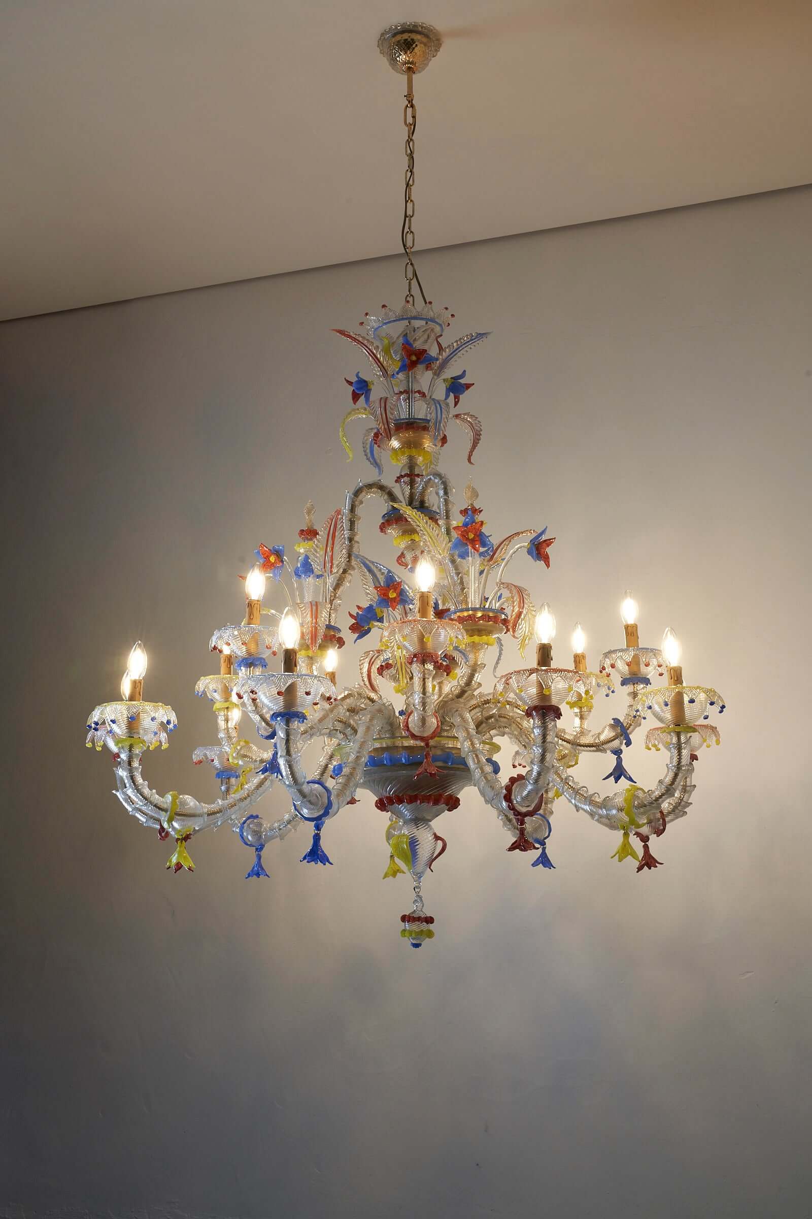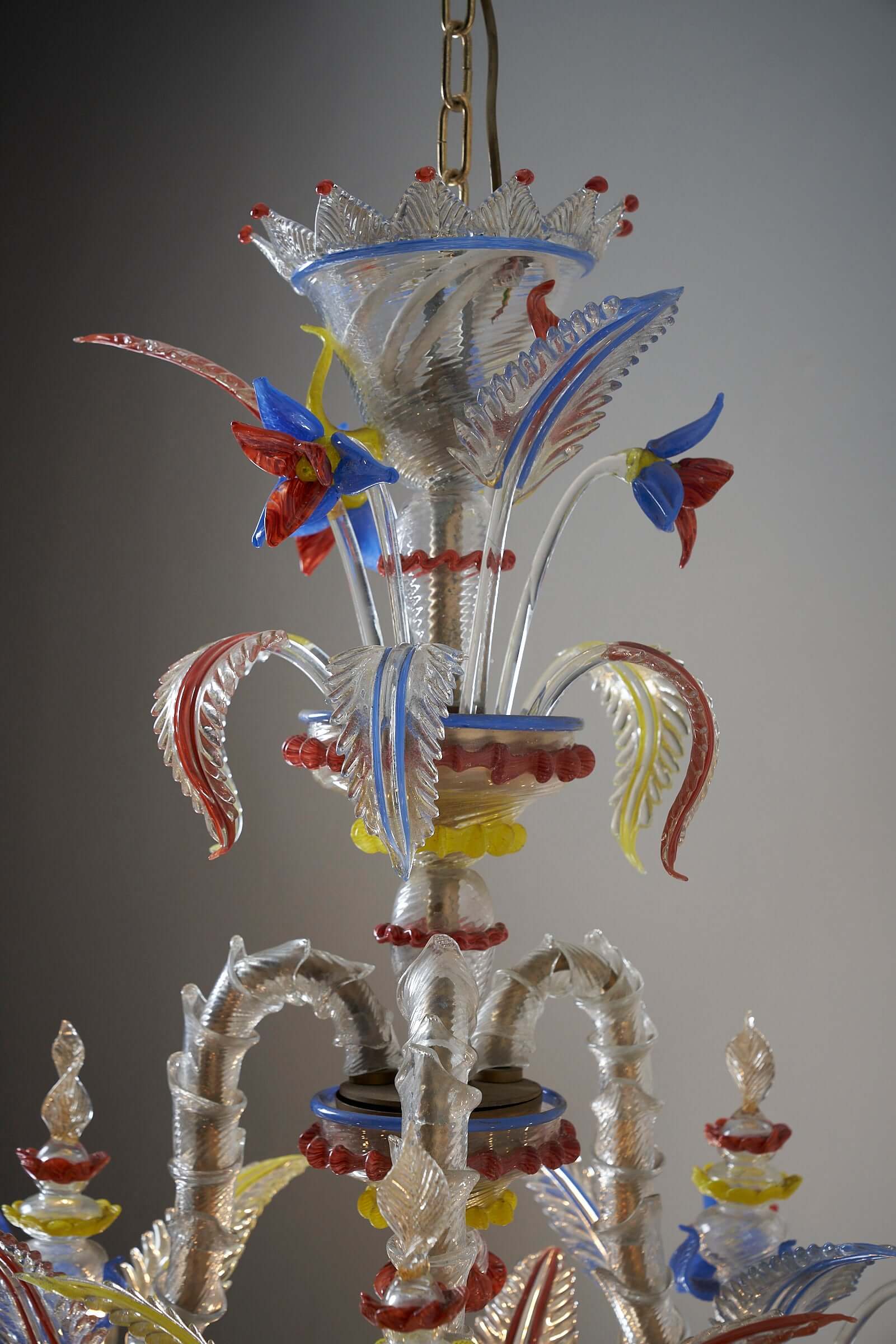Le lustre est méticuleusement fabriqué à la main à partir de verre exquis, les principales pièces en verre présentant une combinaison étonnante de textures givrées. Les couleurs vibrantes du rouge, du jaune et du bleu sont incorporées de manière experte comme détails captivants dans tout le lustre, ajoutant un élément vibrant et dynamique à son design.