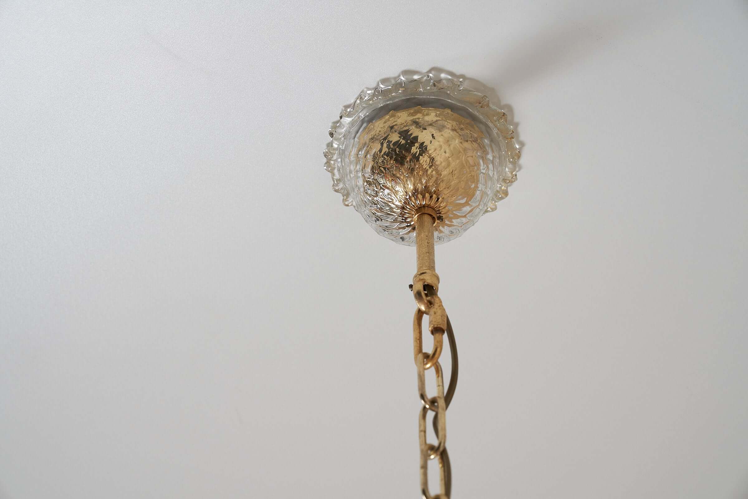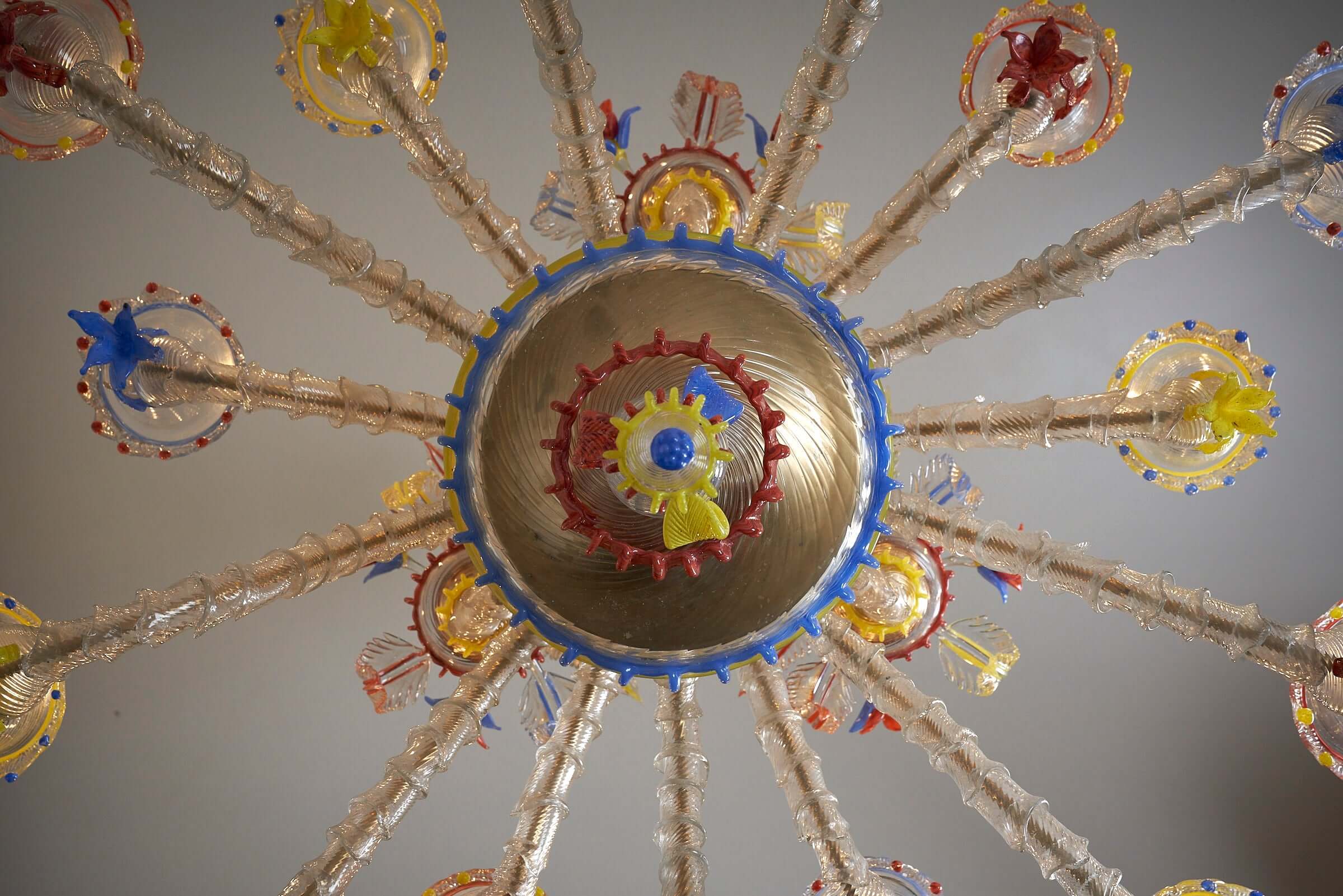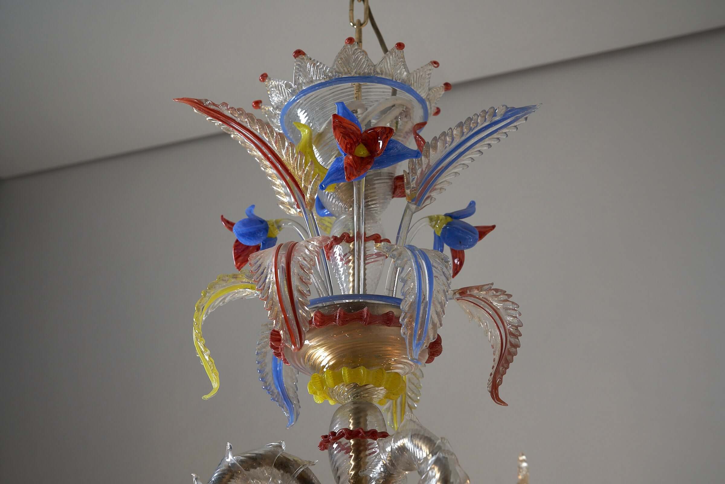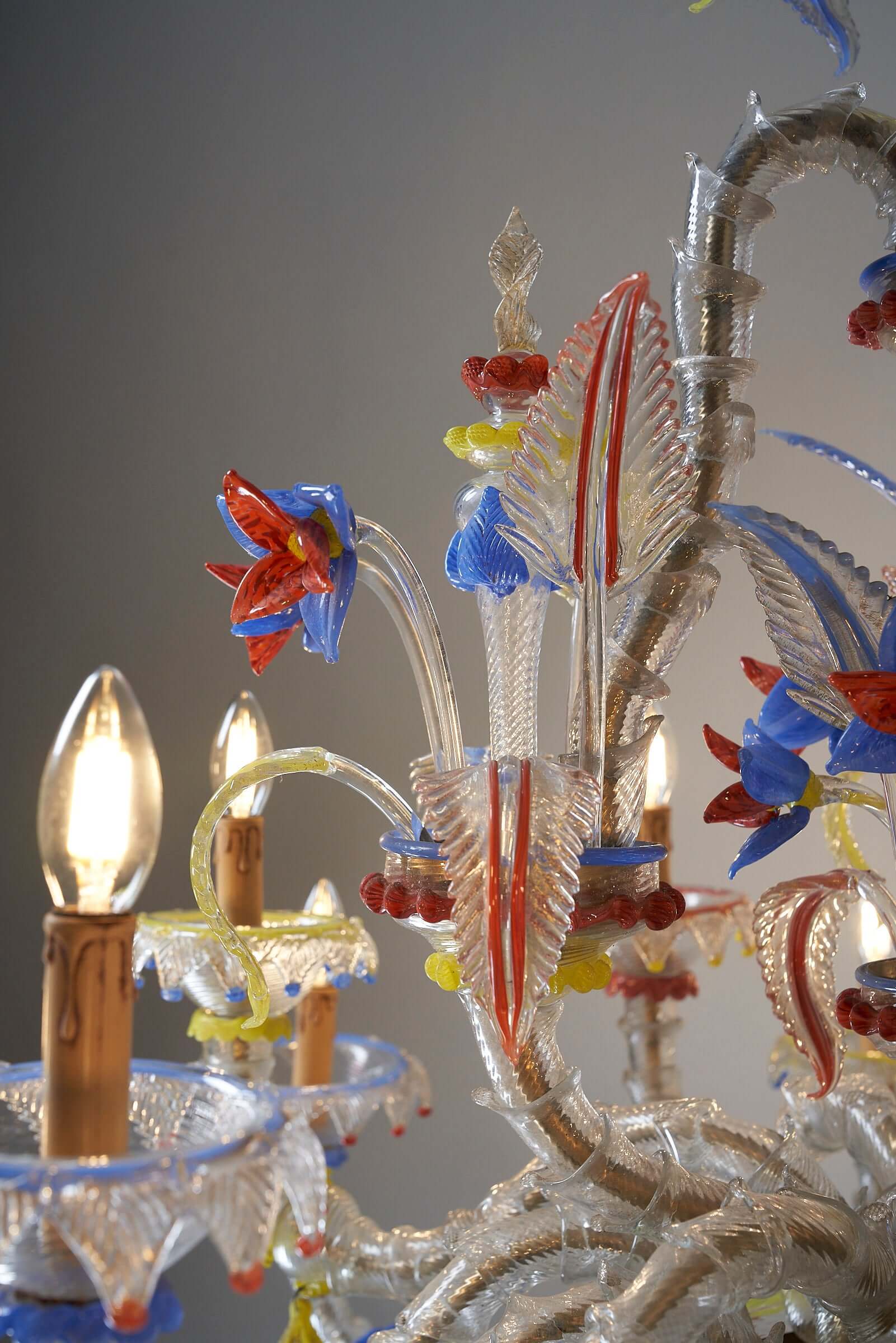 Le lustre est méticuleusement fabriqué à la main à partir de verre exquis, les principales pièces en verre présentant une combinaison étonnante de textures givrées. Les couleurs vibrantes du rouge, du jaune et du bleu sont incorporées de manière experte comme détails captivants dans tout le lustre, ajoutant un élément vibrant et dynamique à son design.