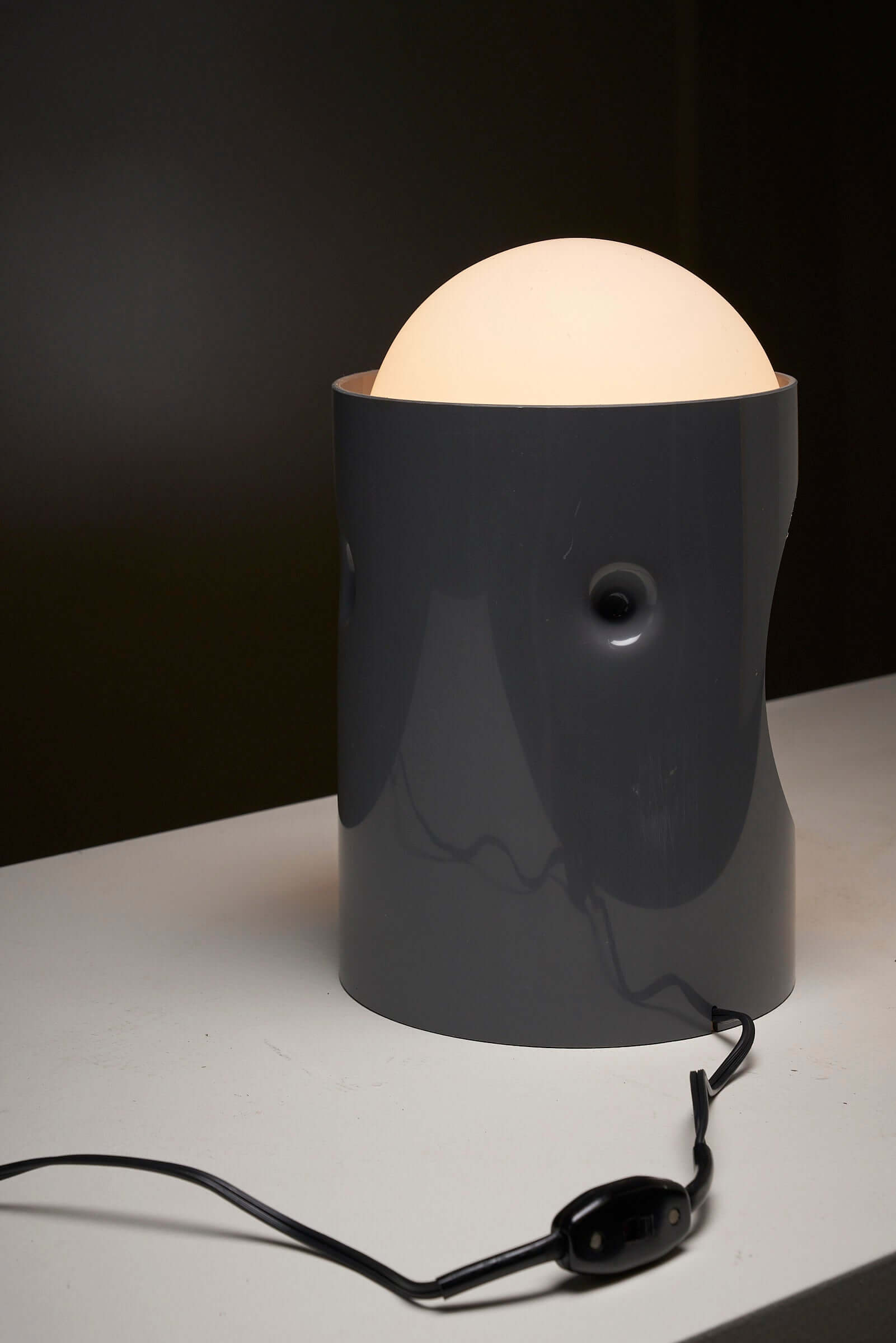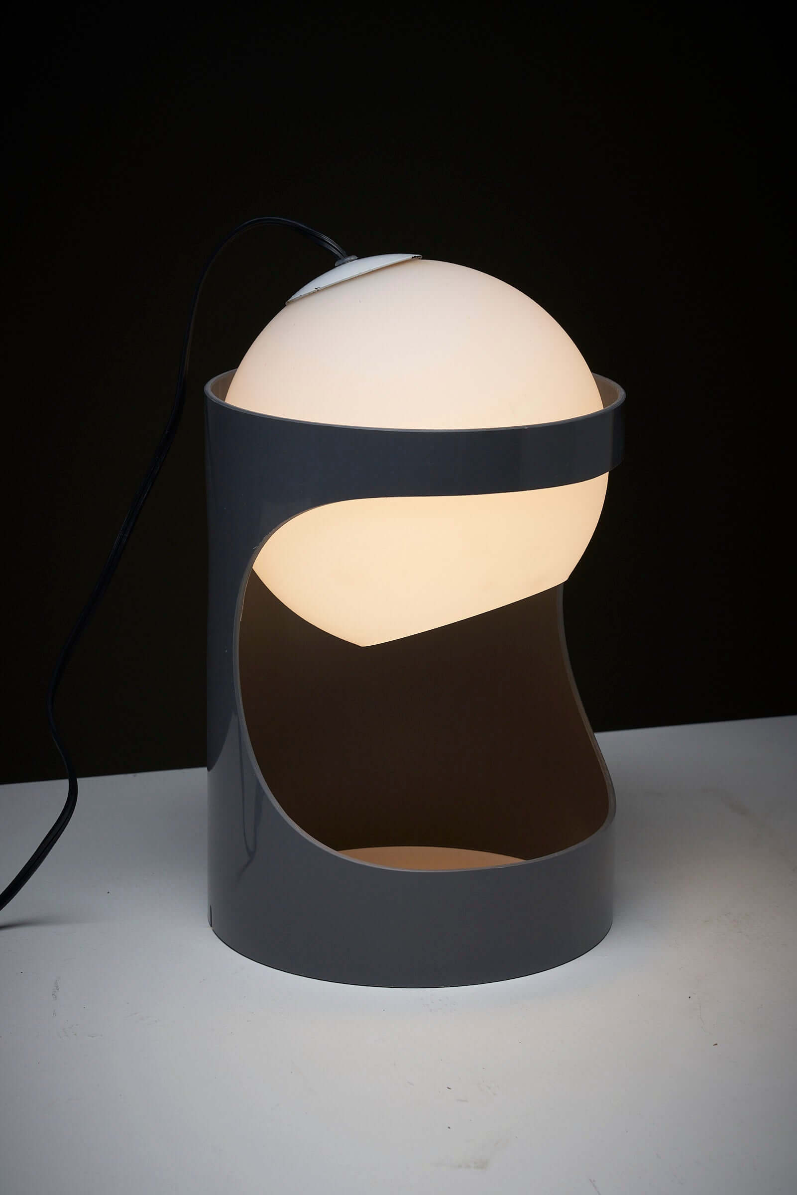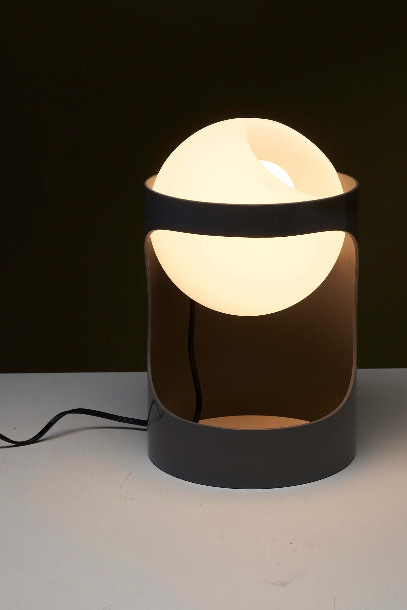 La lampe est dotée d'une base cylindrique en plexiglas gris, qui sert de base à son esthétique particulière. Ce qui distingue cette lampe est la découpe ronde sur le côté de la base et la sphère en verre placée à l'intérieur de la lampe, qui peut être tournée dans différentes directions, permettant des effets d'éclairage personnalisables.