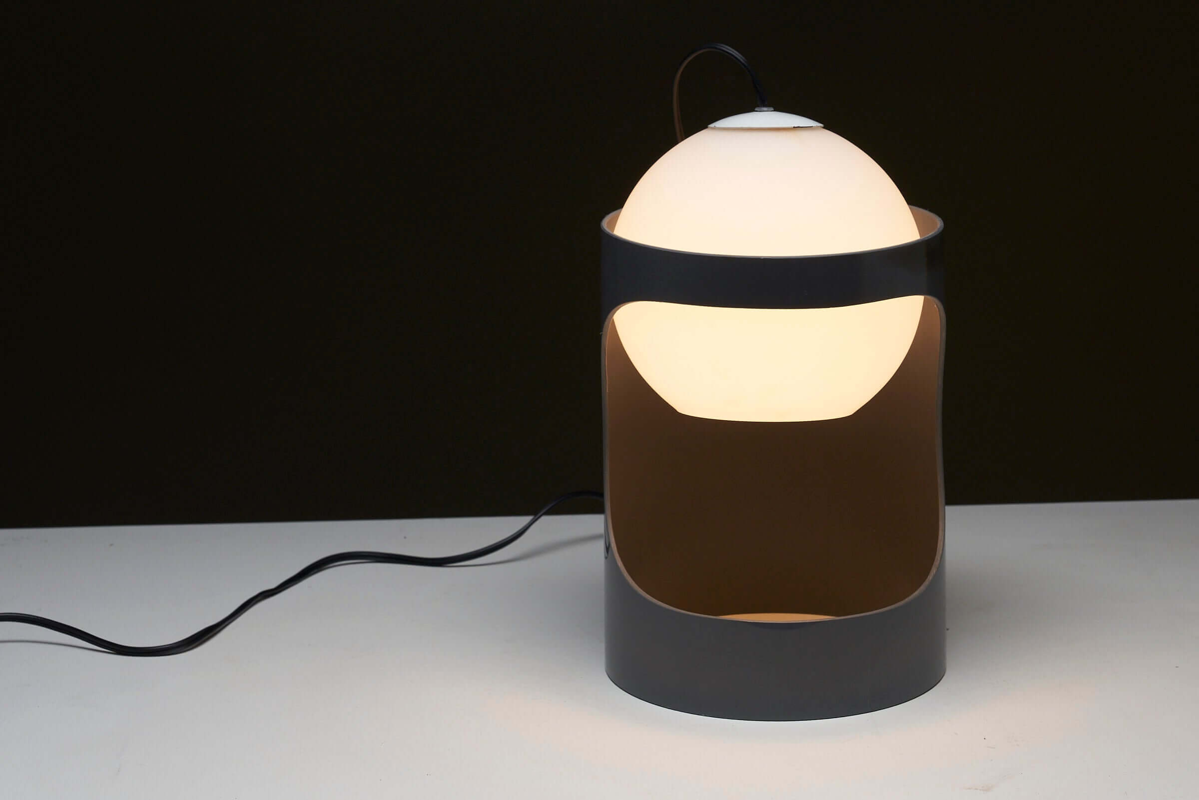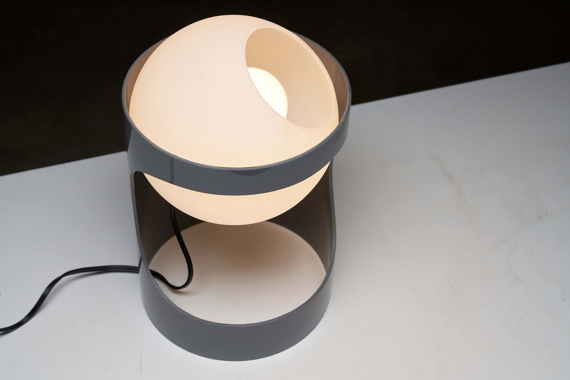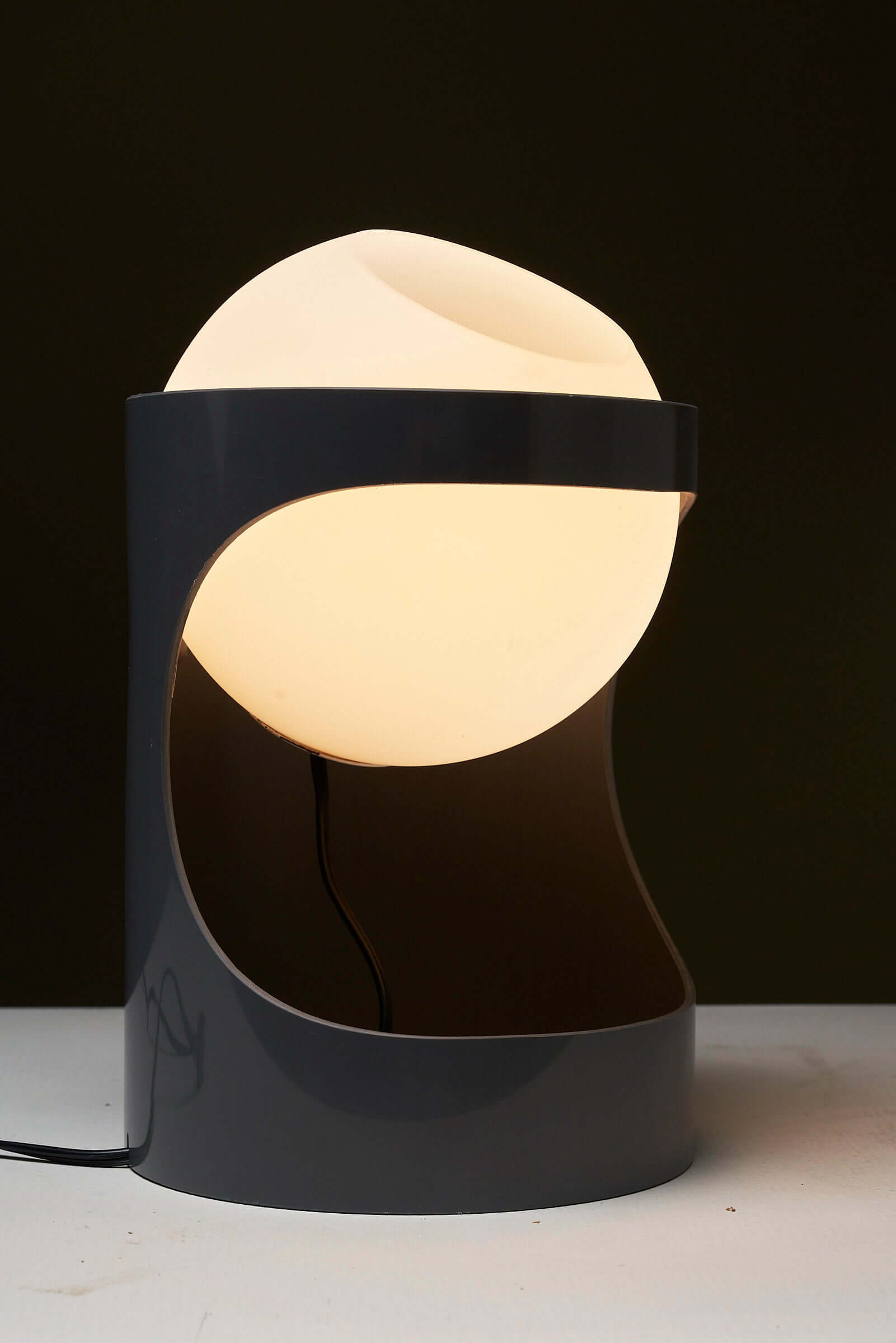La lampe est dotée d'une base cylindrique en plexiglas gris, qui sert de base à son esthétique particulière. Ce qui distingue cette lampe est la découpe ronde sur le côté de la base et la sphère en verre placée à l'intérieur de la lampe, qui peut être tournée dans différentes directions, permettant des effets d'éclairage personnalisables.