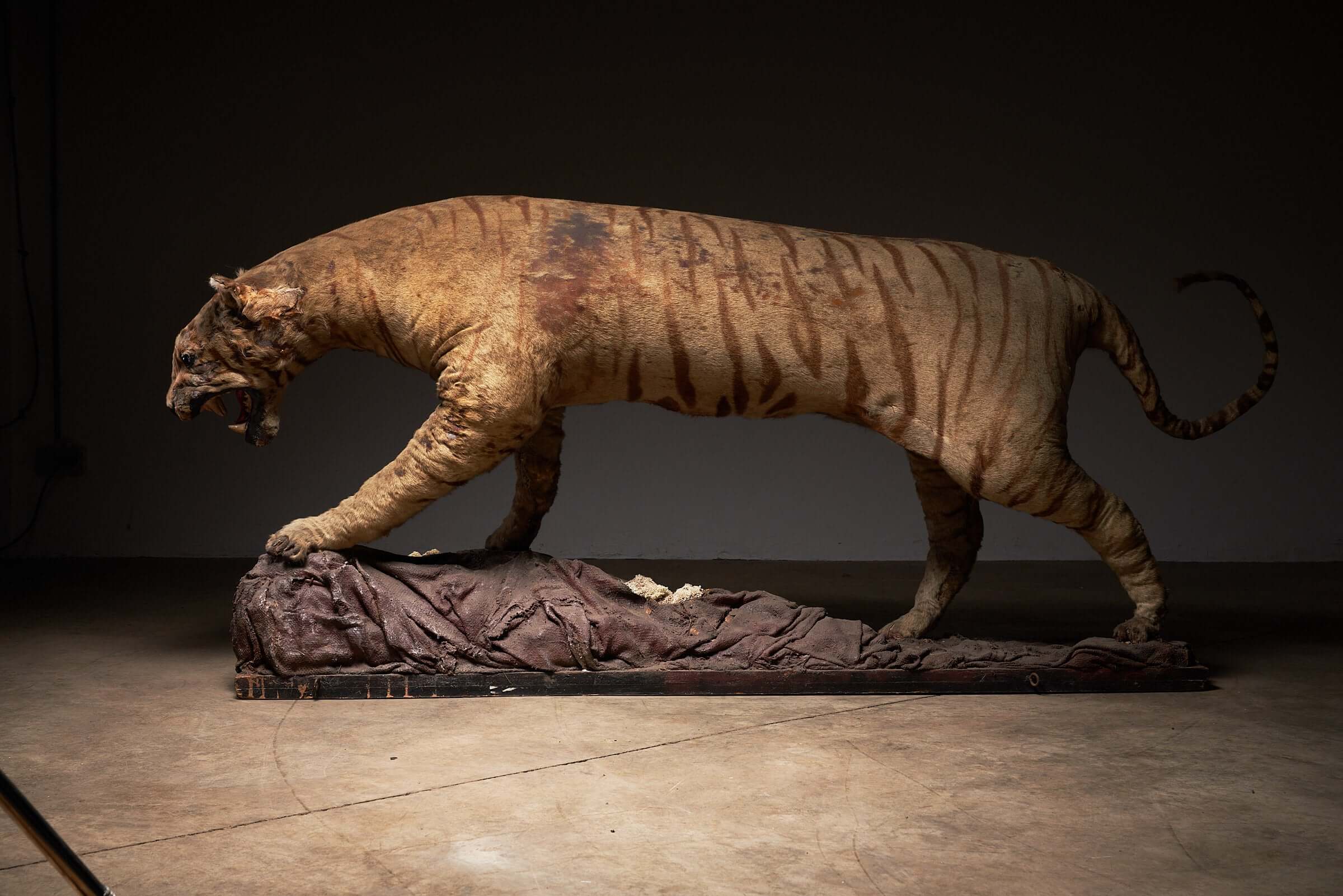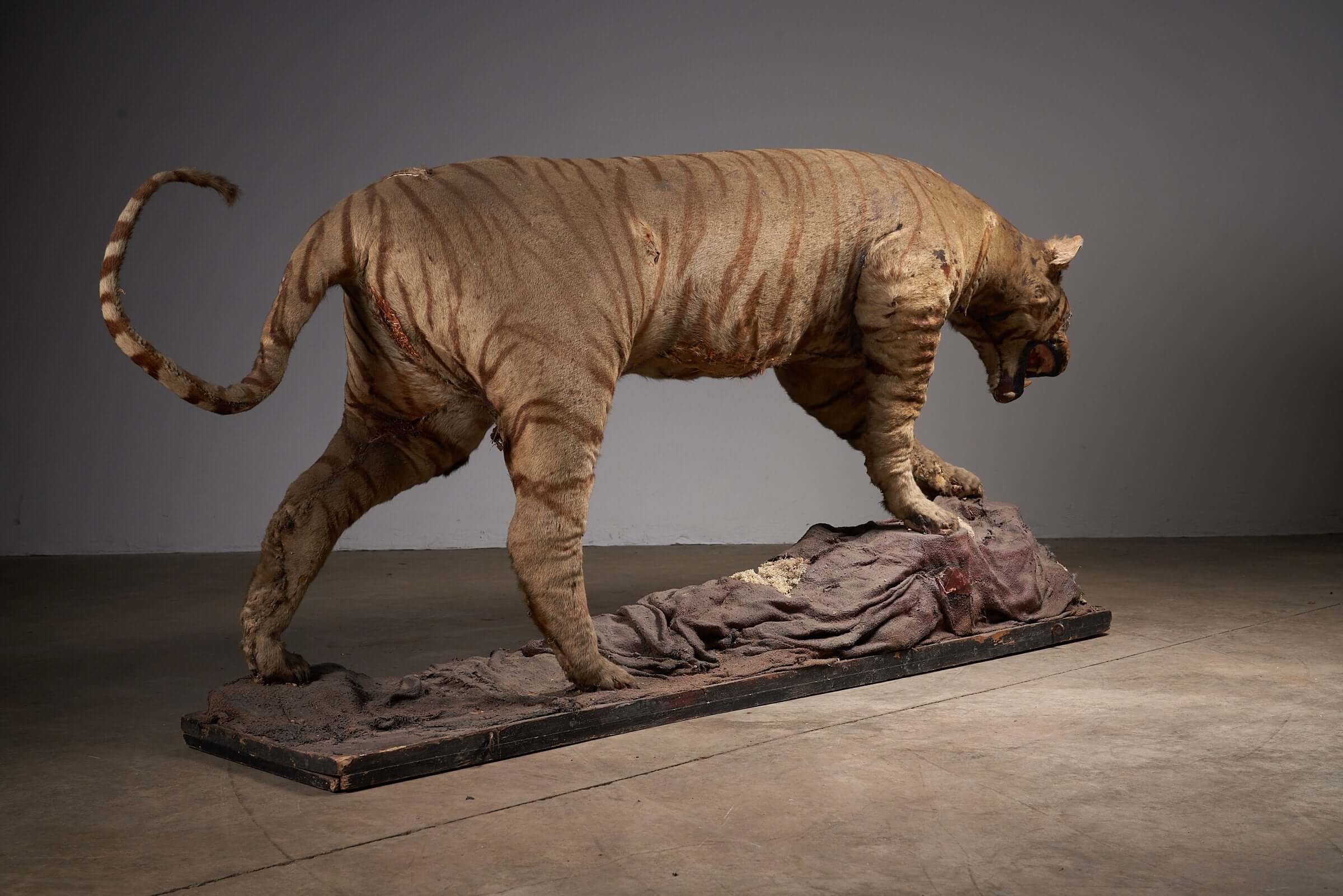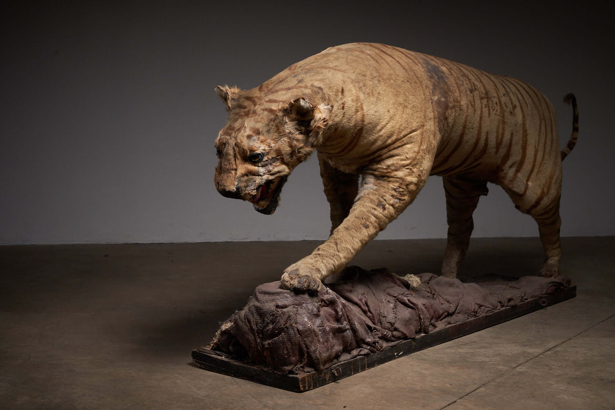 This striking antique taxidermy tiger display, dating back to the early 20th century, is a rare and captivating piece of natural history. The tiger, captured in a powerful stance over its prey, showcases the skill and artistry involved in taxidermy from this era. The aged fur and realistic details give the piece an authentic, timeworn appearance, evoking the raw power and majesty of the jungle. This taxidermy display is not just a decorative object; it is a snapshot of nature, frozen in time, offering a unique focal point for any collection or space dedicated to the wonders of the animal kingdom. Ideal for museums, collectors, or enthusiasts of antique taxidermy, this piece tells a story of survival and the wild, bringing an element of the untamed into your environment.