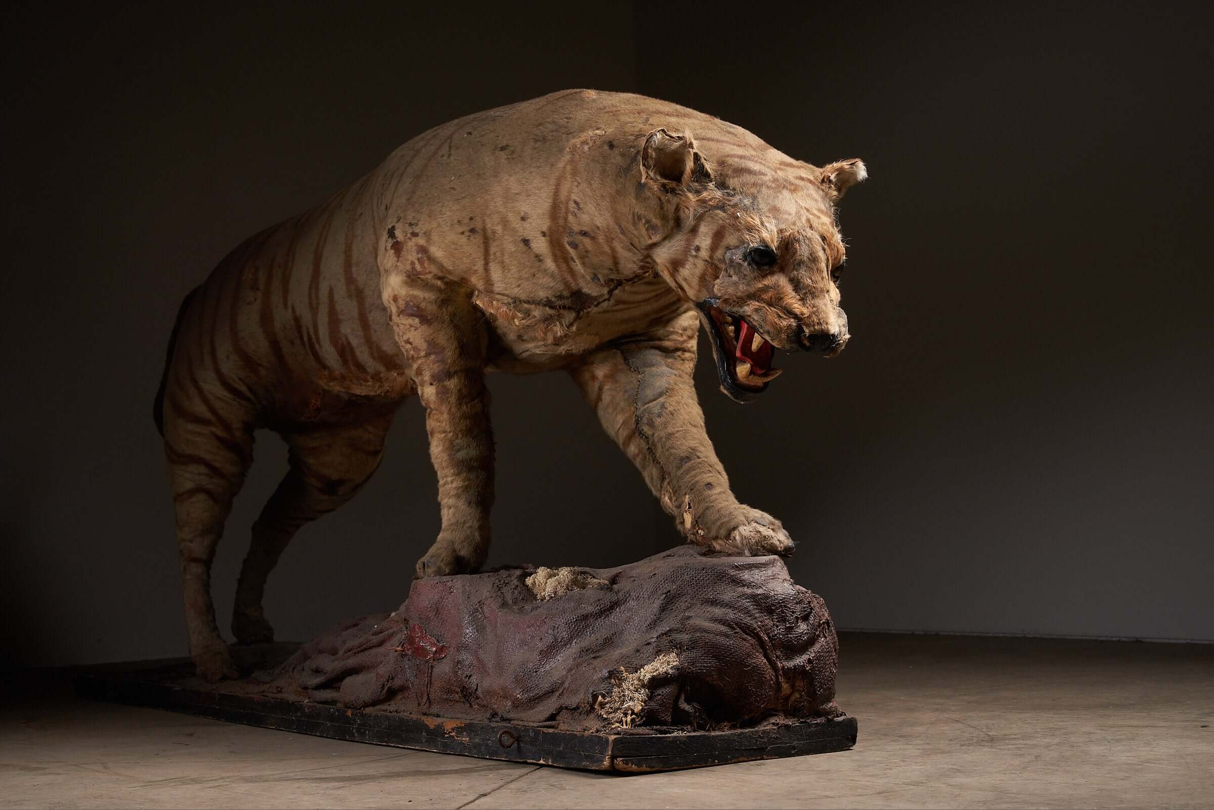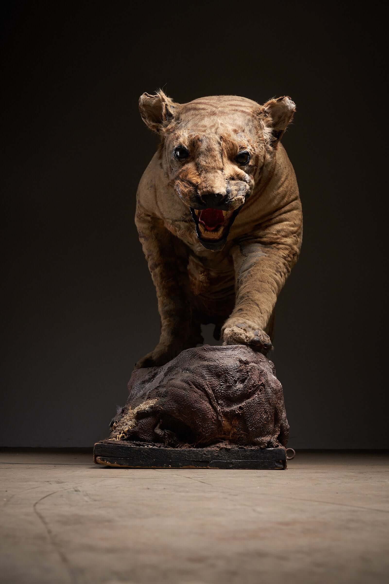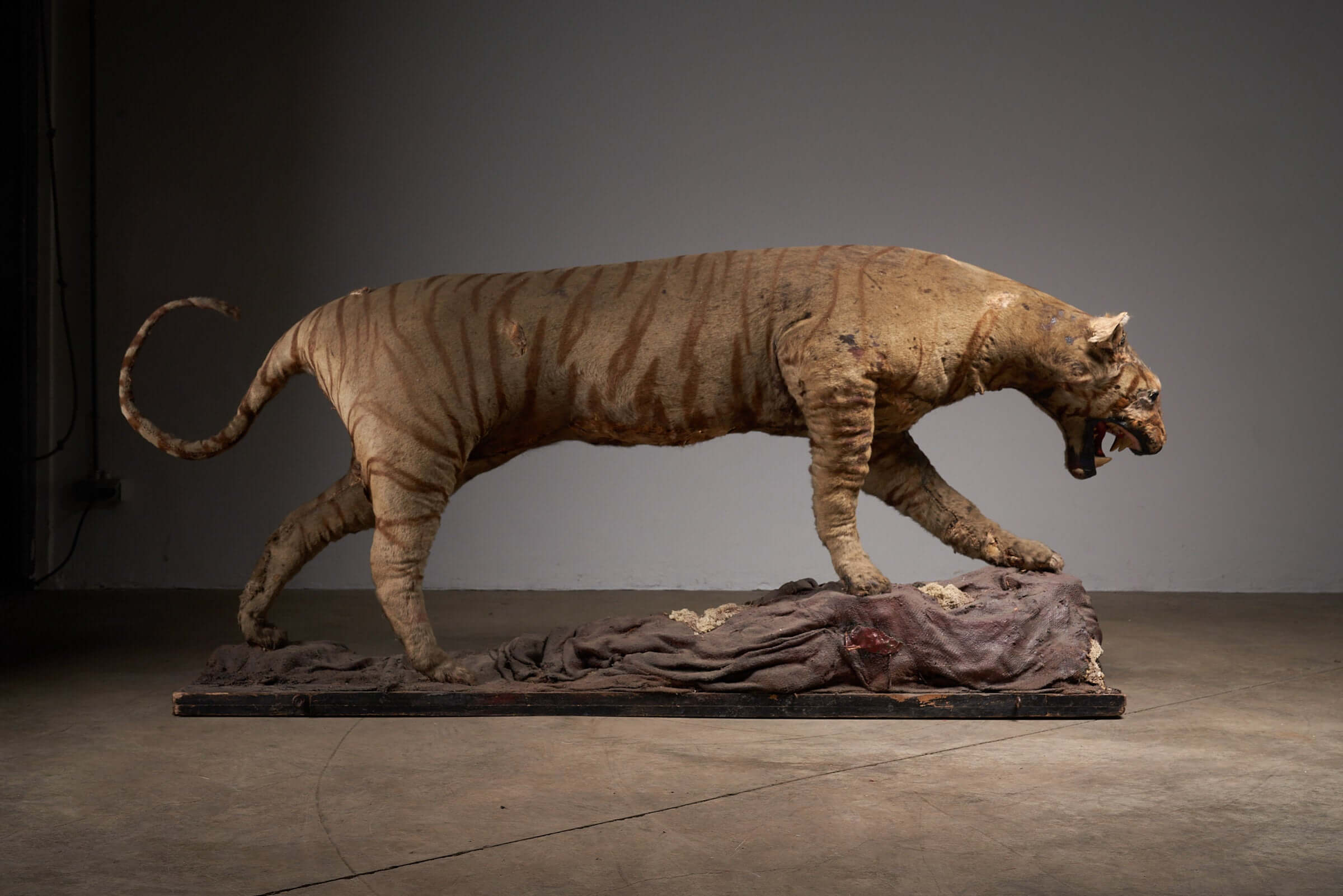 This striking antique taxidermy tiger display, dating back to the early 20th century, is a rare and captivating piece of natural history. The tiger, captured in a powerful stance over its prey, showcases the skill and artistry involved in taxidermy from this era. The aged fur and realistic details give the piece an authentic, timeworn appearance, evoking the raw power and majesty of the jungle. This taxidermy display is not just a decorative object; it is a snapshot of nature, frozen in time, offering a unique focal point for any collection or space dedicated to the wonders of the animal kingdom. Ideal for museums, collectors, or enthusiasts of antique taxidermy, this piece tells a story of survival and the wild, bringing an element of the untamed into your environment.