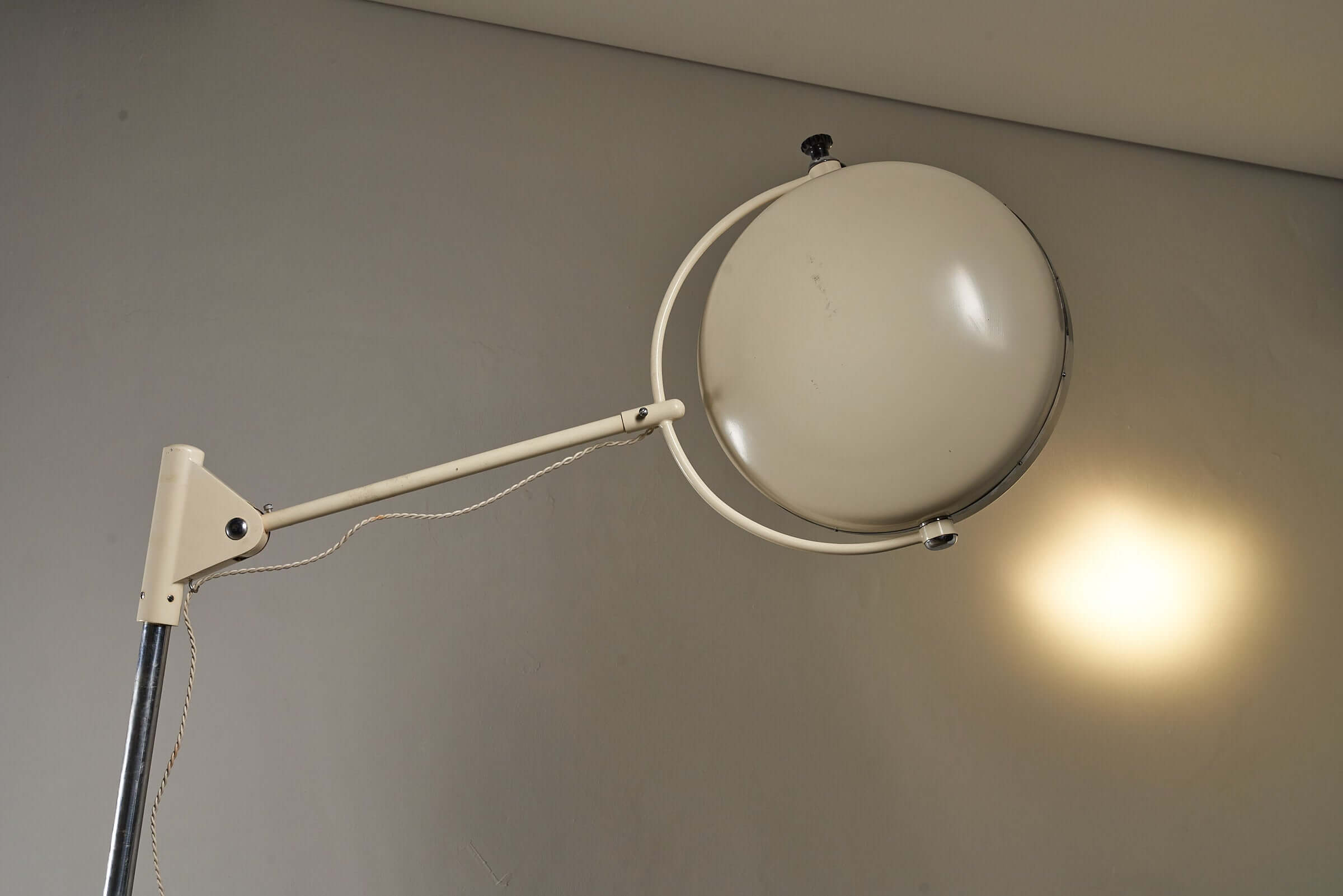 Vintage medical floor lamp with adjustable arm and original crate in an industrial setting, ideal for man cave or loft vibes.