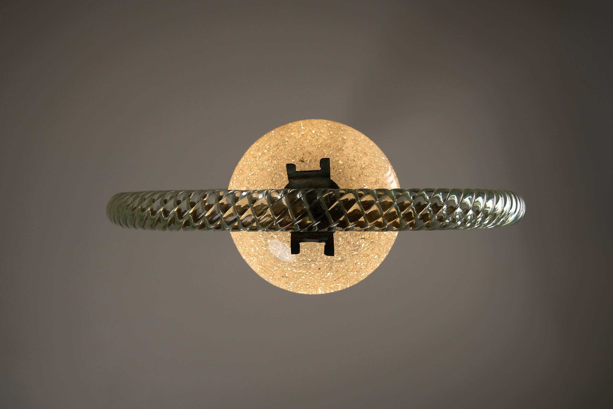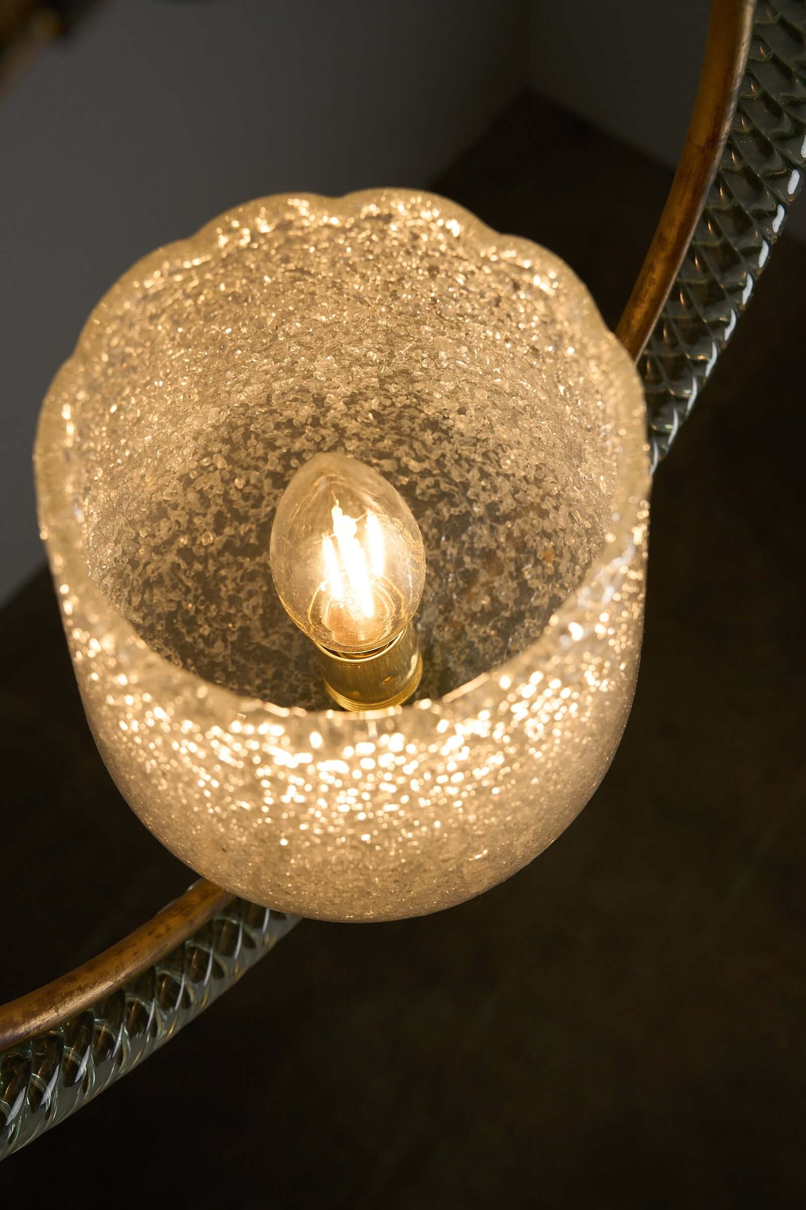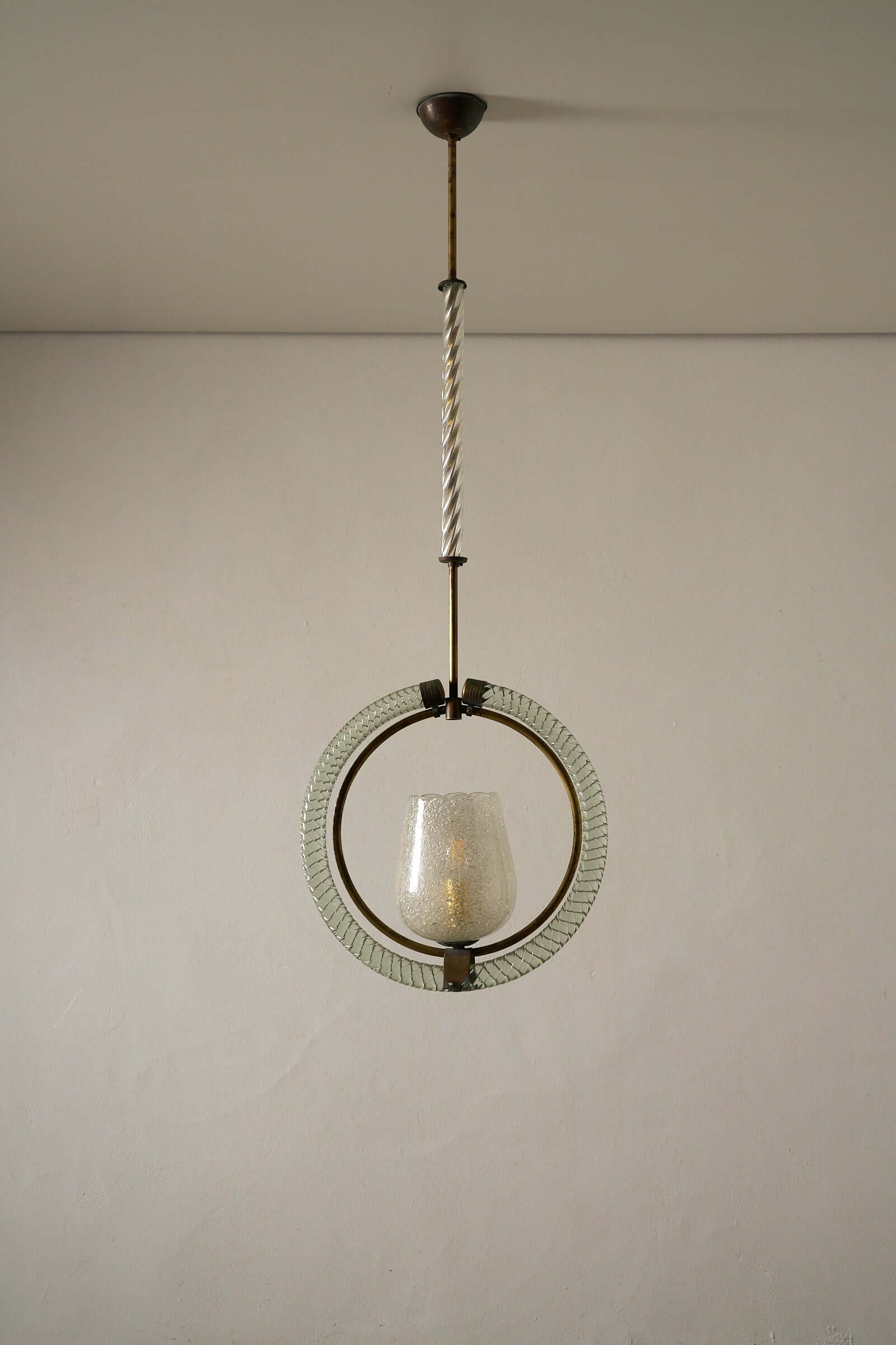 This elegant chandelier is an exquisite piece from the 1930s, designed by Barovier & Toso. The chandelier is crafted from high-quality Murano glass and features brass details, offering a timeless and luxurious appeal. Its circular design showcases a solid glass ring and a beautifully textured glass shade that casts a warm and inviting glow. Fully rewired and ready to grace any interior, this piece is a beautiful representation of vintage Italian craftsmanship. Its sophisticated combination of Murano glass and brass makes it a versatile addition to various interior styles, from classic to contemporary.