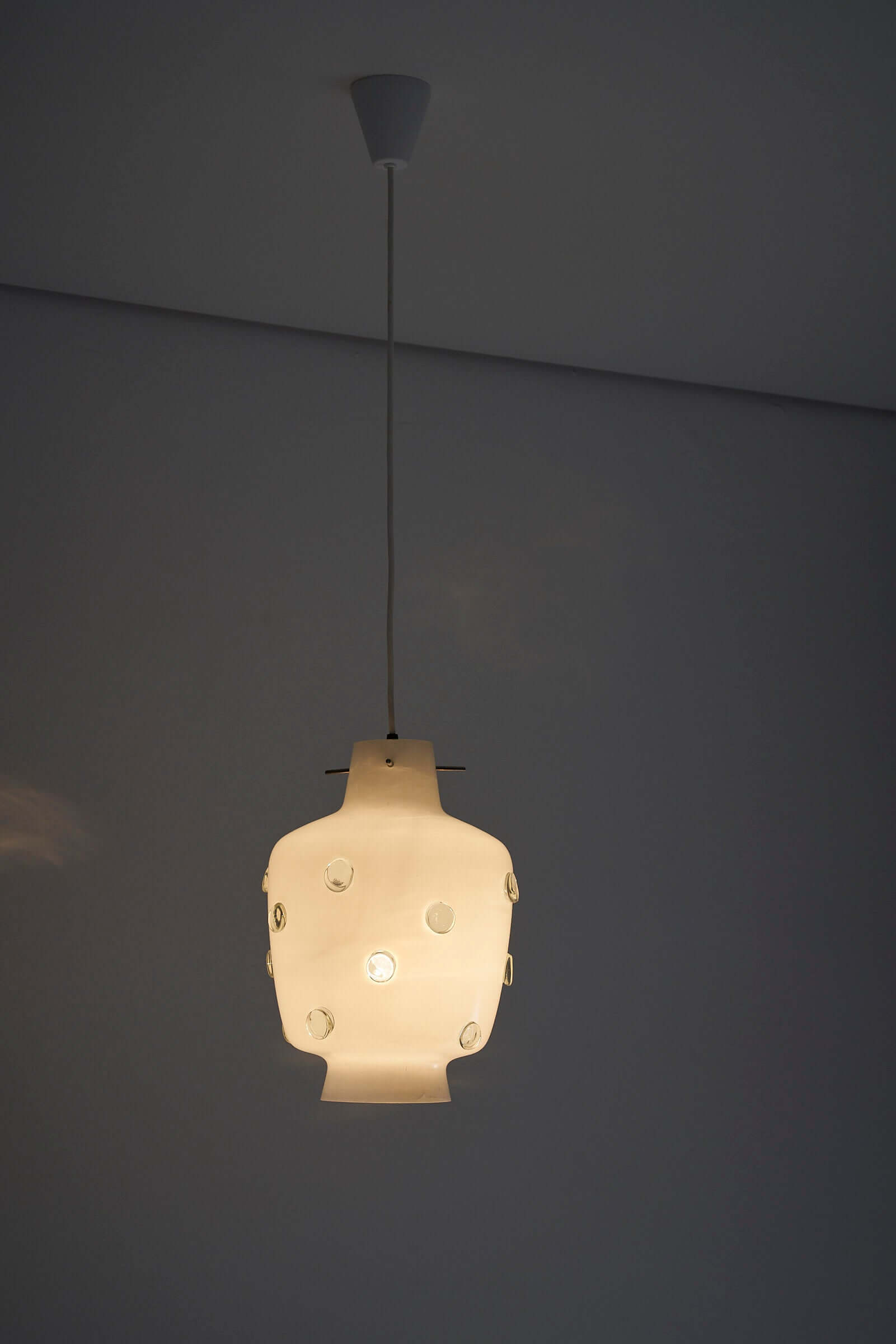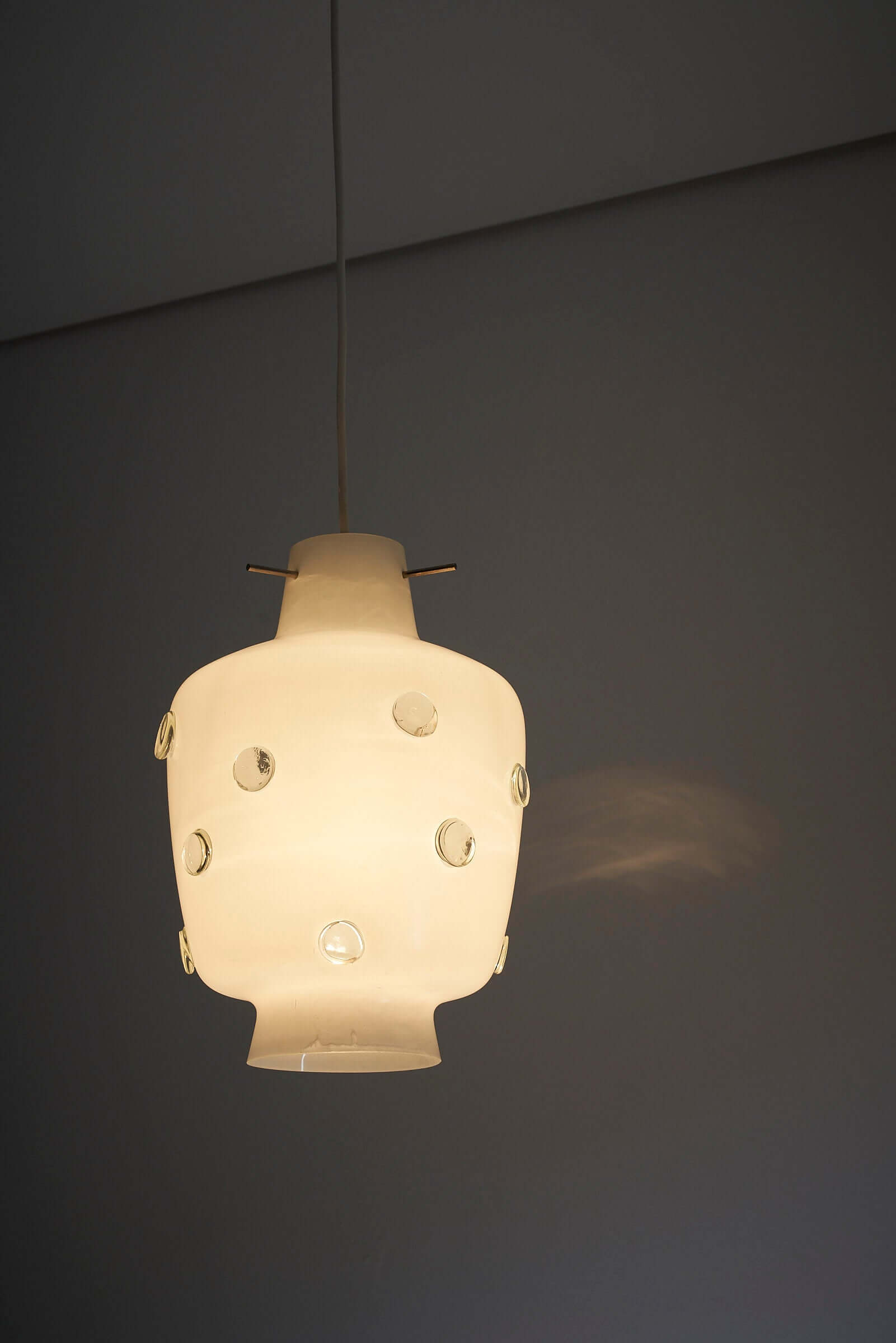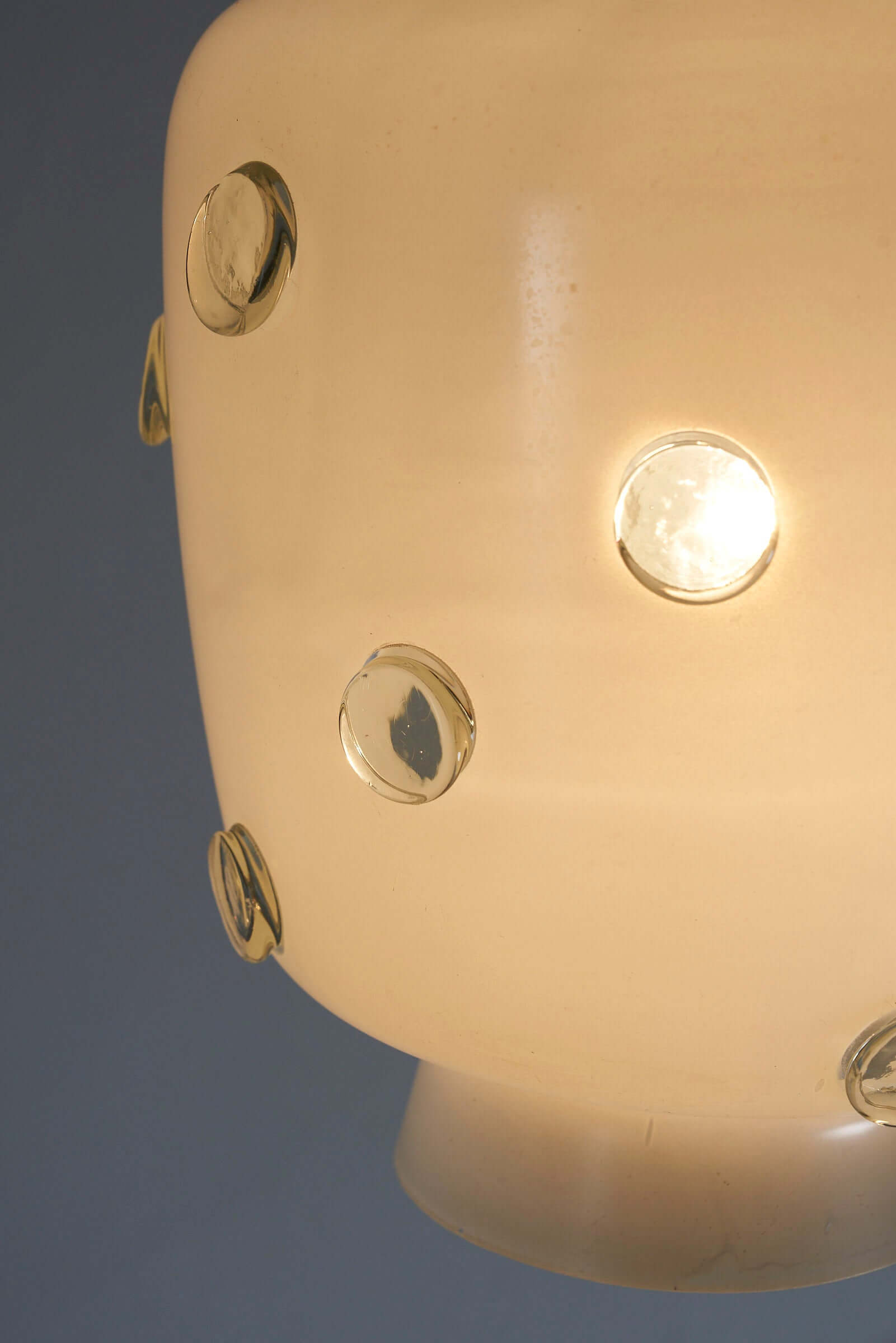 Immerse yourself in the enchanting beauty of this Murano glass pendant by Vistosi. Crafted with meticulous artistry, it showcases a captivating design that will leave you in awe. The pendant features an organically shaped white glass form, exuding elegance and grace. What sets it apart are the meticulously placed clear glass dots that adorn the surface, adding a touch of whimsy and charm.