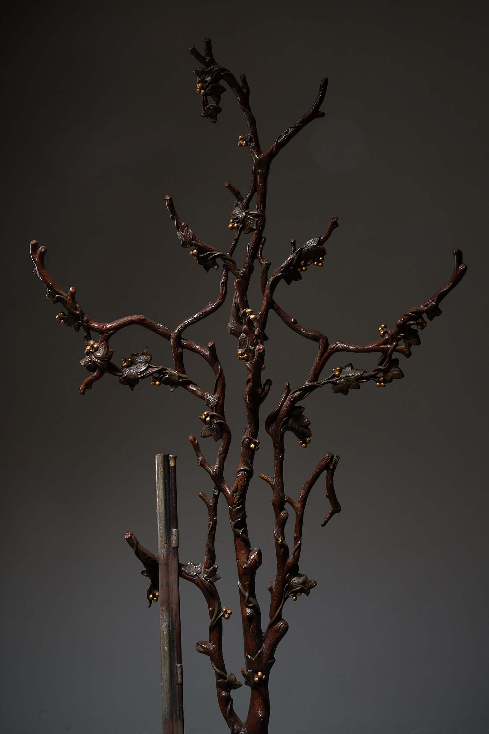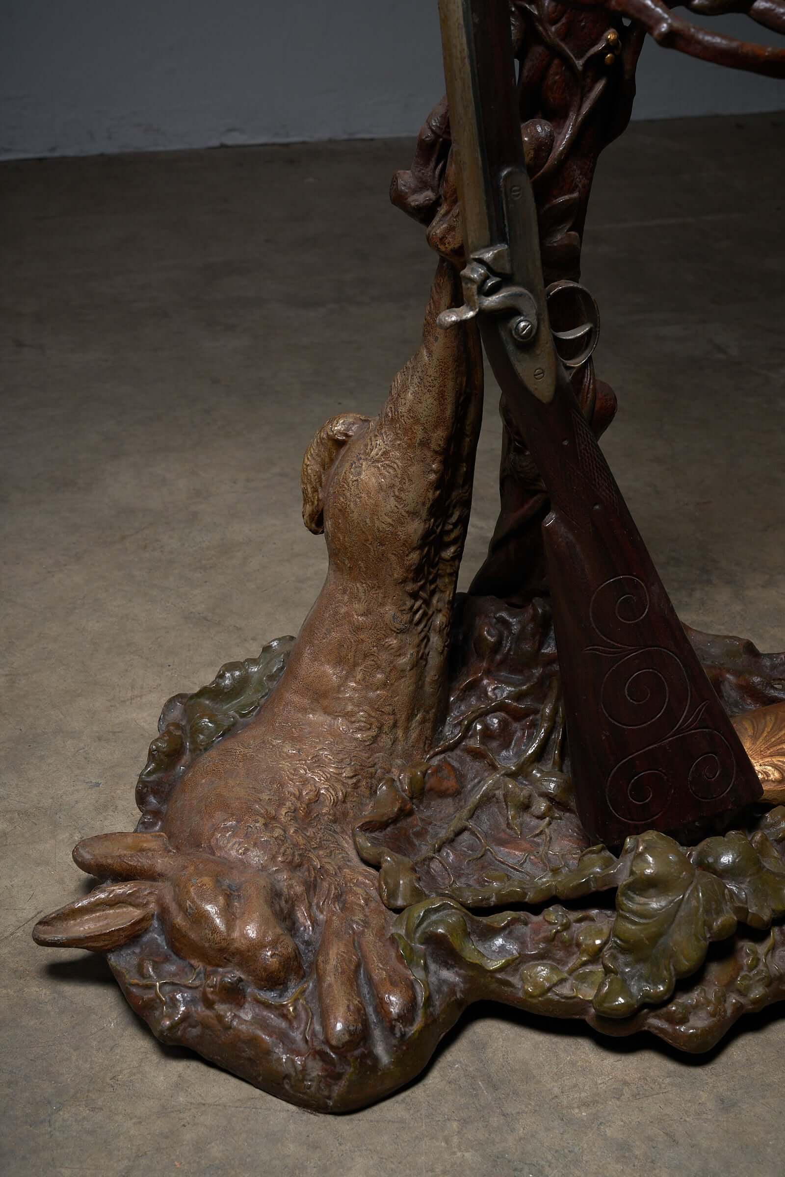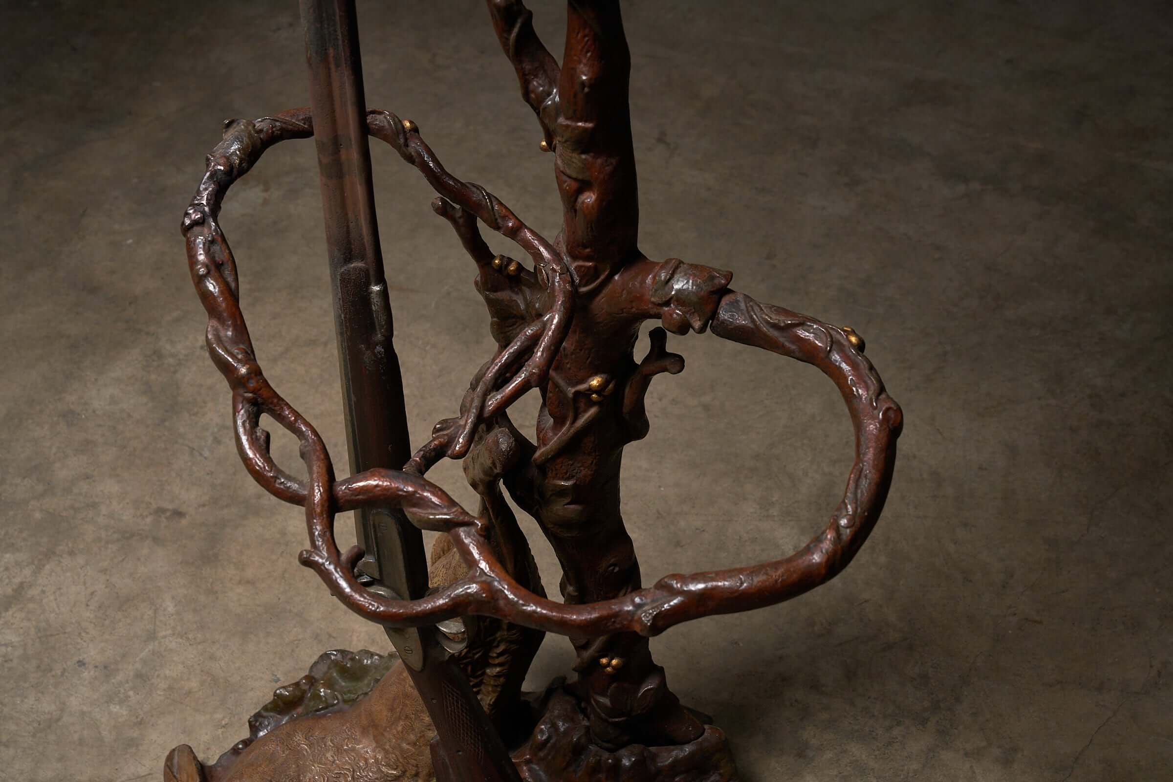 This intricate iron hallway piece is a stunning example of craftsmanship, featuring a hunting theme with detailed elements such as rifles and animal figures. The piece is finished in rich brown tones with gold accents, adding an elegant and rustic touch to any hallway or entryway. The sculptural design mimics the natural forms of branches and roots, making it both functional and decorative. This unique hallway piece is perfect for adding a touch of character to your home, whether placed in a traditional or eclectic interior.