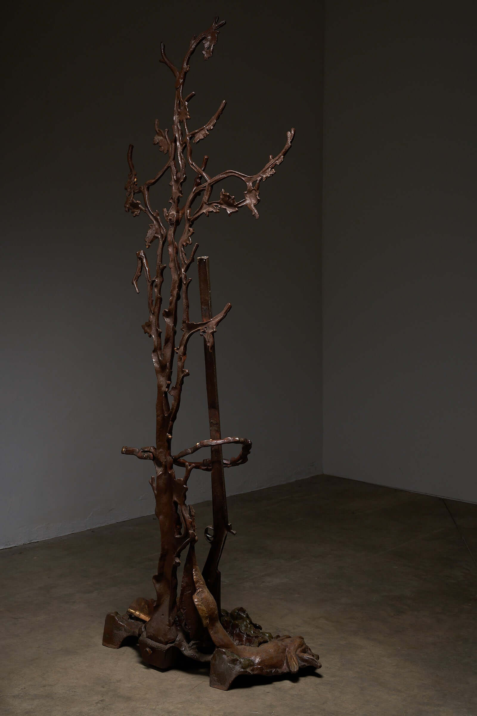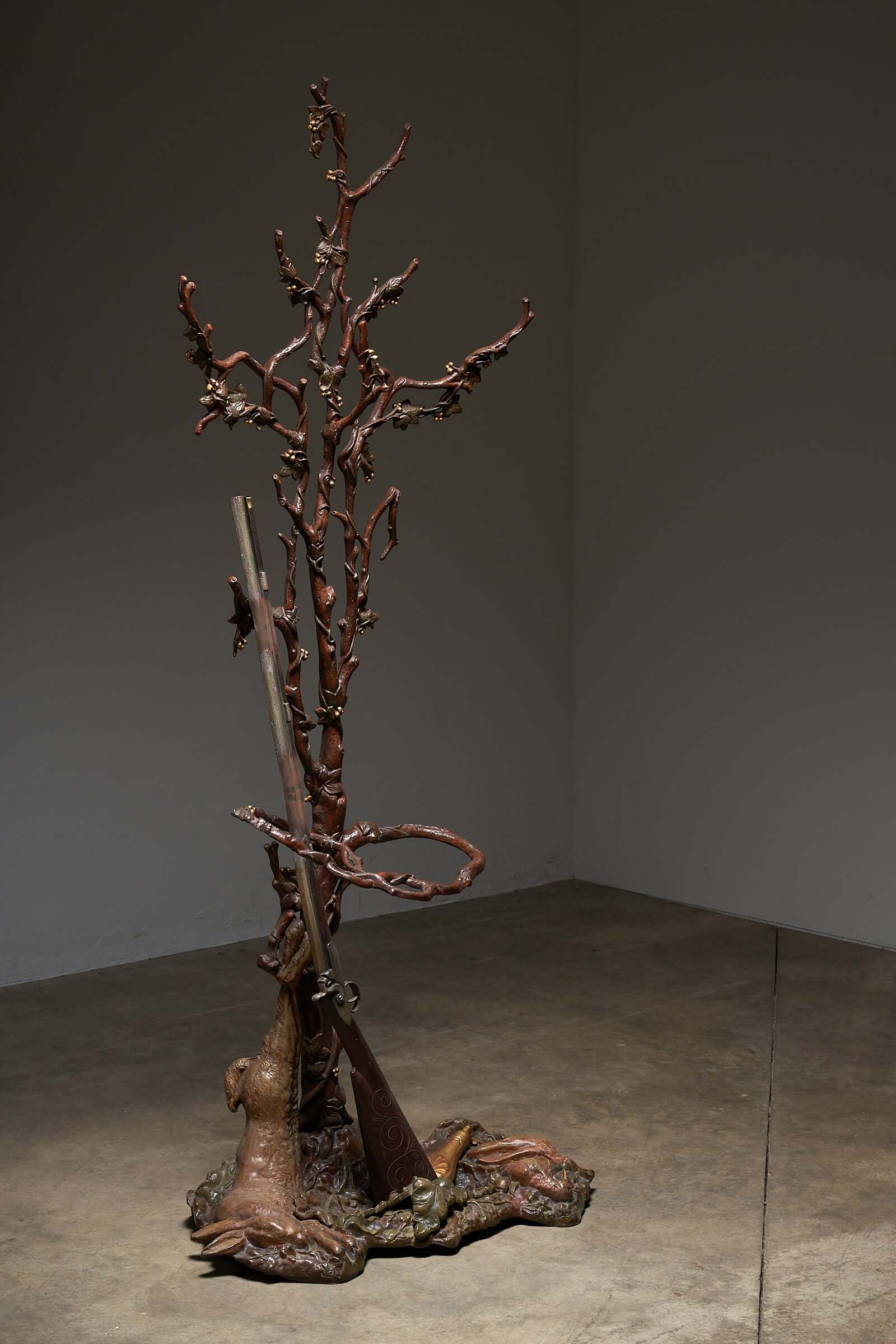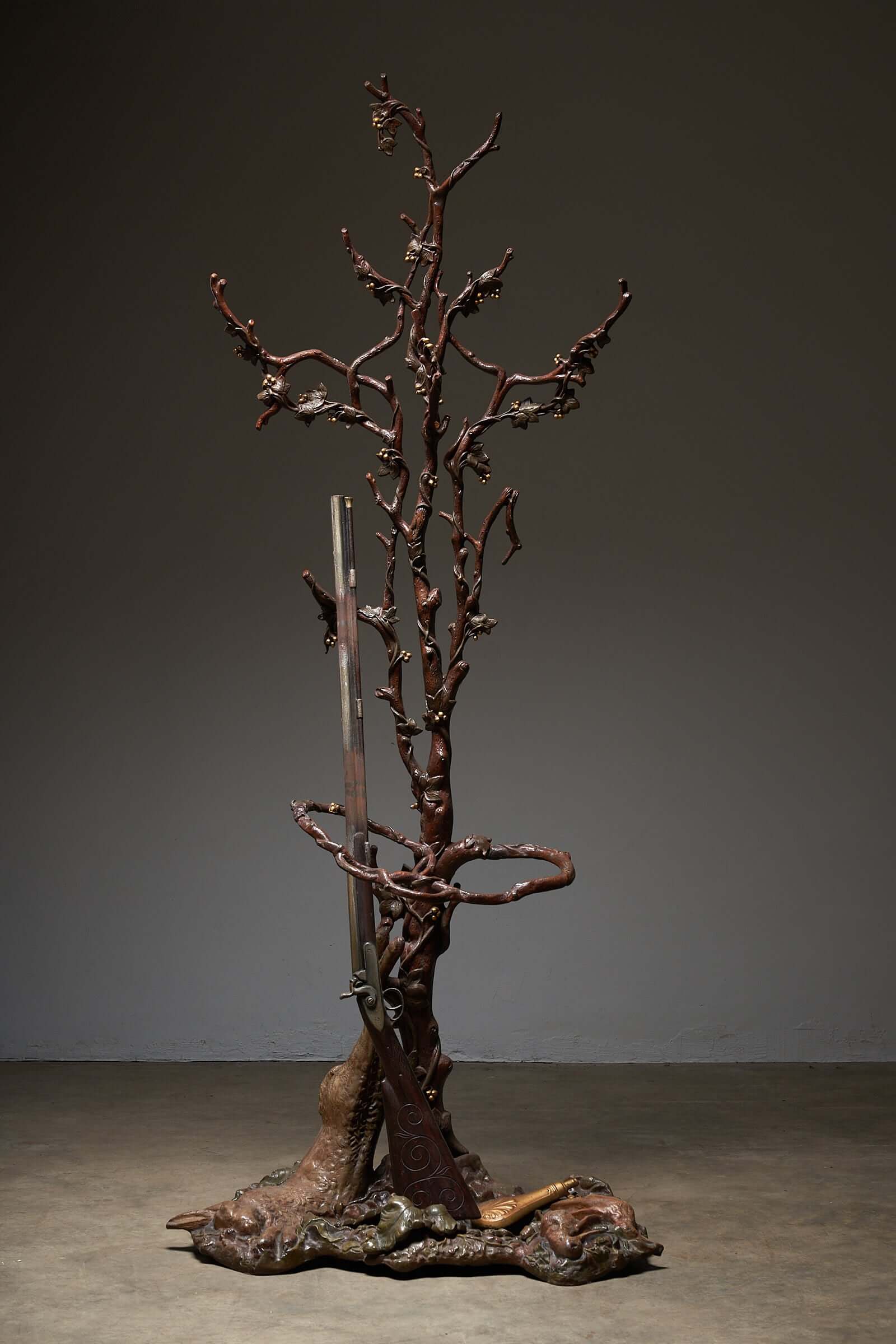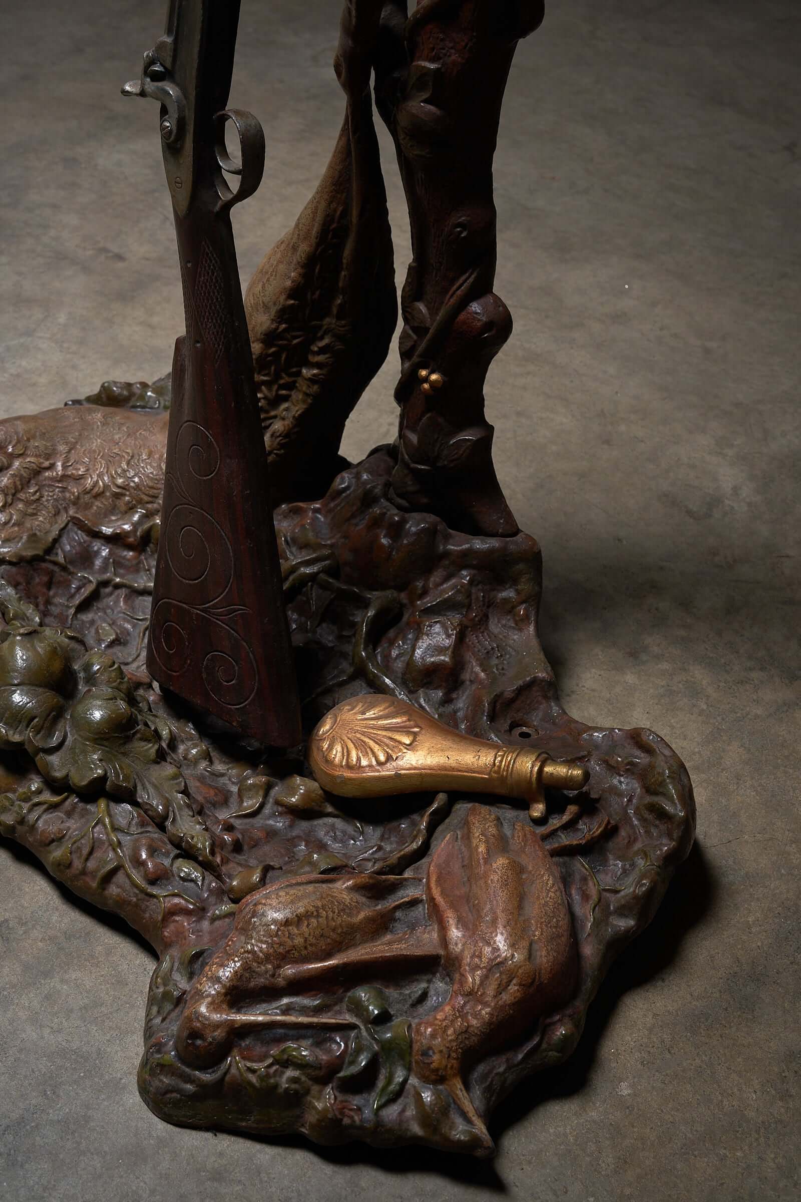 This intricate iron hallway piece is a stunning example of craftsmanship, featuring a hunting theme with detailed elements such as rifles and animal figures. The piece is finished in rich brown tones with gold accents, adding an elegant and rustic touch to any hallway or entryway. The sculptural design mimics the natural forms of branches and roots, making it both functional and decorative. This unique hallway piece is perfect for adding a touch of character to your home, whether placed in a traditional or eclectic interior.