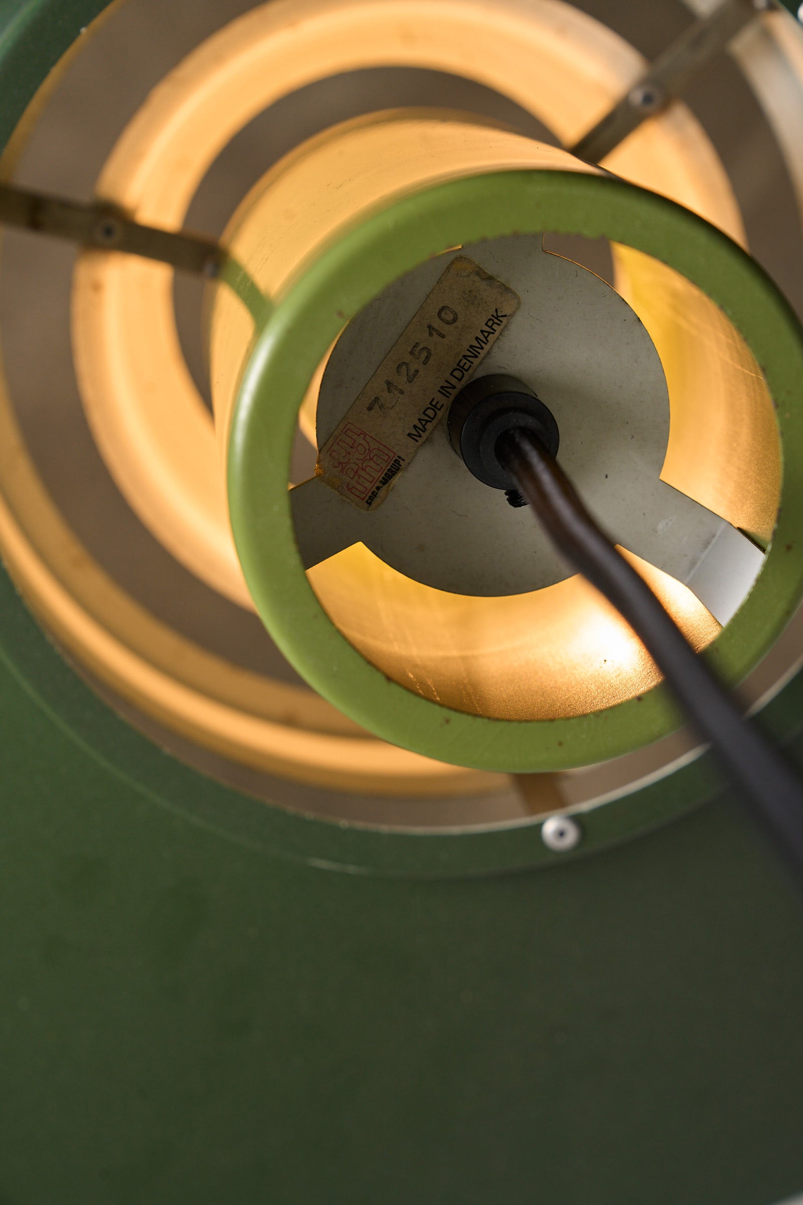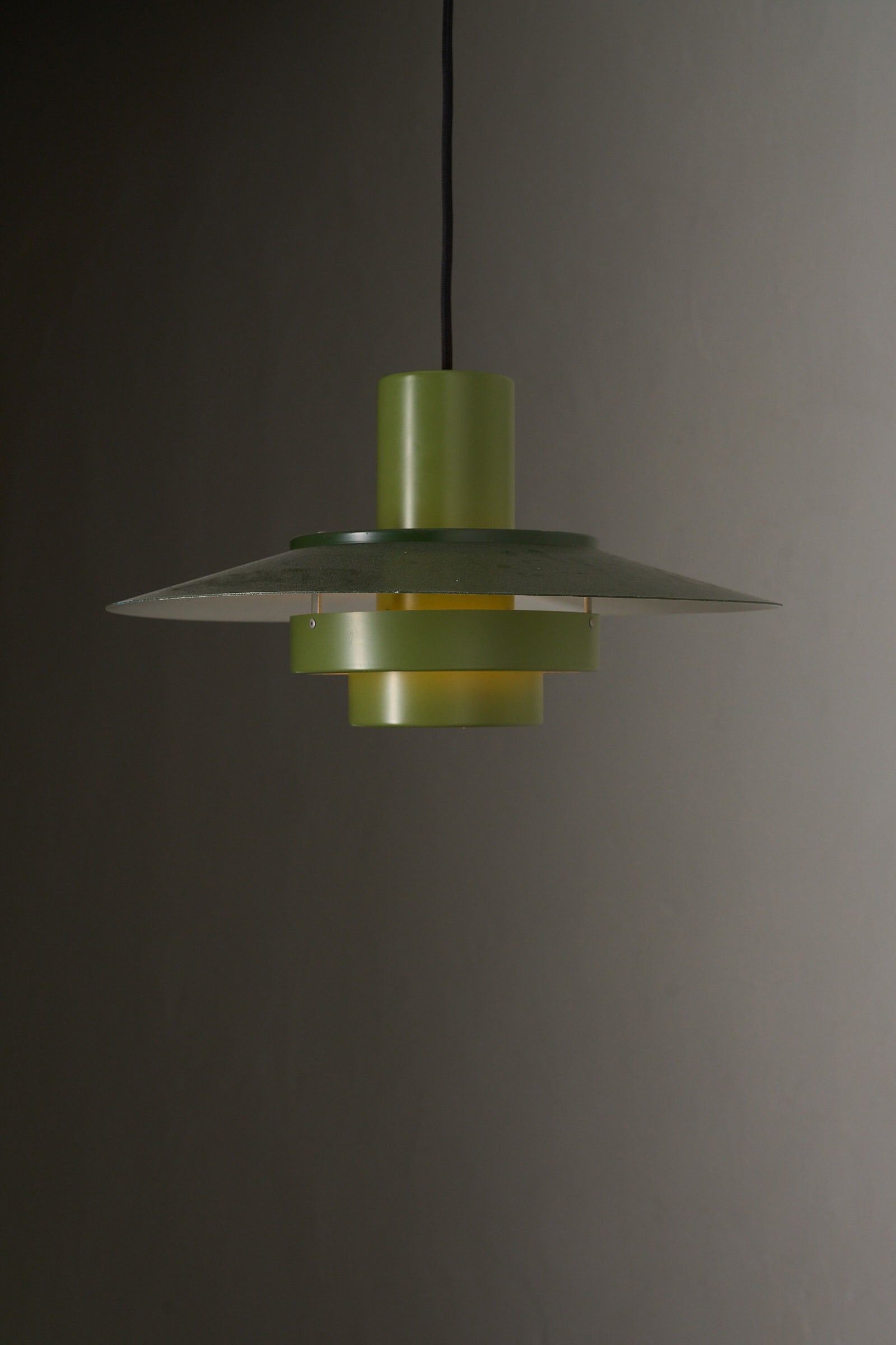 The lamp features a layered aluminum shade, lacquered in a deep matte green finish. The design consists of a wide outer dome and an inner reflector that diffuses the light softly downwards, creating a warm and ambient glow. This clever composition eliminates glare while highlighting the lamp’s floating, architectural form.